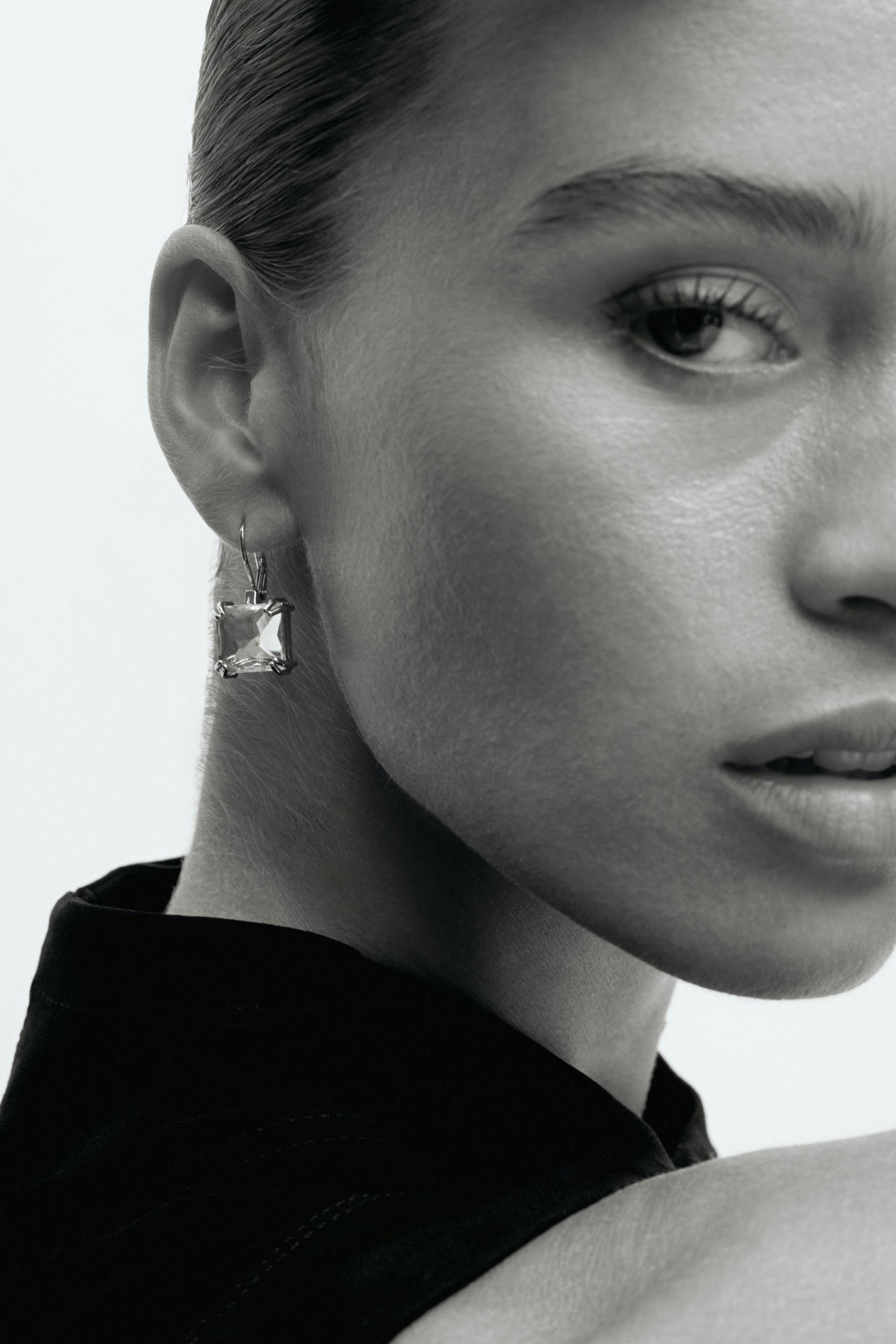 Örhängen med en stor, fyrkantig sten. Nitarna är guldfärgade.
