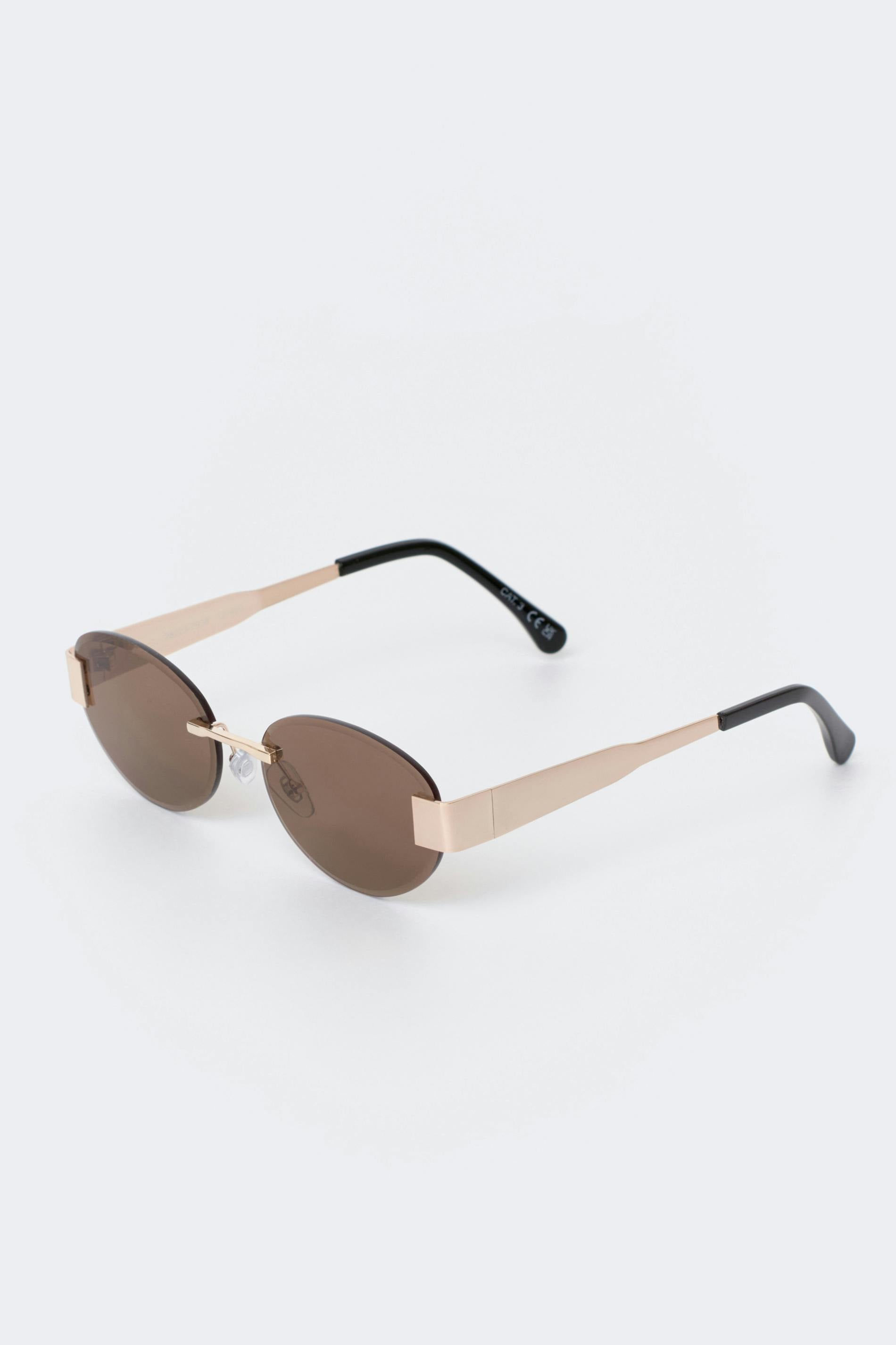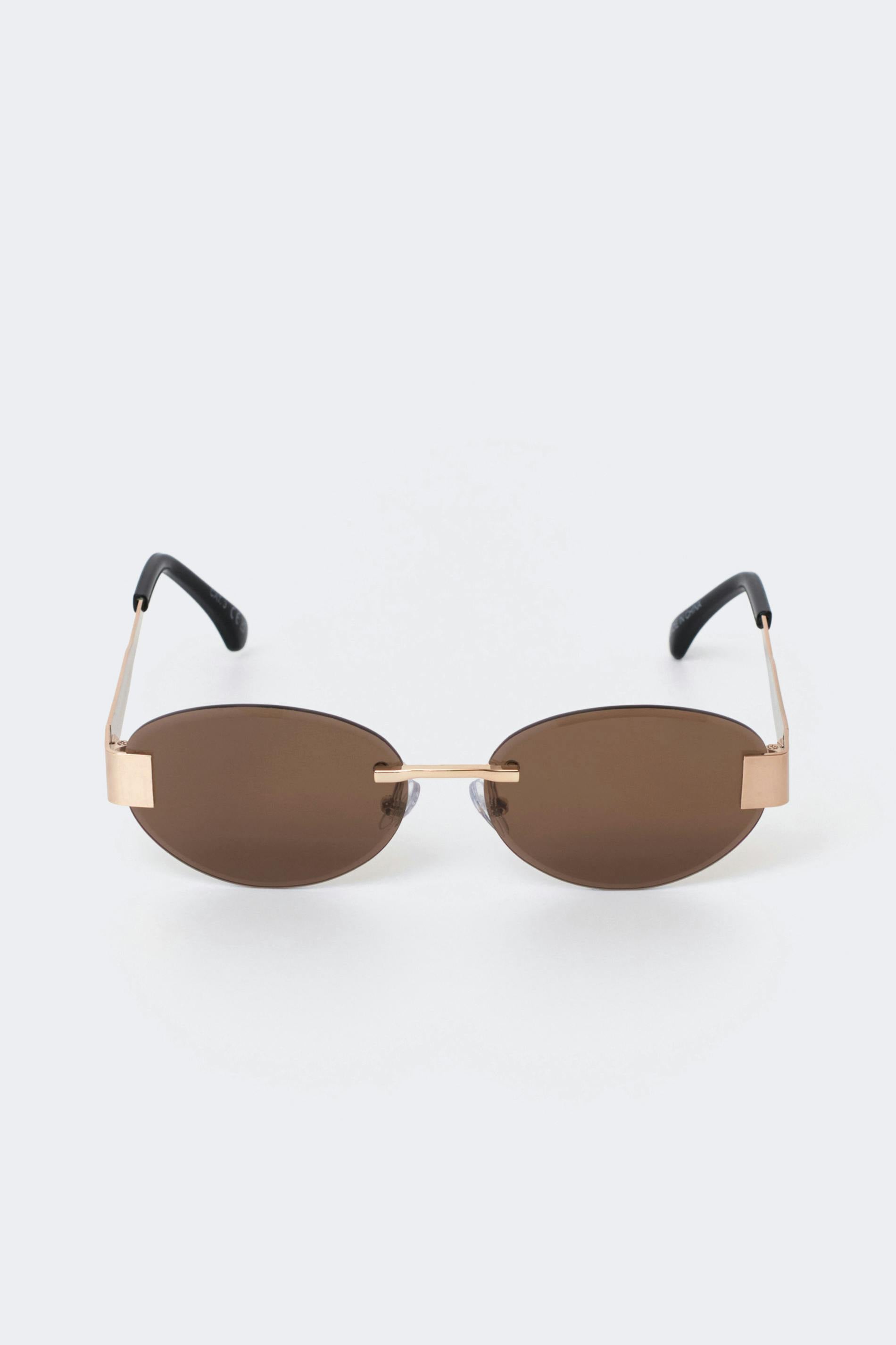 Ovala solglasögon utan ram med guldfärgade, breda metallskalmar. Solglasögonen är bruna och har reglerbara nässadlar. De har tonade glas med UV400-skydd.