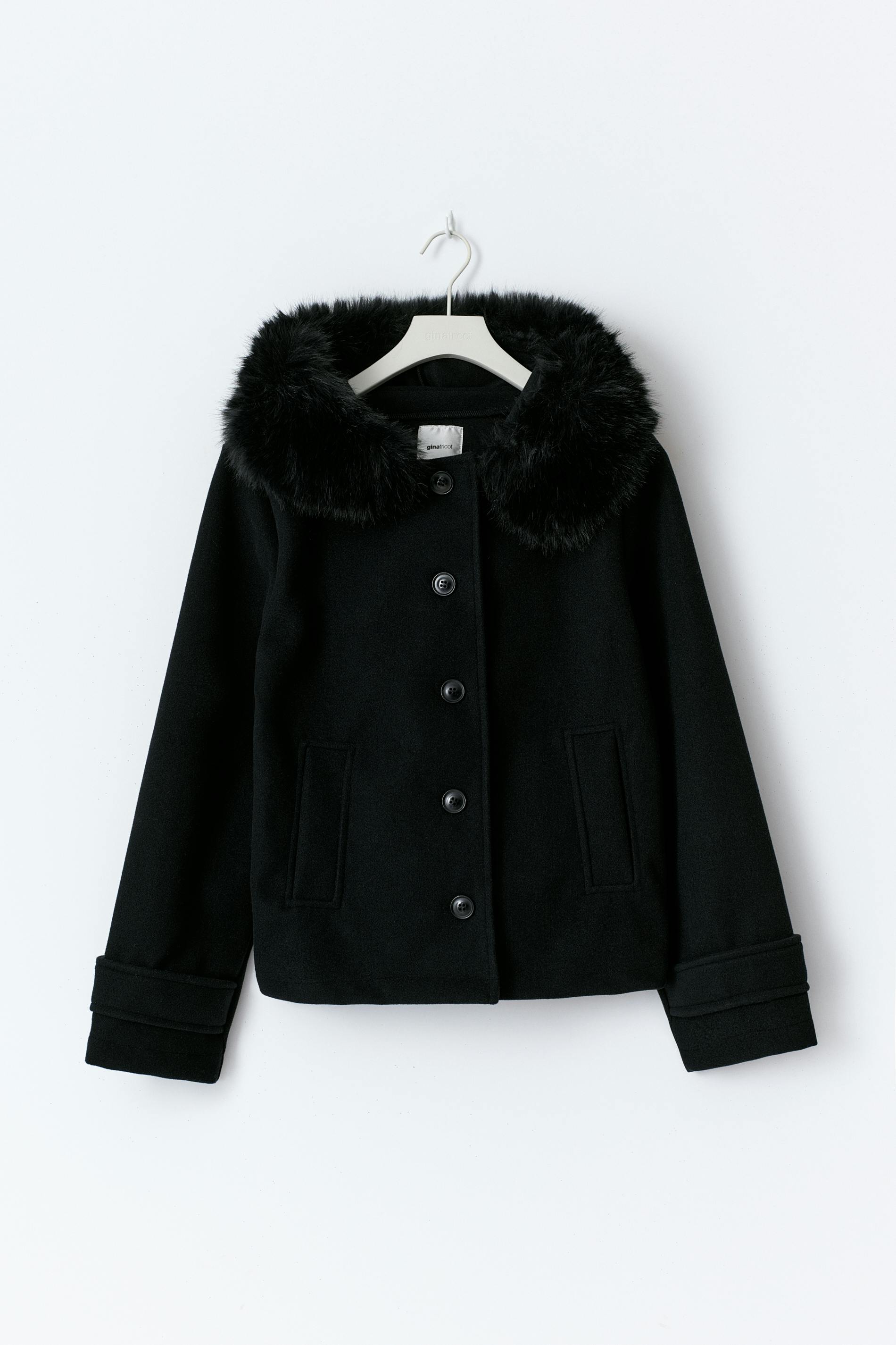 Jacka med avtagbar pälskrage. Jackan är svart och har knäppning fram. Den har oversize fit, fickor i sidorna, nedhasade axlar och långa ärmar. Ofodrad.