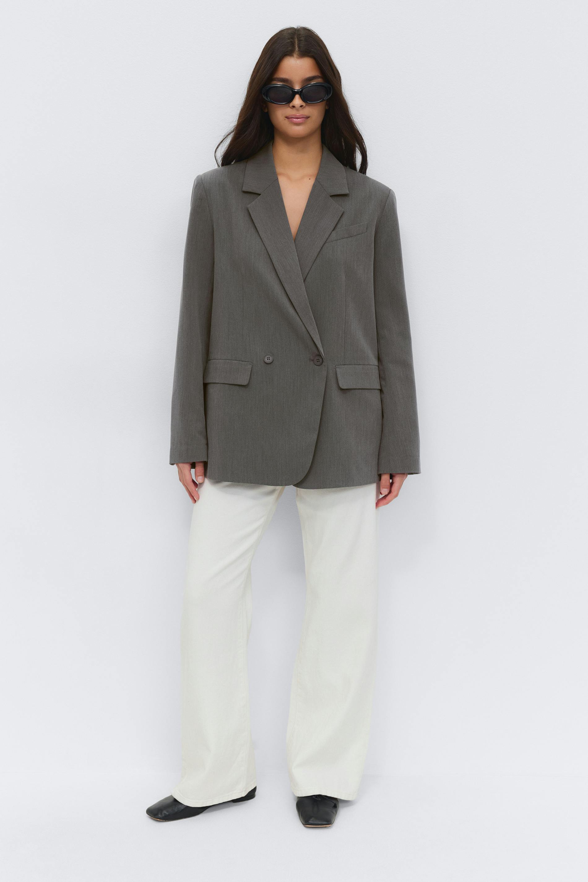 Oversized kavaj med hög slits bak. Jackan är grå och har fickor med lock i sidorna. Den har knäppning fram, bröstficka, krage med slag, lång ärm och slits vid ärmsluten.