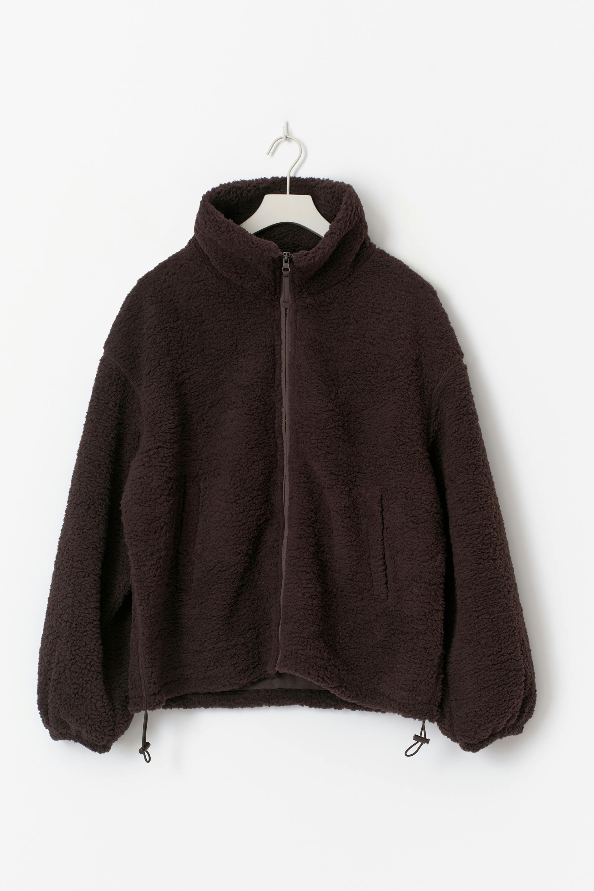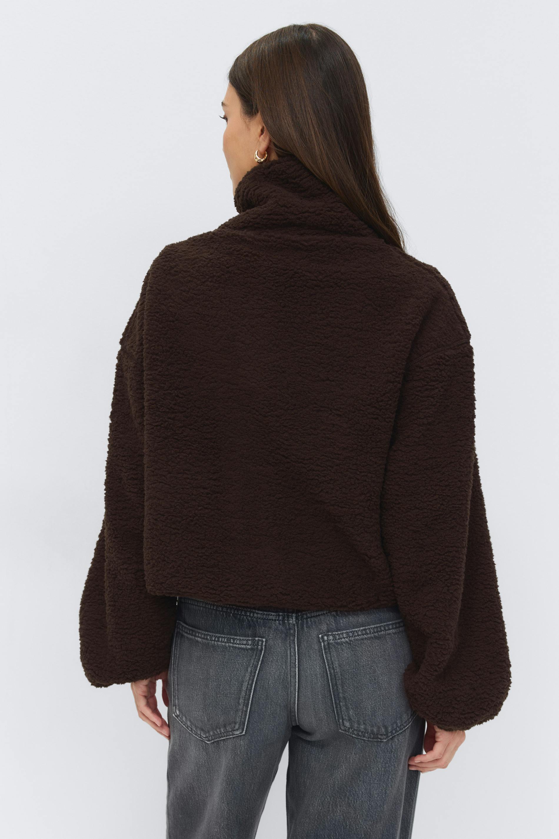 Croppad fleecejacka med hög krage. Jackan är brun och har dragkedja framtill. Den har oversize fit, fickor i sidorna, nedhasade axlar och elasticerad dragsko i nederkant.
