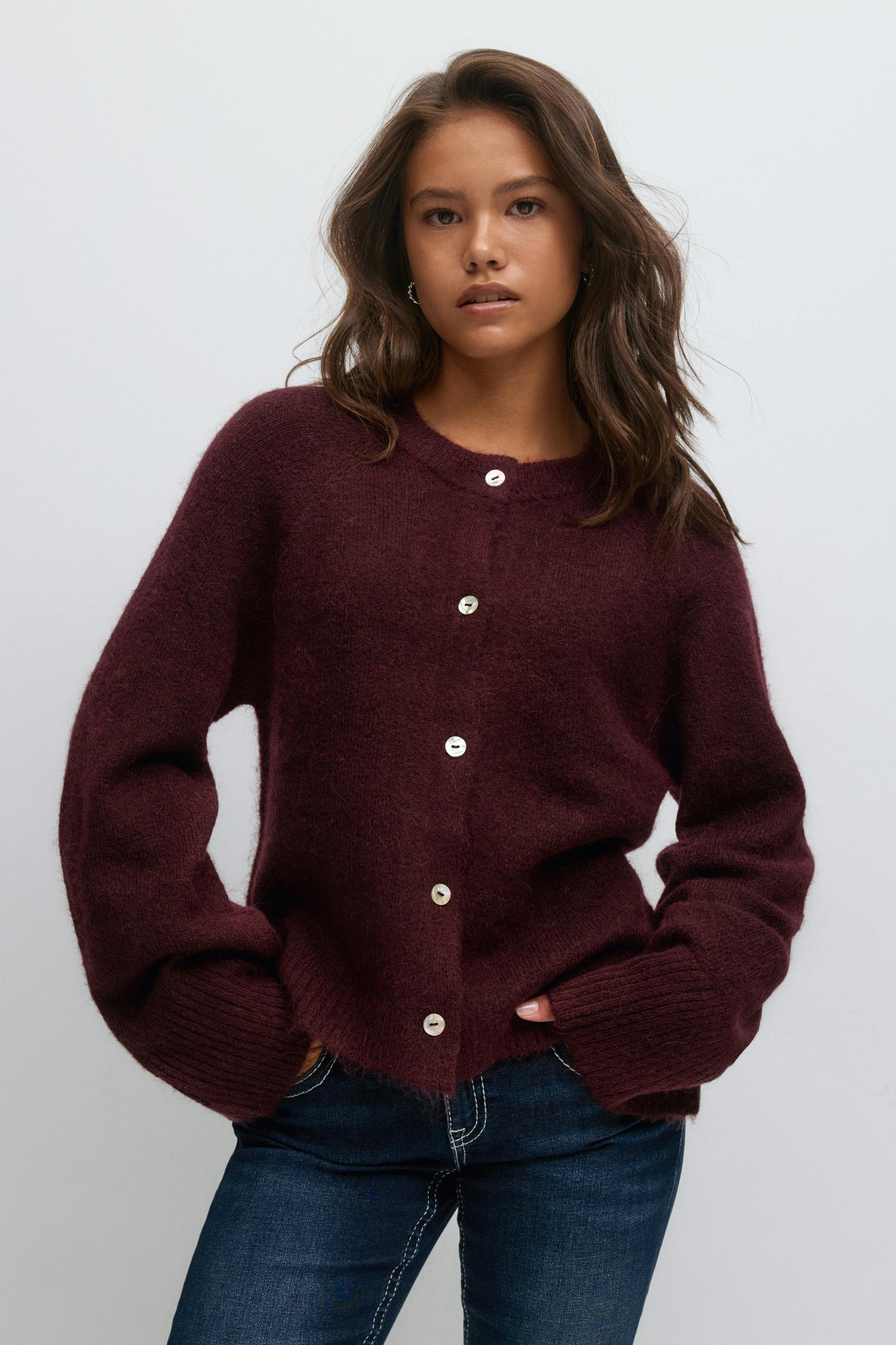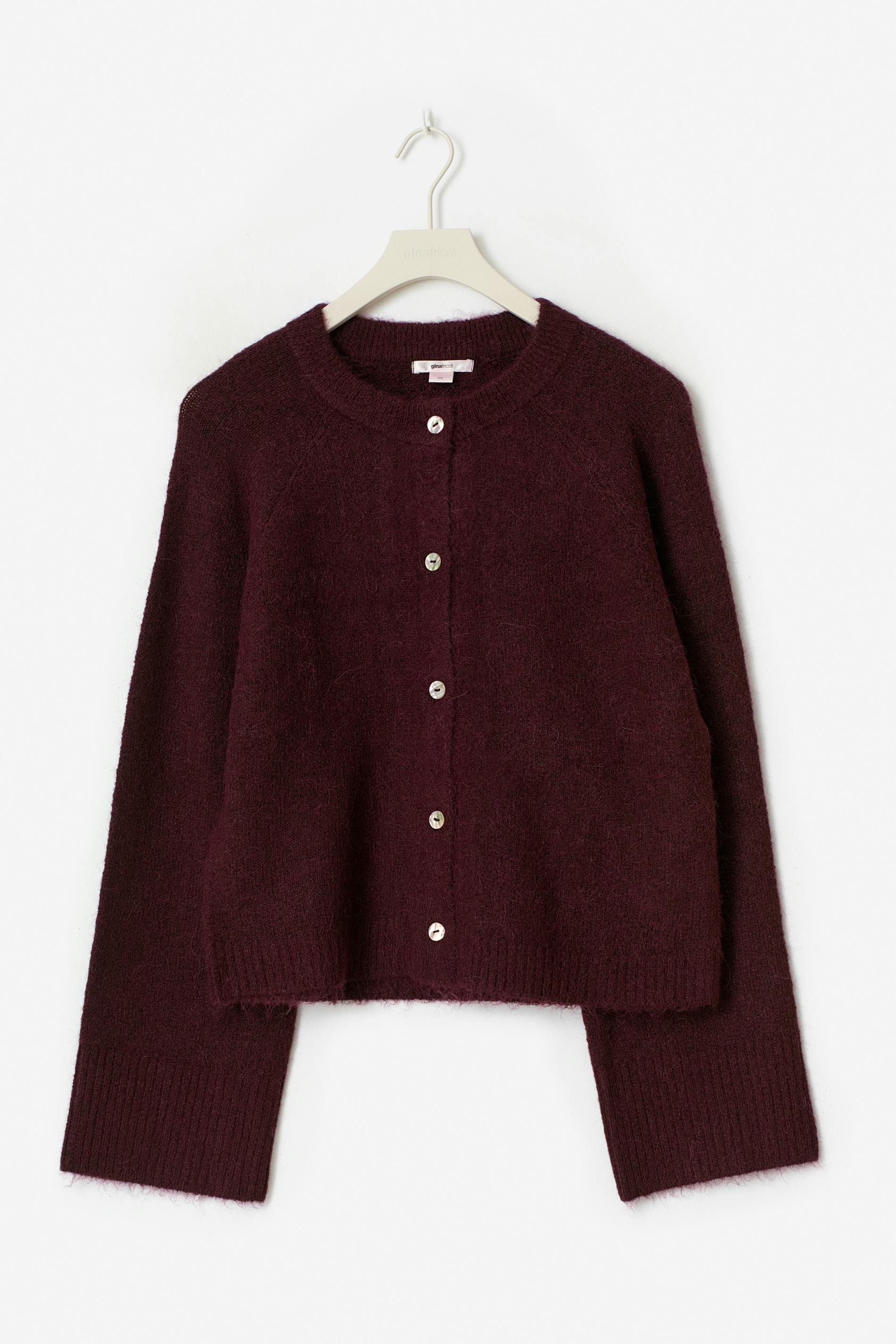 Stickad kofta i ullblandning med knappar framtill. Cardigan är vinröd och har långa ärmar. Den har normal passform, rund halsringning och ribbstickning vid ärmslut.