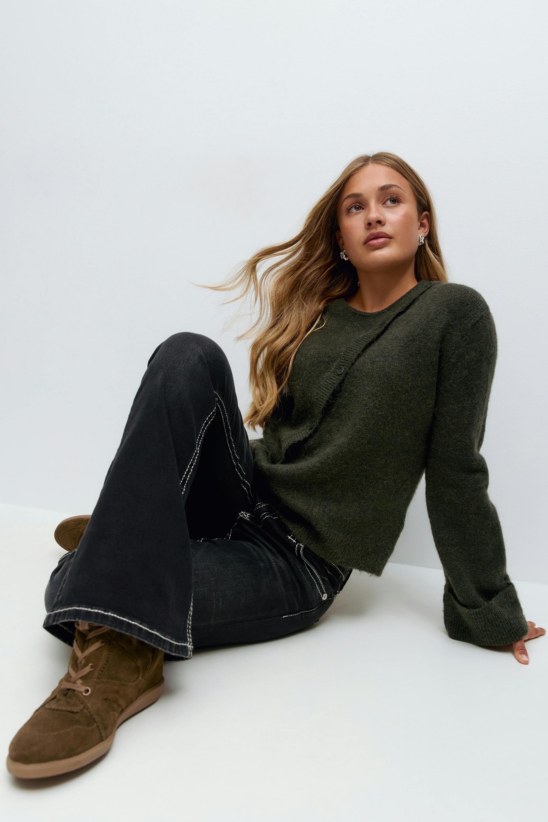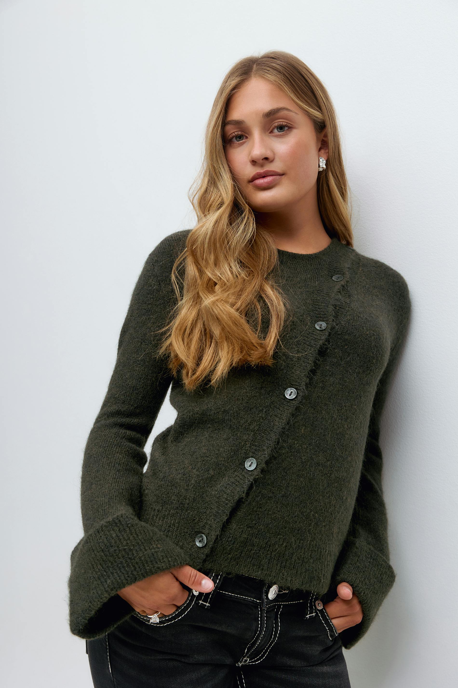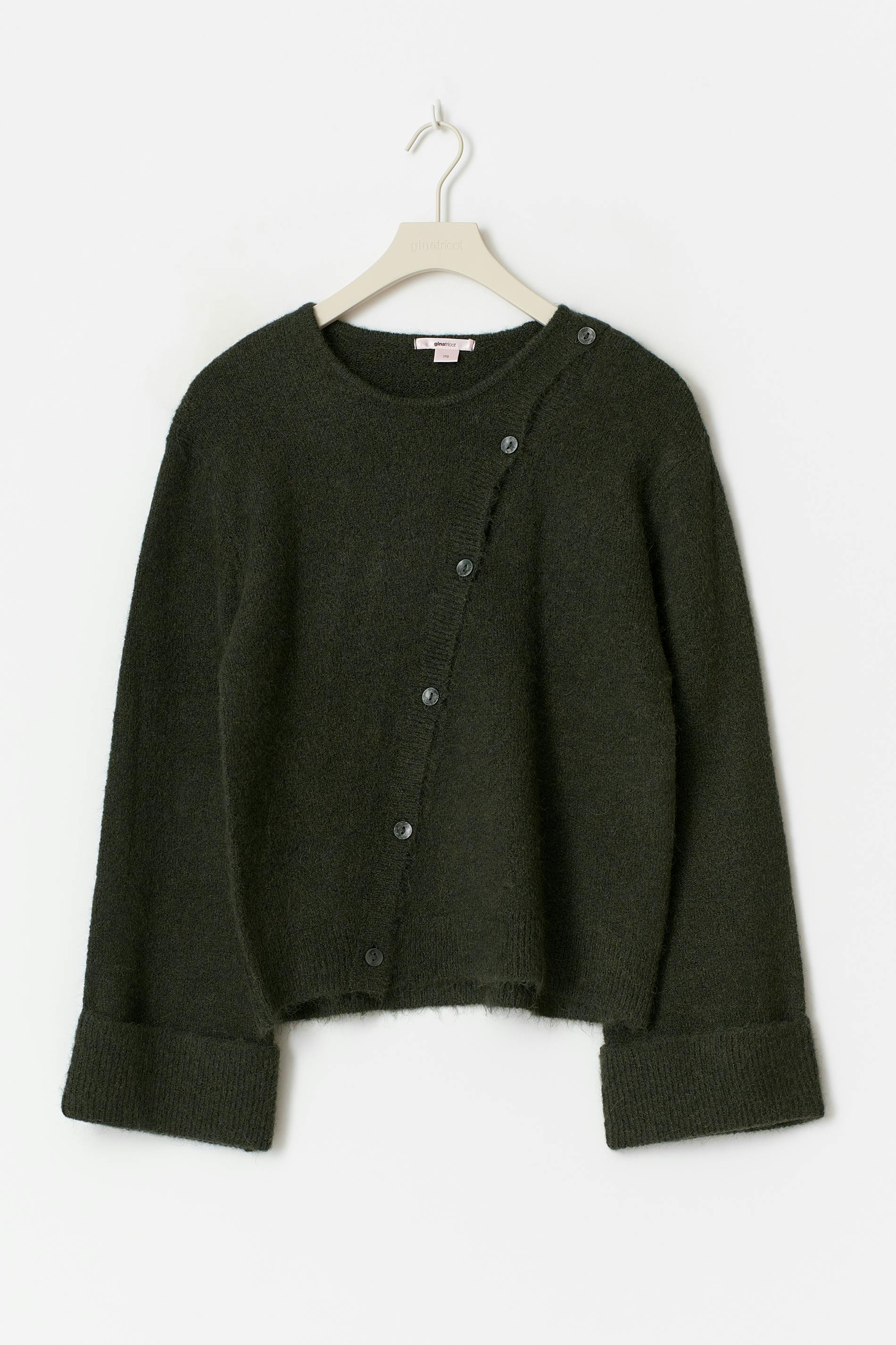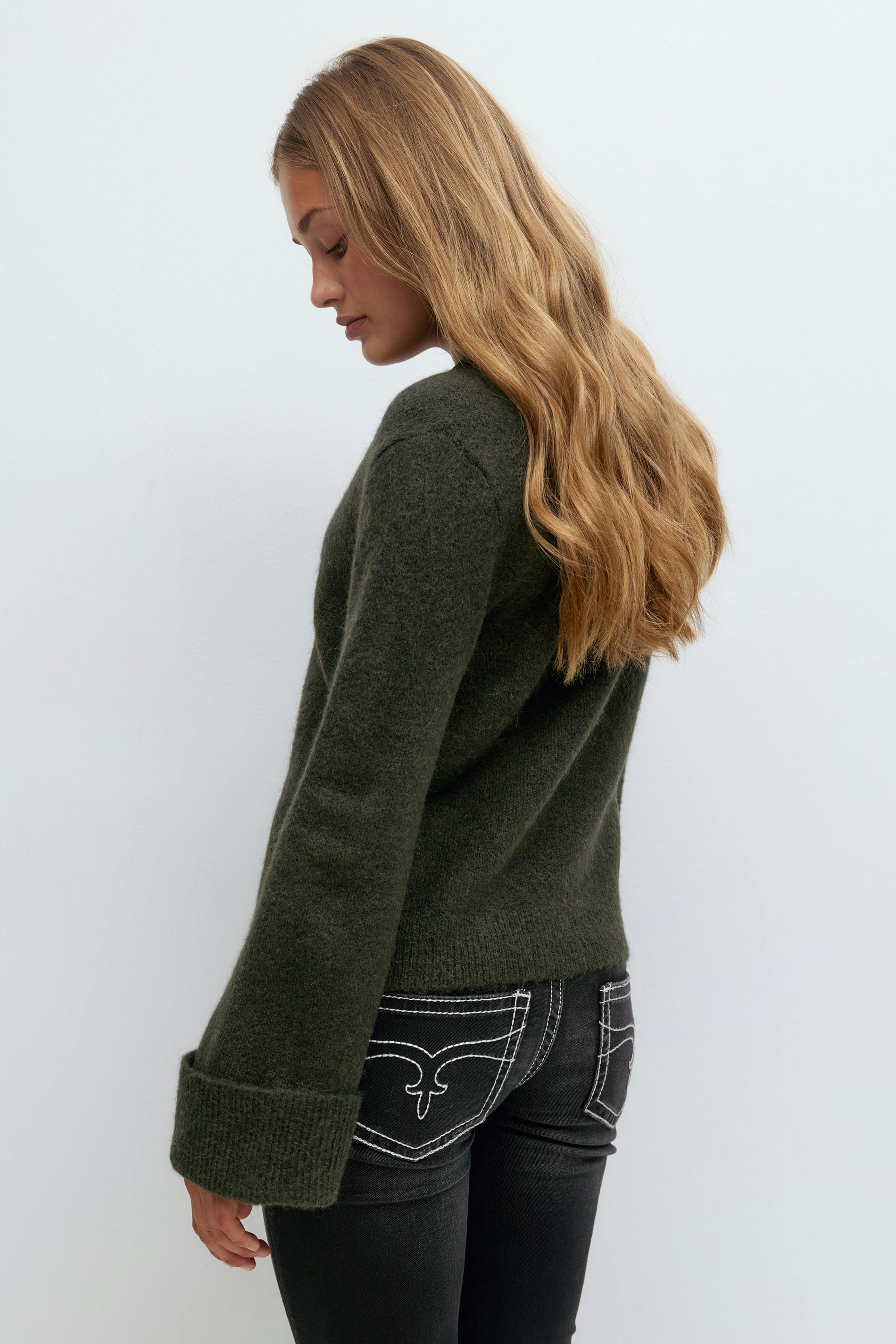 Stickad tröja i ullblandning med asymmetrisk knäppning framtill. Tröjan är grön och har oversize fit. Den har rund halsringning, mjuk kvalitet, långa ärmar med uppvikta ärmslut och ribbstickning vid ärmslut och i nederkant.