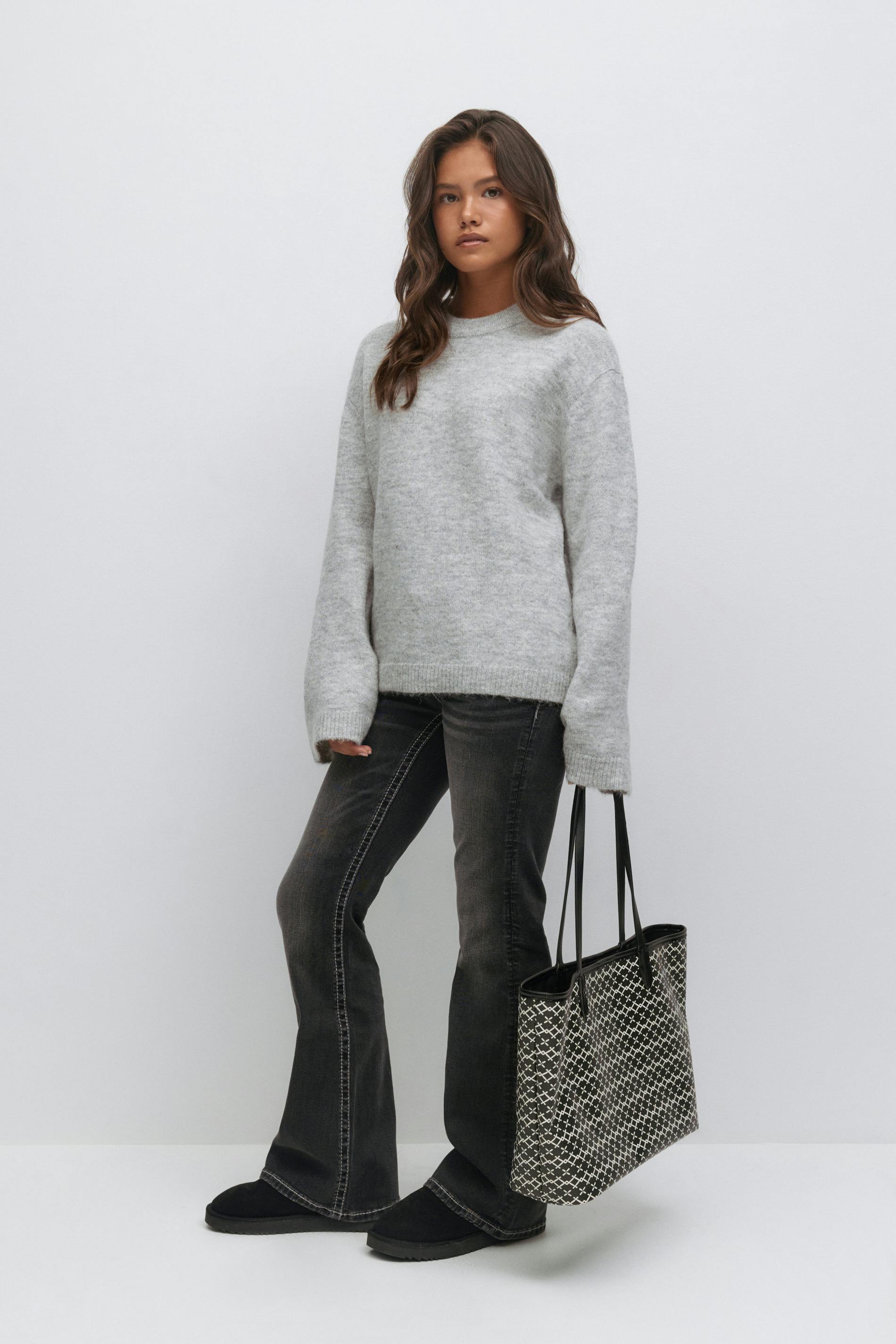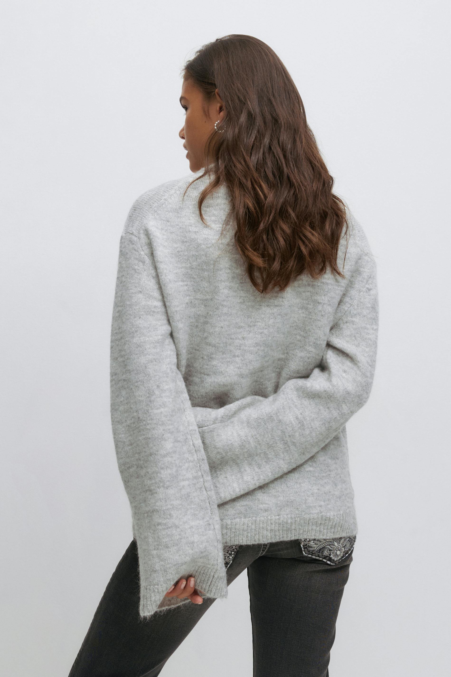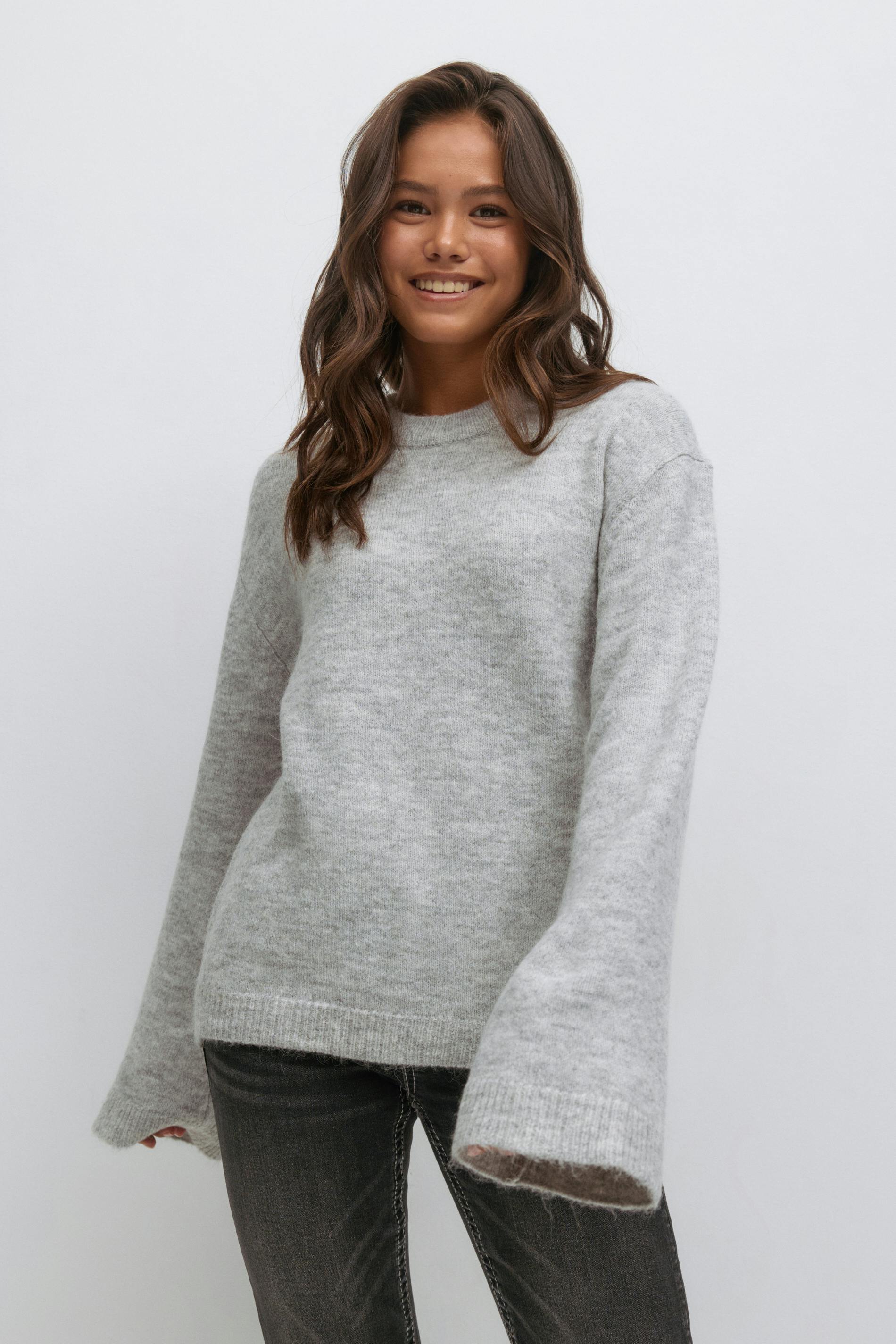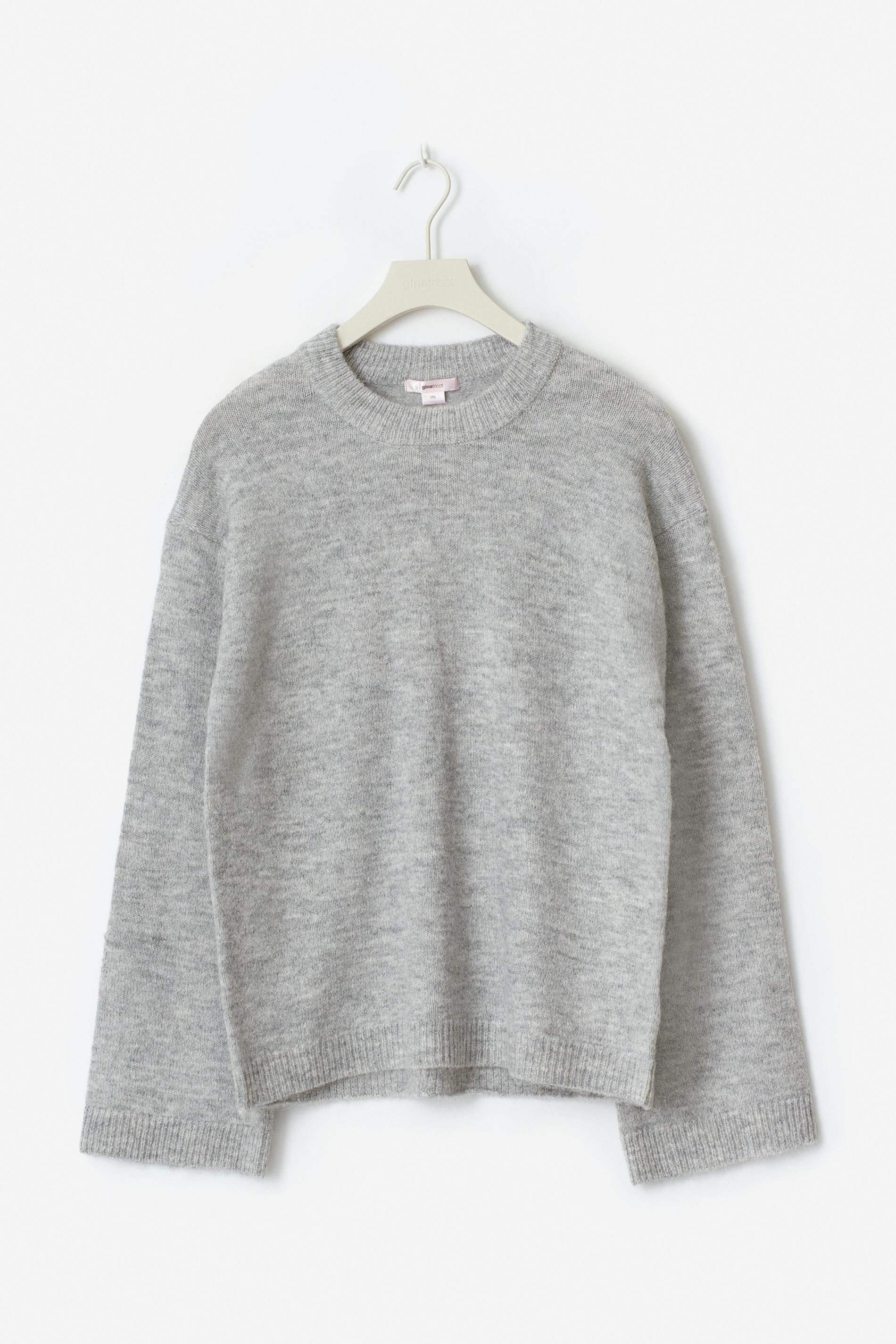 Stickad tröja med oversize fit. Tröjan är grå och har rund halsringning. Den har långa, raka ärmar, normallängd och ribbstickning vid ärmslut och i nederkant.
