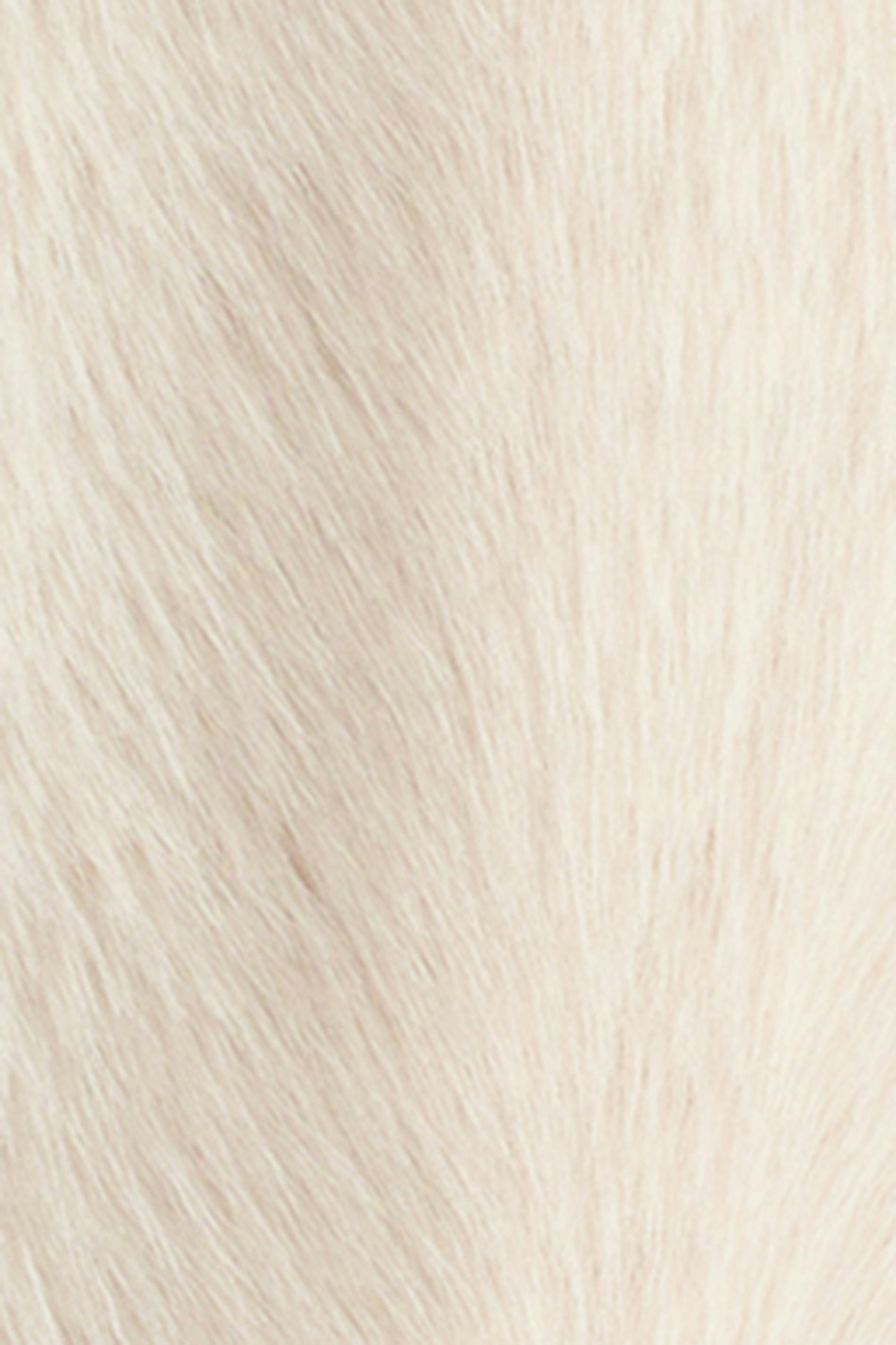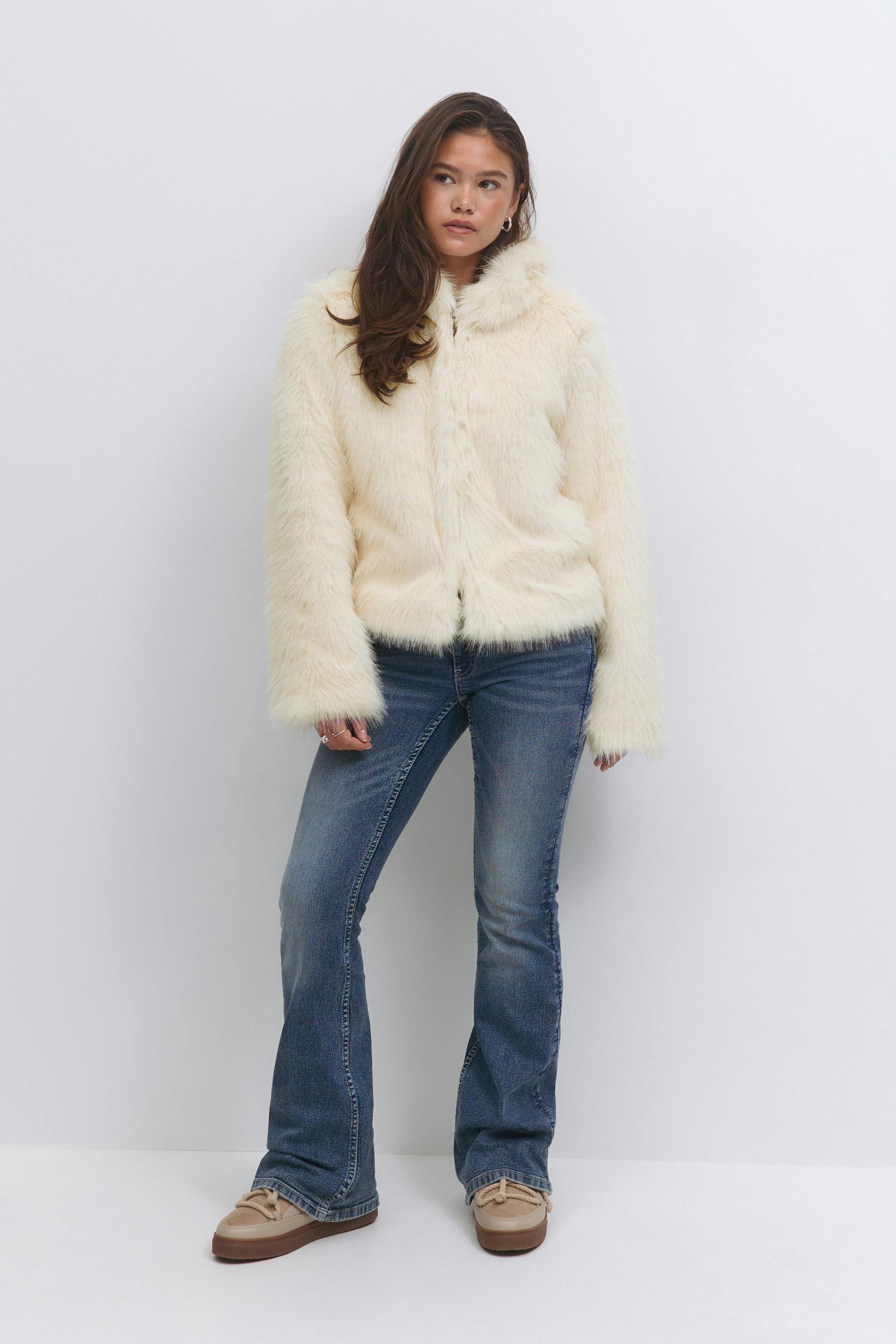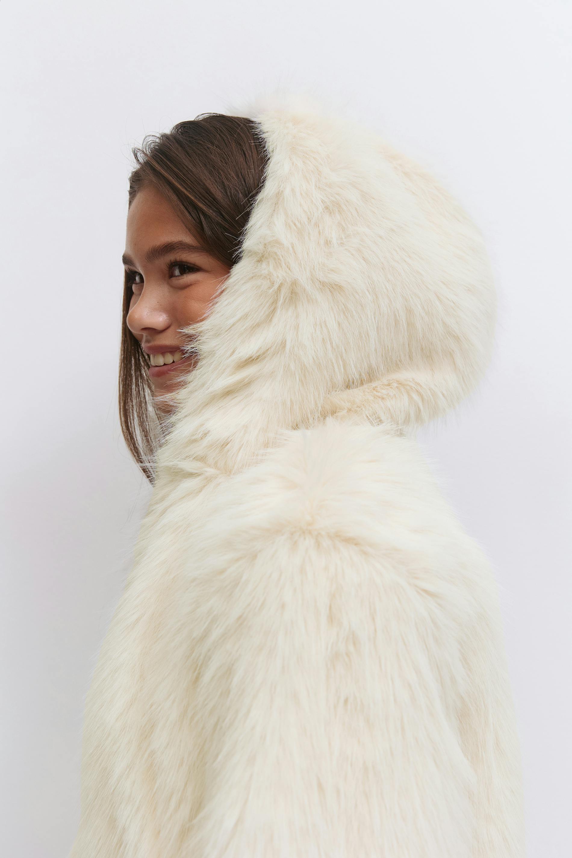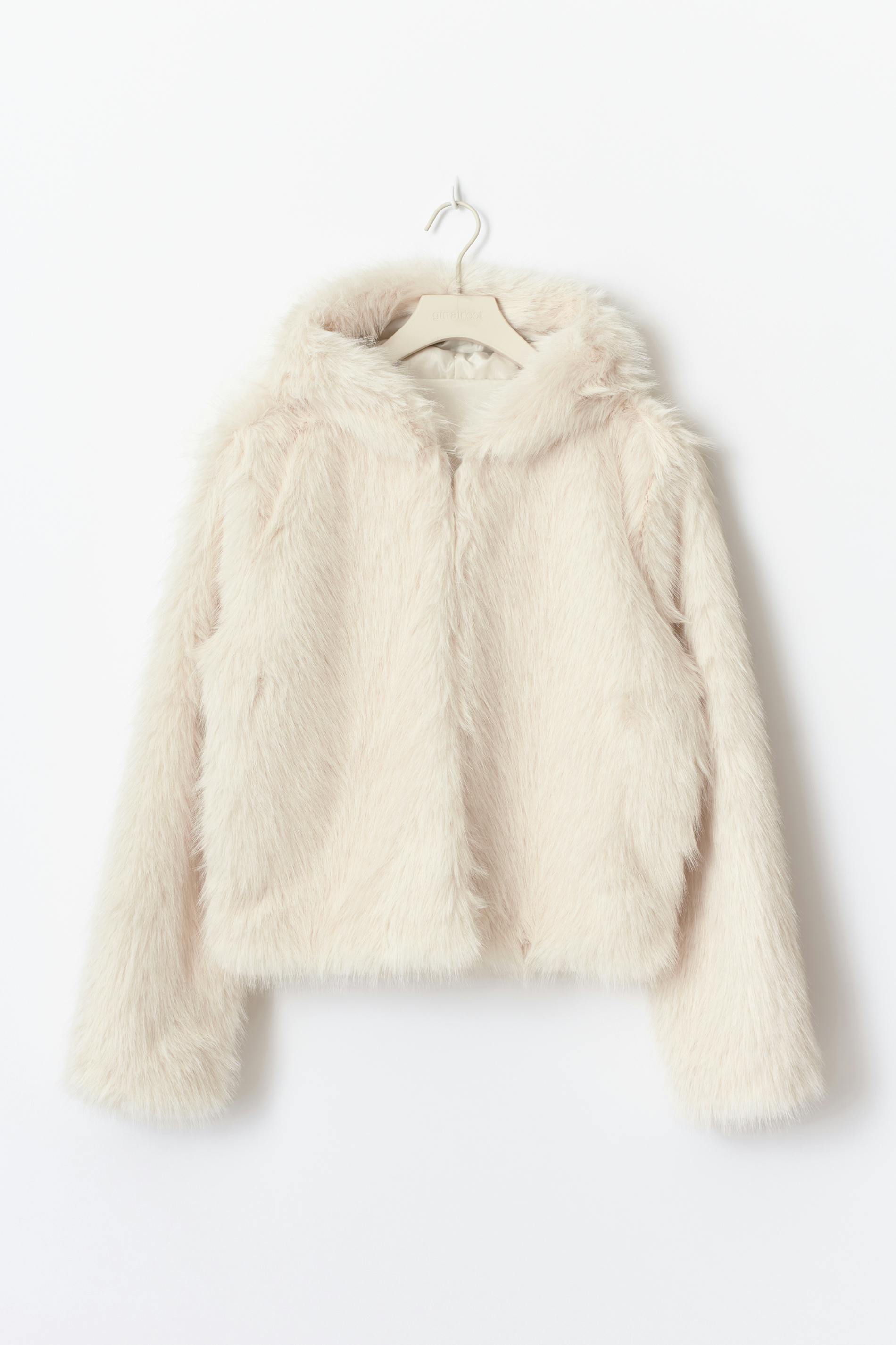 Mjuk jacka i fuskpäls med en huva. Jackan är krämfärgad och har en lång ärm. Den har en normal passform.