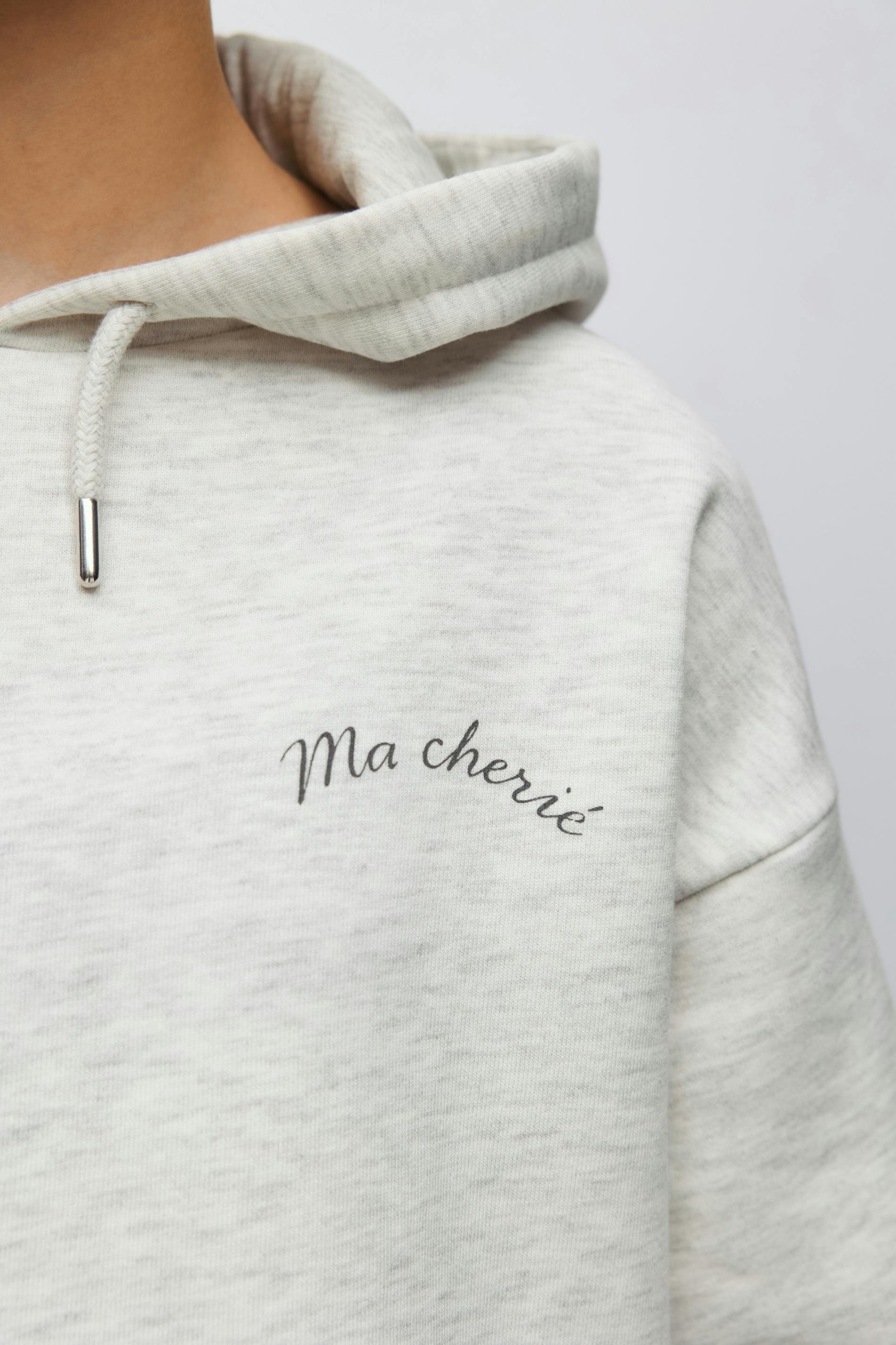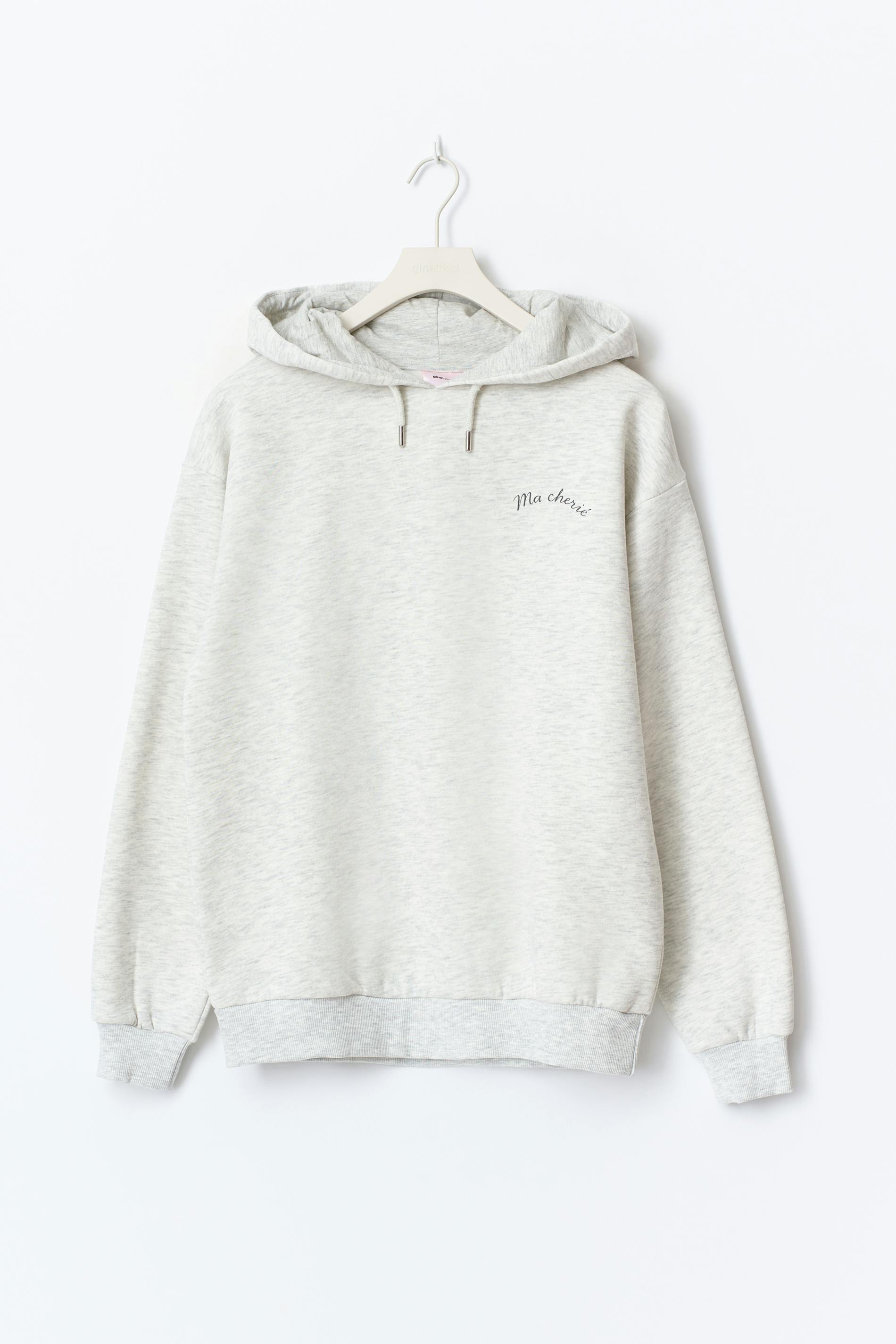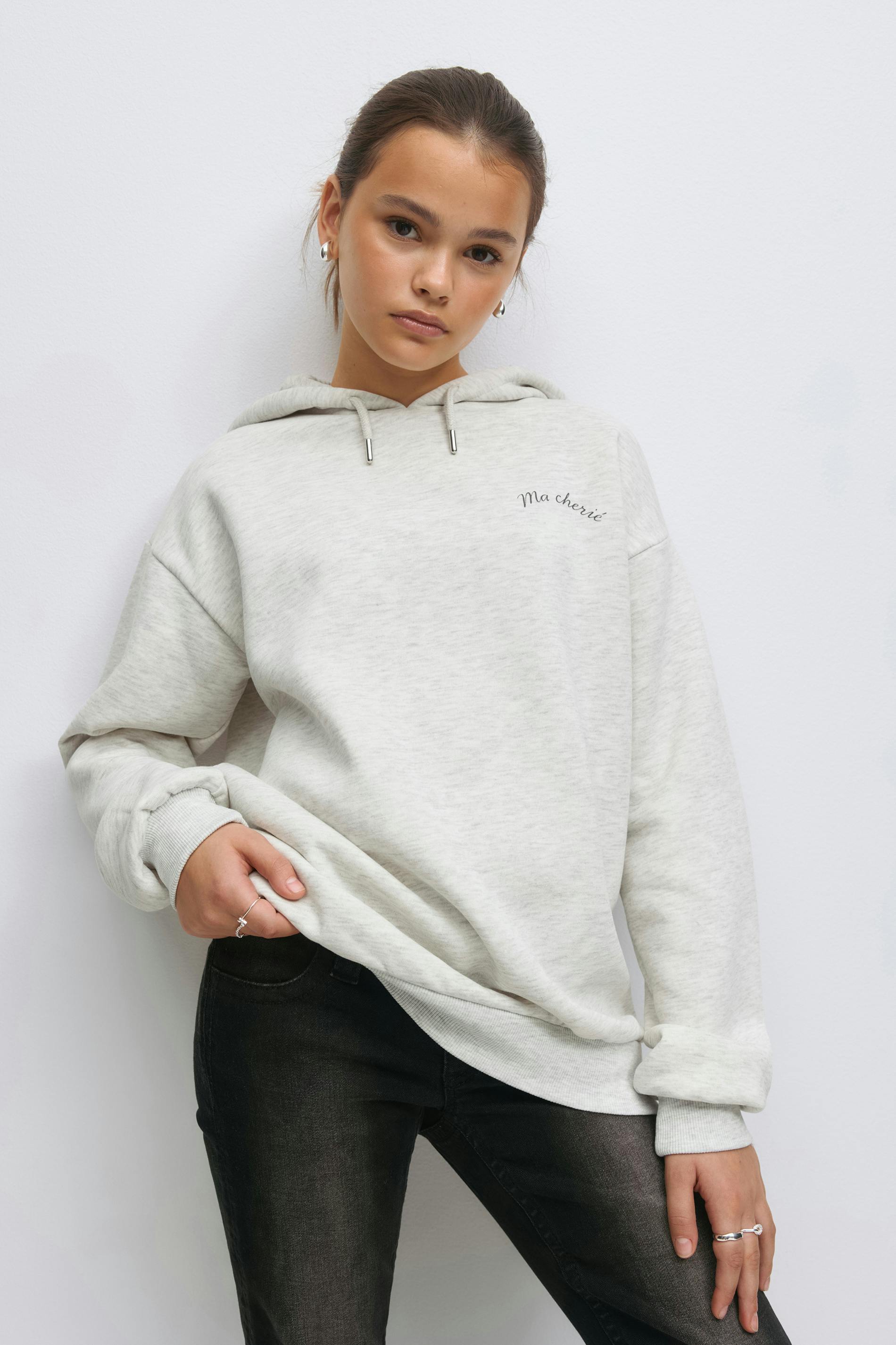 Hoodie med tryck på bröstet och på ryggen. Hoodien är ljusgrå och har huva med dragskor. Den har lång ärm och en ribbad mudd vid ärmslut och i nederkant.