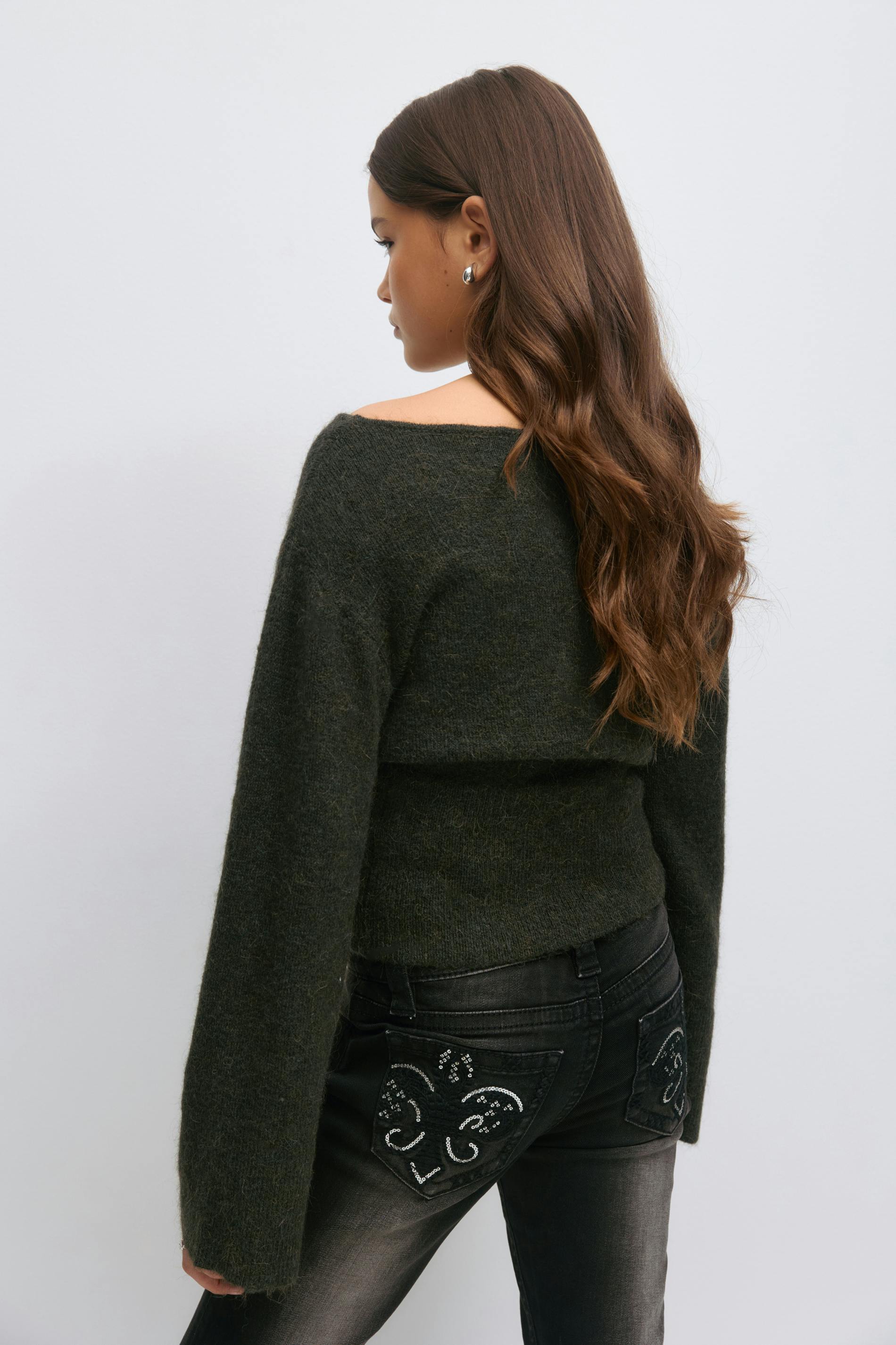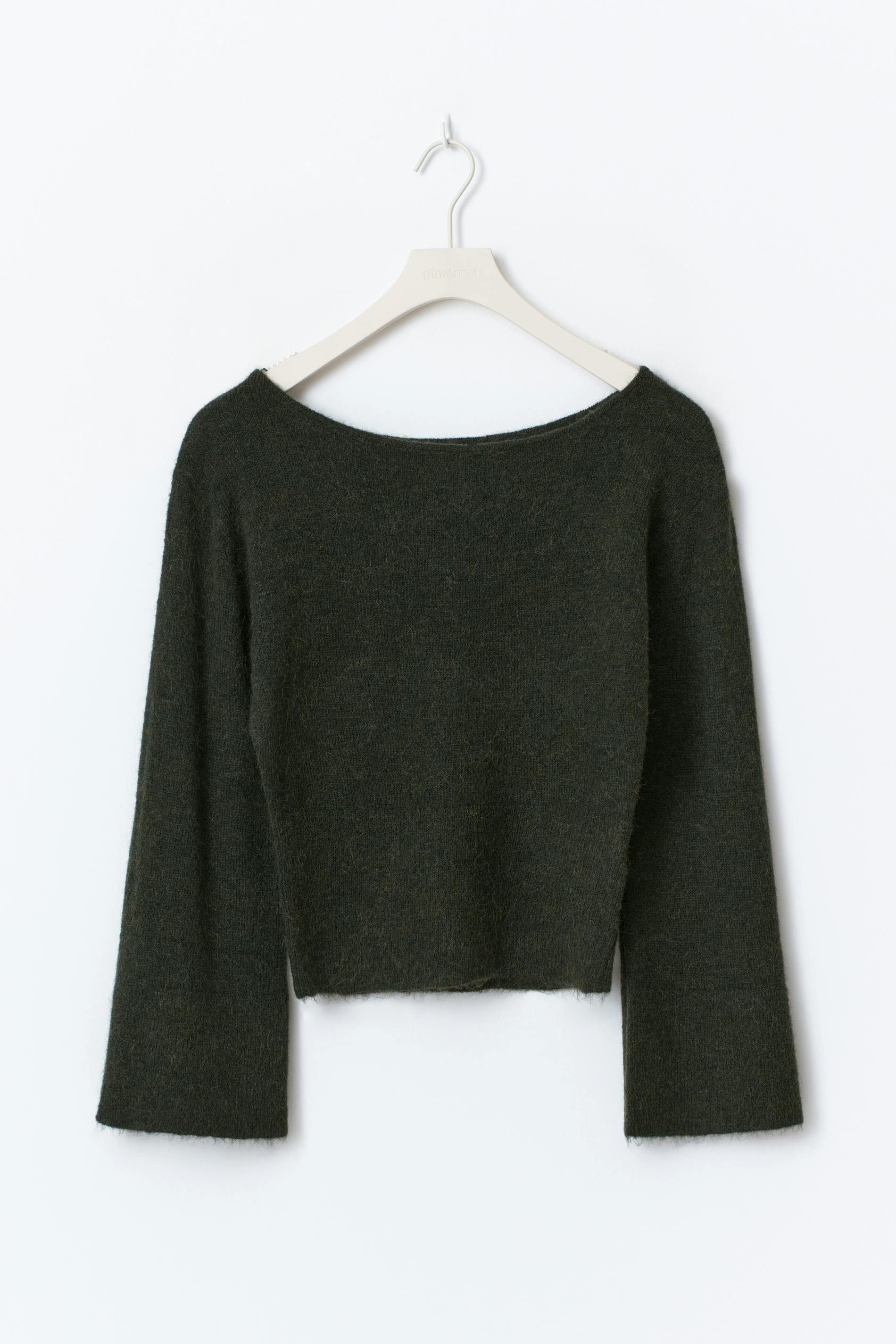Stickad tröja med en lång ärm. Den stickade tröjan är mörkgrön och har en båtringning. Den har en normal passform och en ribbad nederkant.
