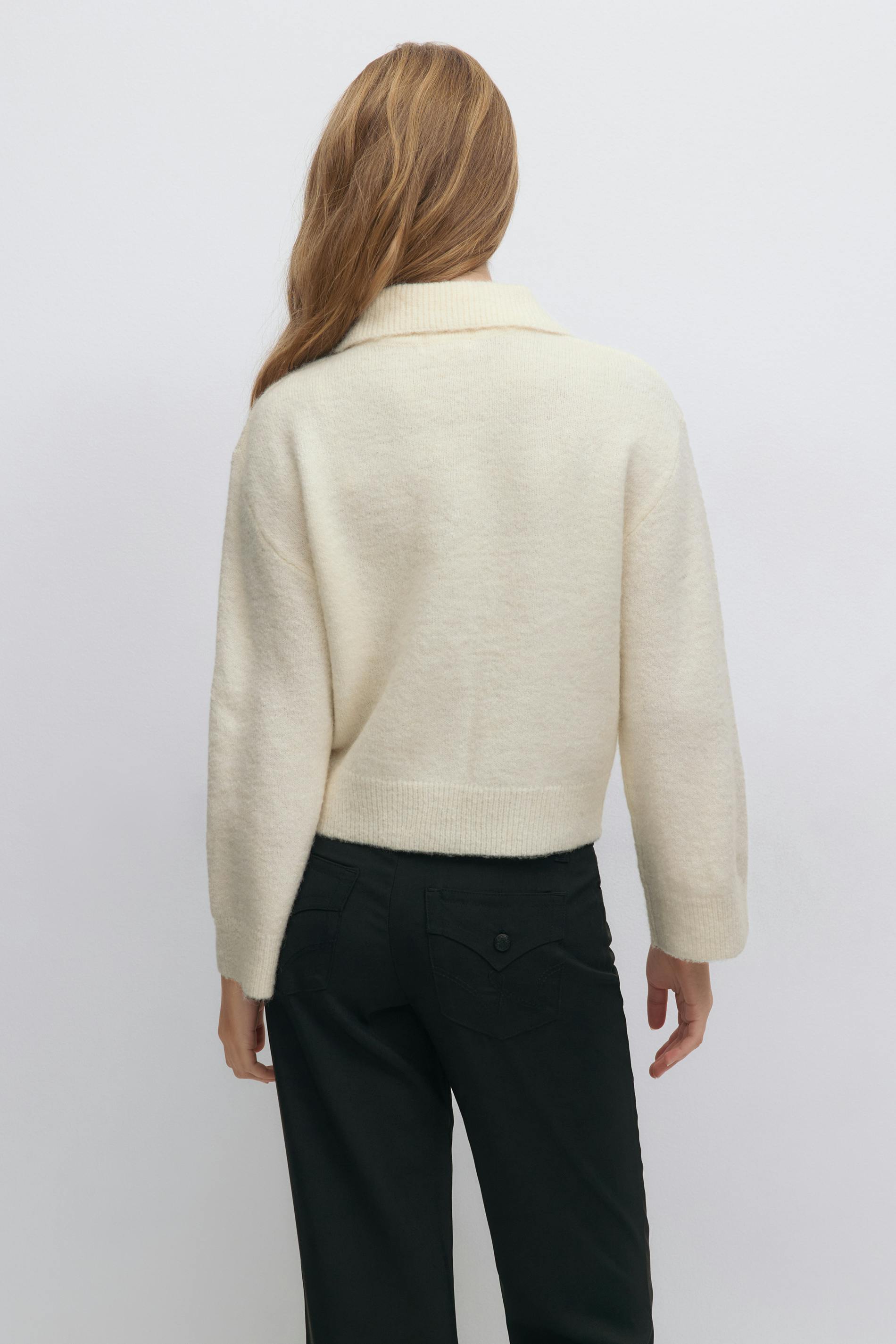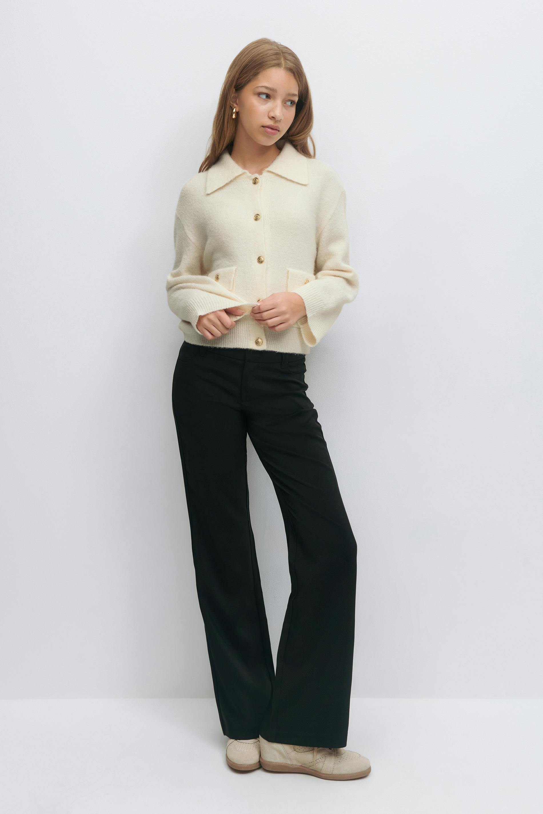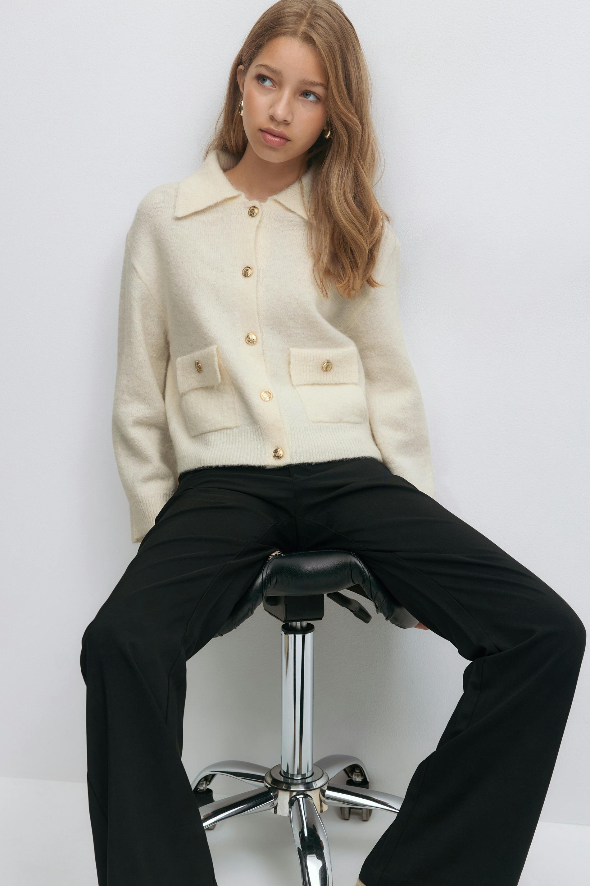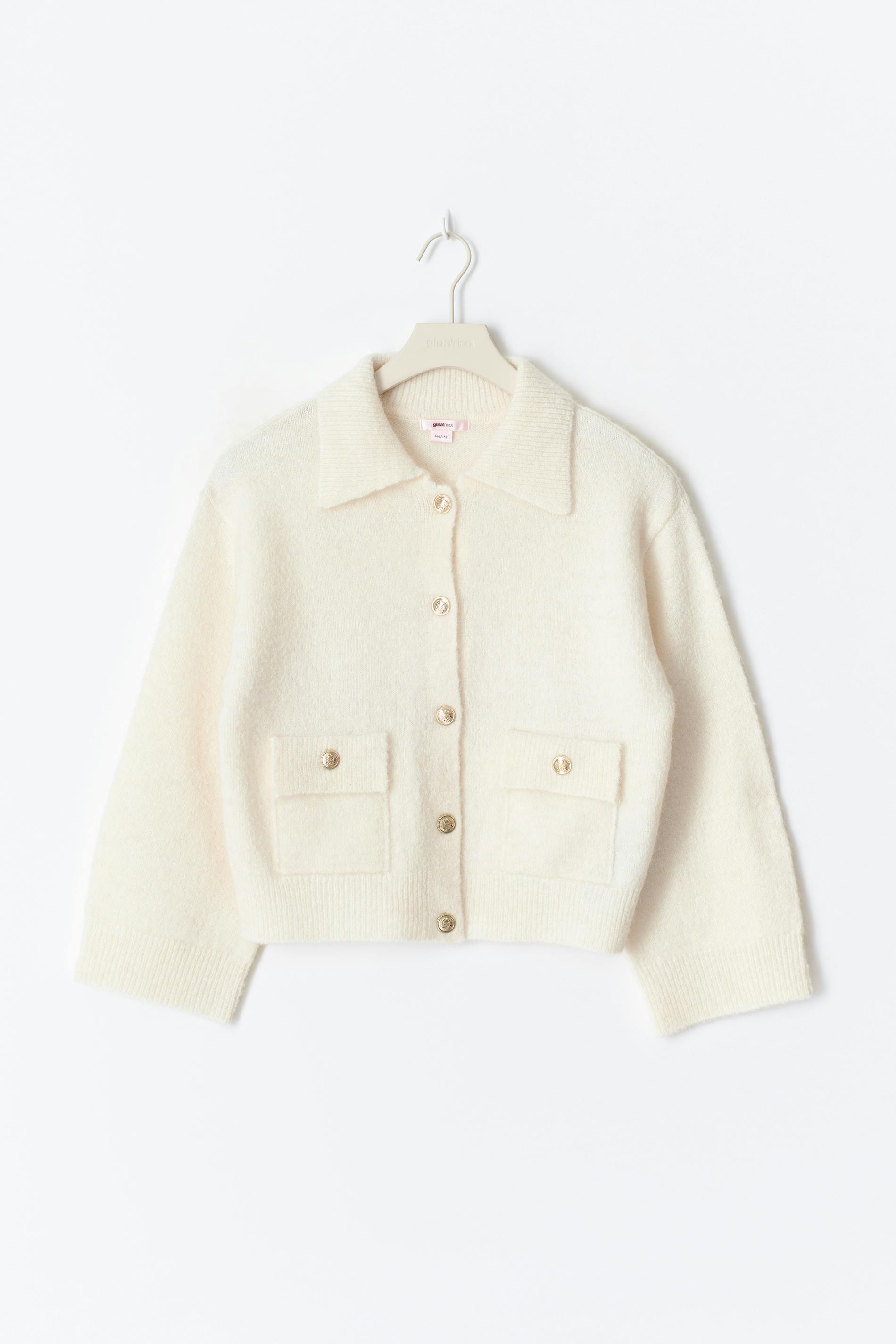 Stickad kofta i ullblandning med guldknappar framtill. Cardigan är vit och har fickor med lock i sidorna. Den har krage, lös passform, rund halsringning och långa ärmar.