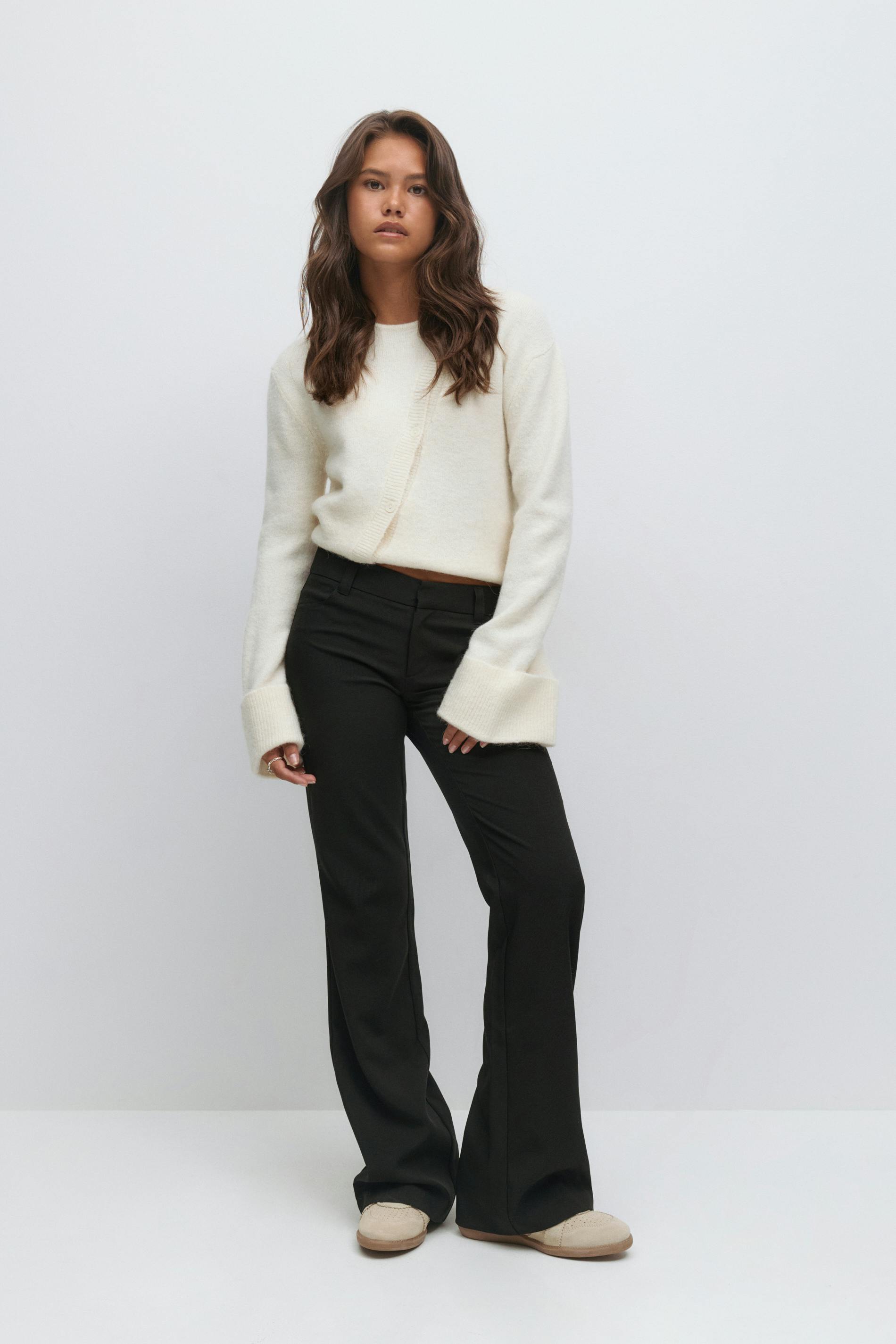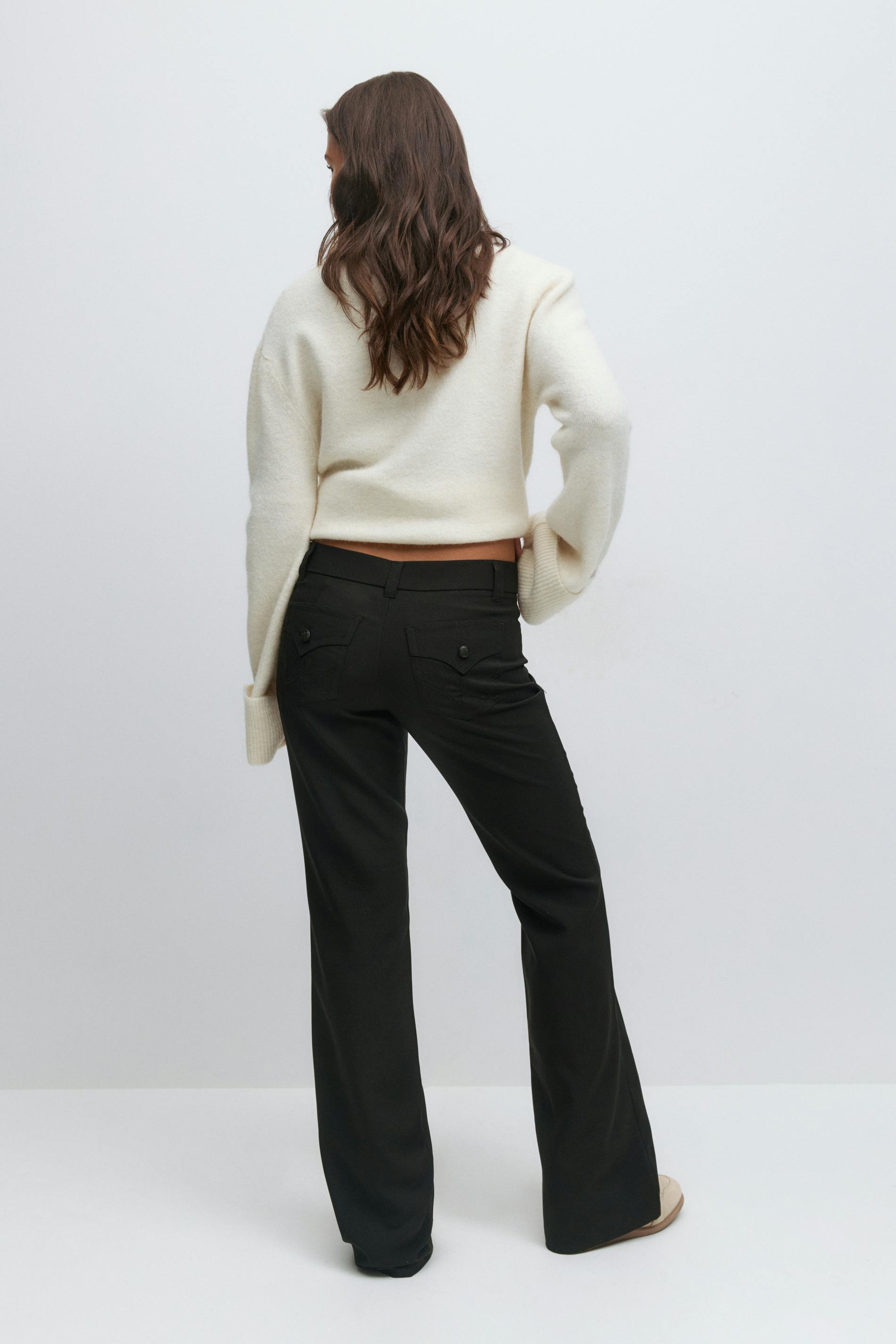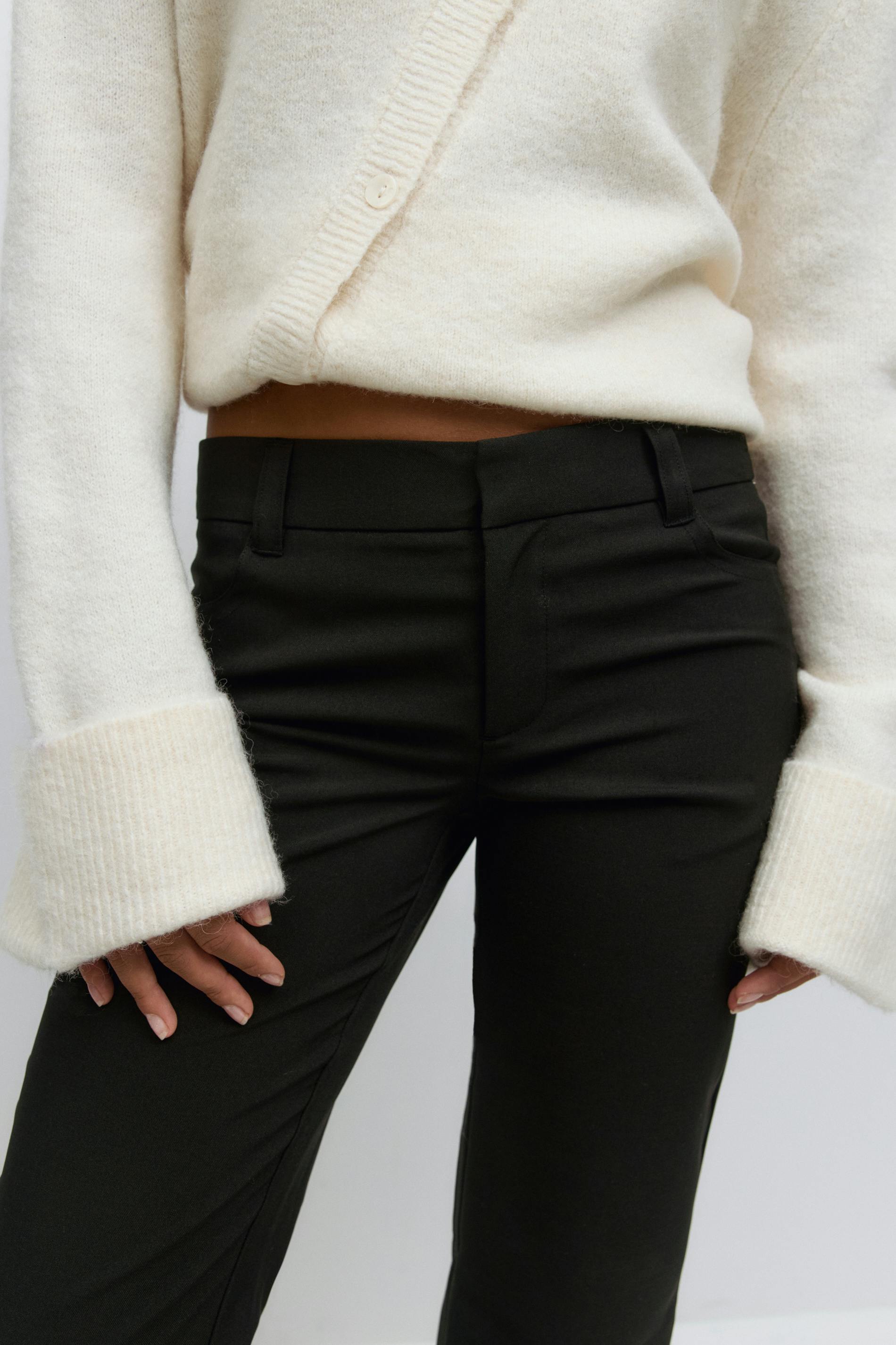 Utsvängda kostymbyxor med extra långa ben. Byxorna är svarta och har låg midja. De har bakfickor med knapp och lock, framfickor, dragkedjegylf och bälteshällor.
