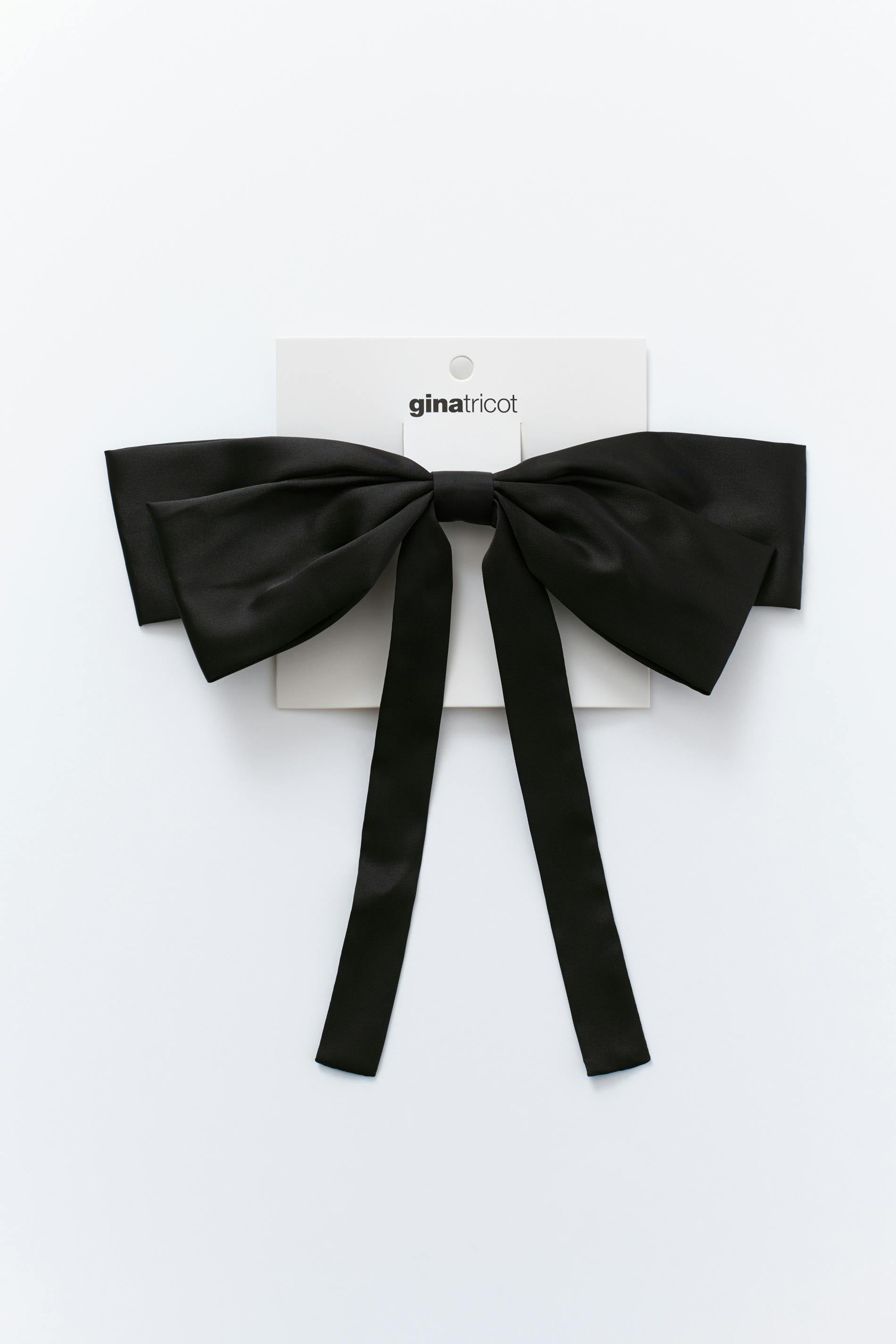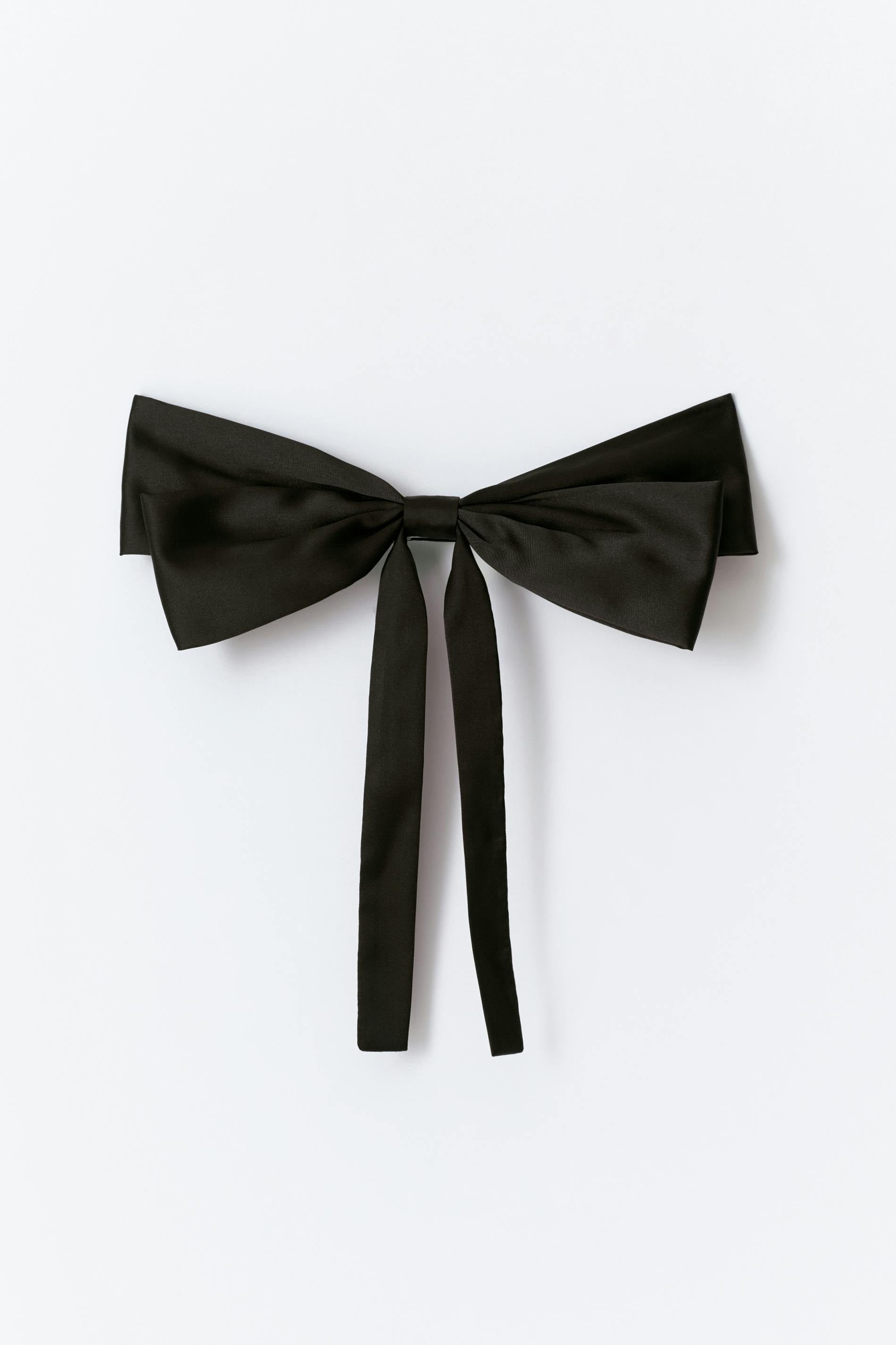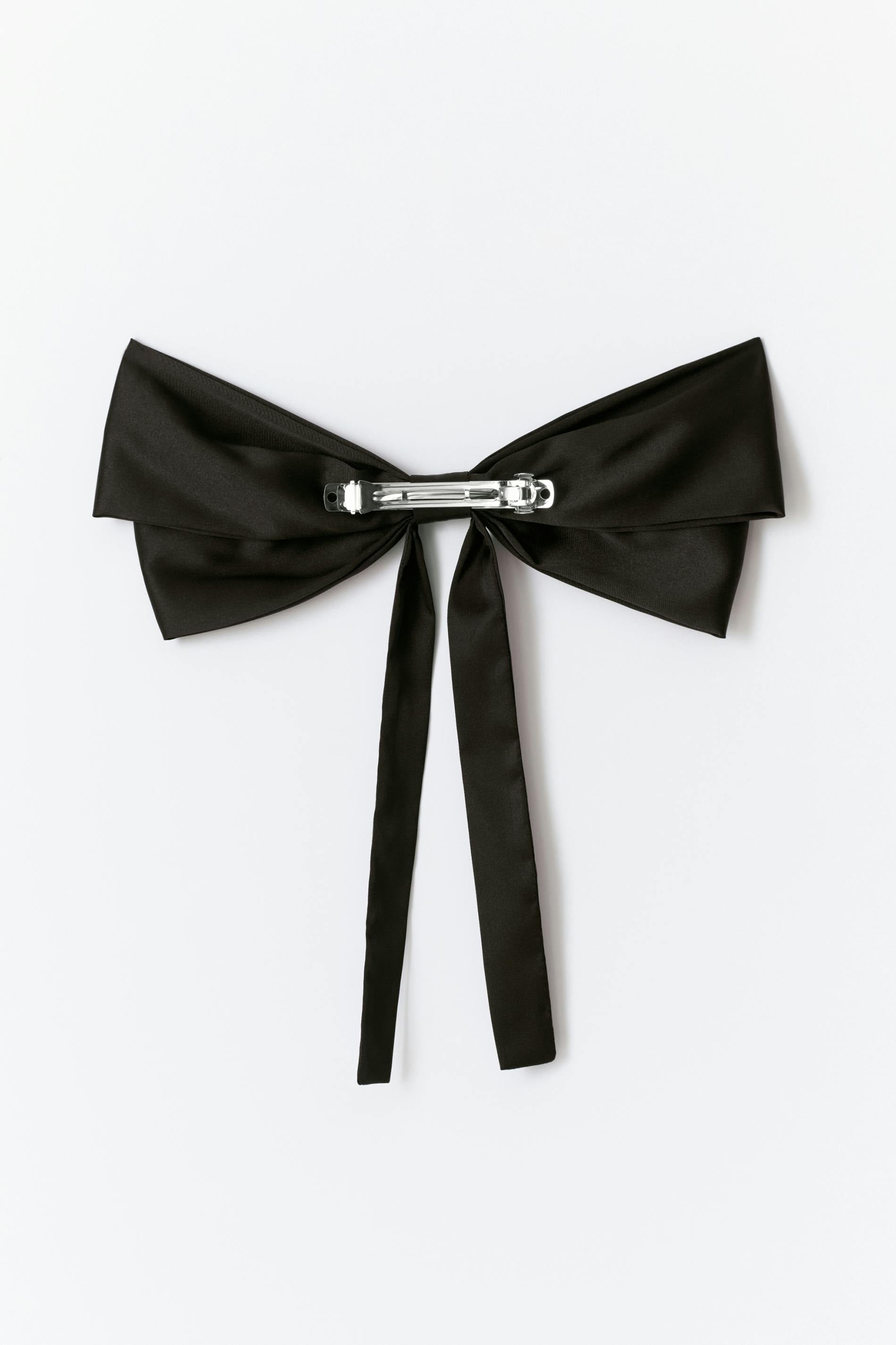 Rosett i satin med hårklämma bak. Rosetten är svart.