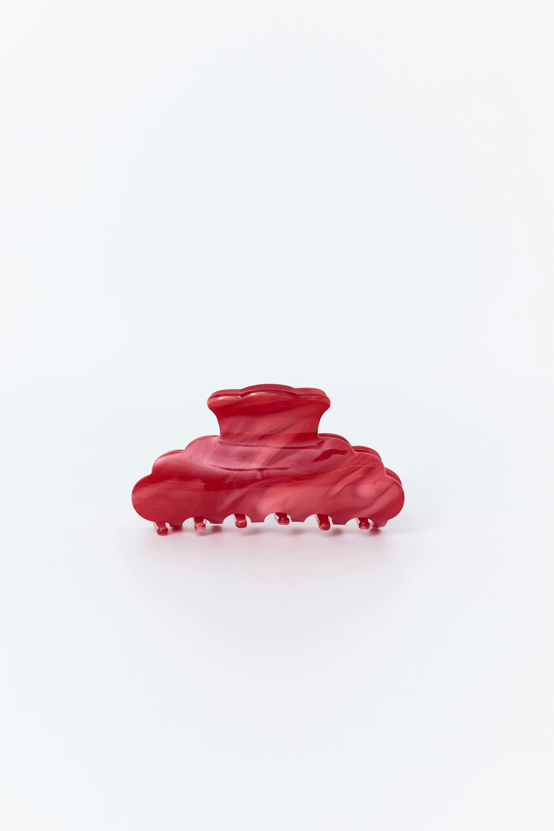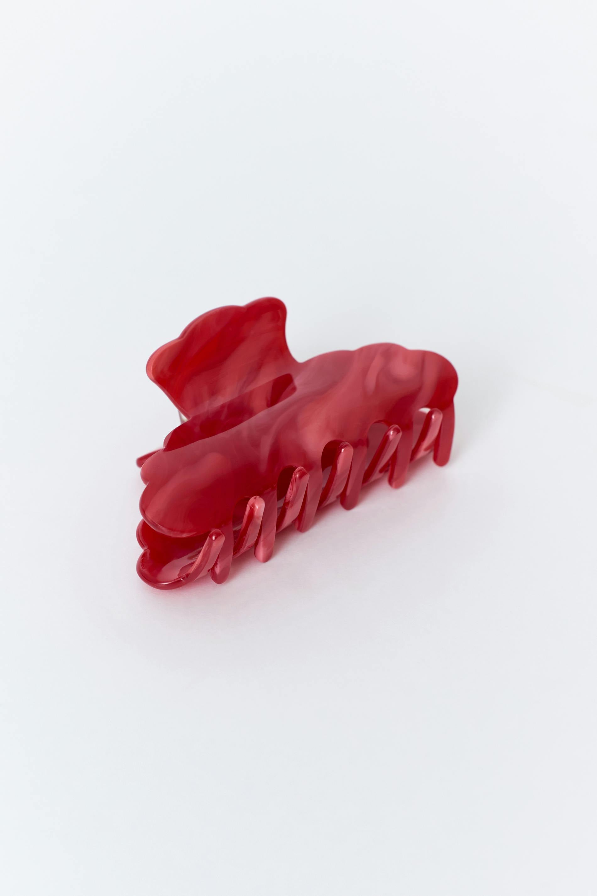 Hårklämma med en vågig form. Hårklämman är röd.