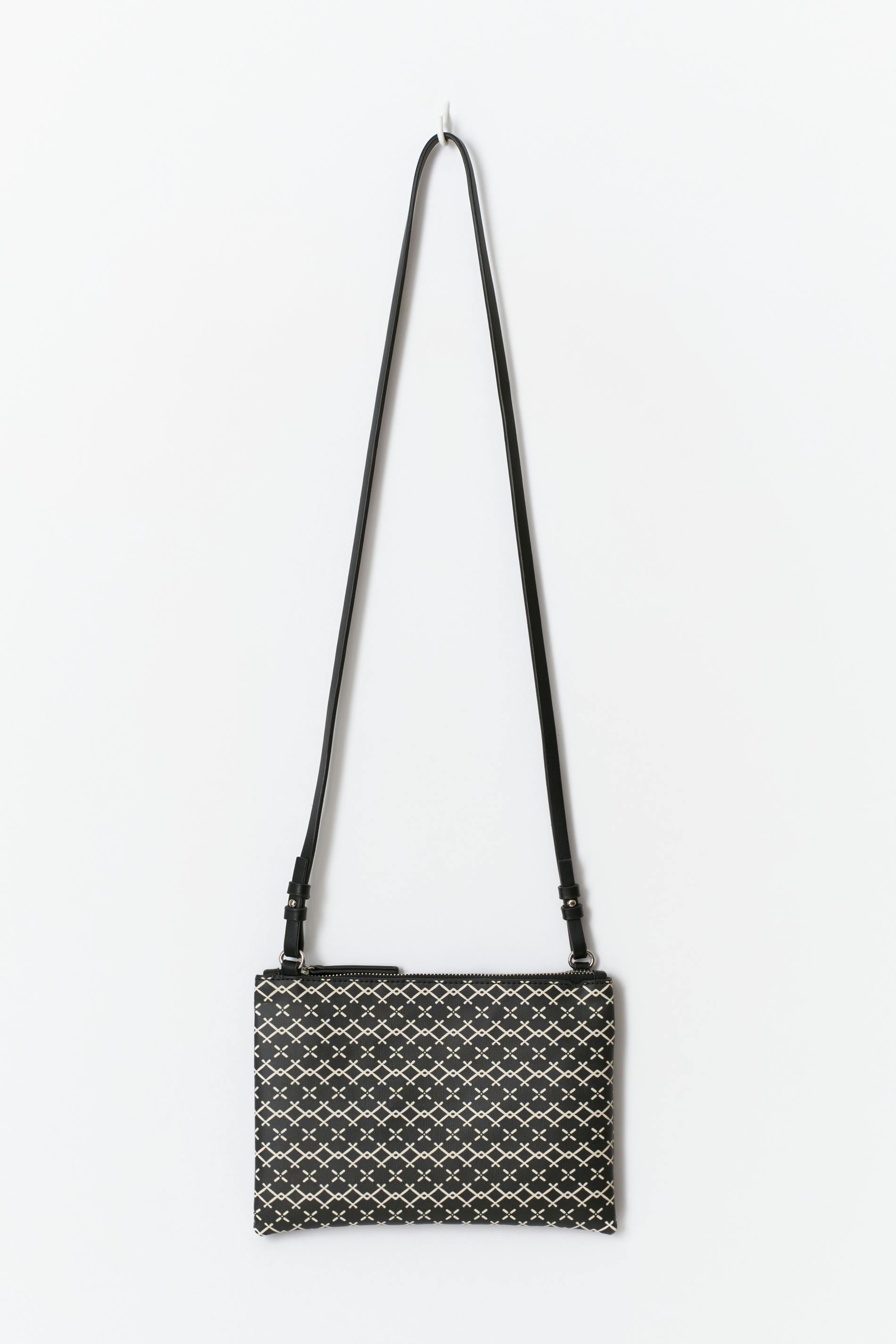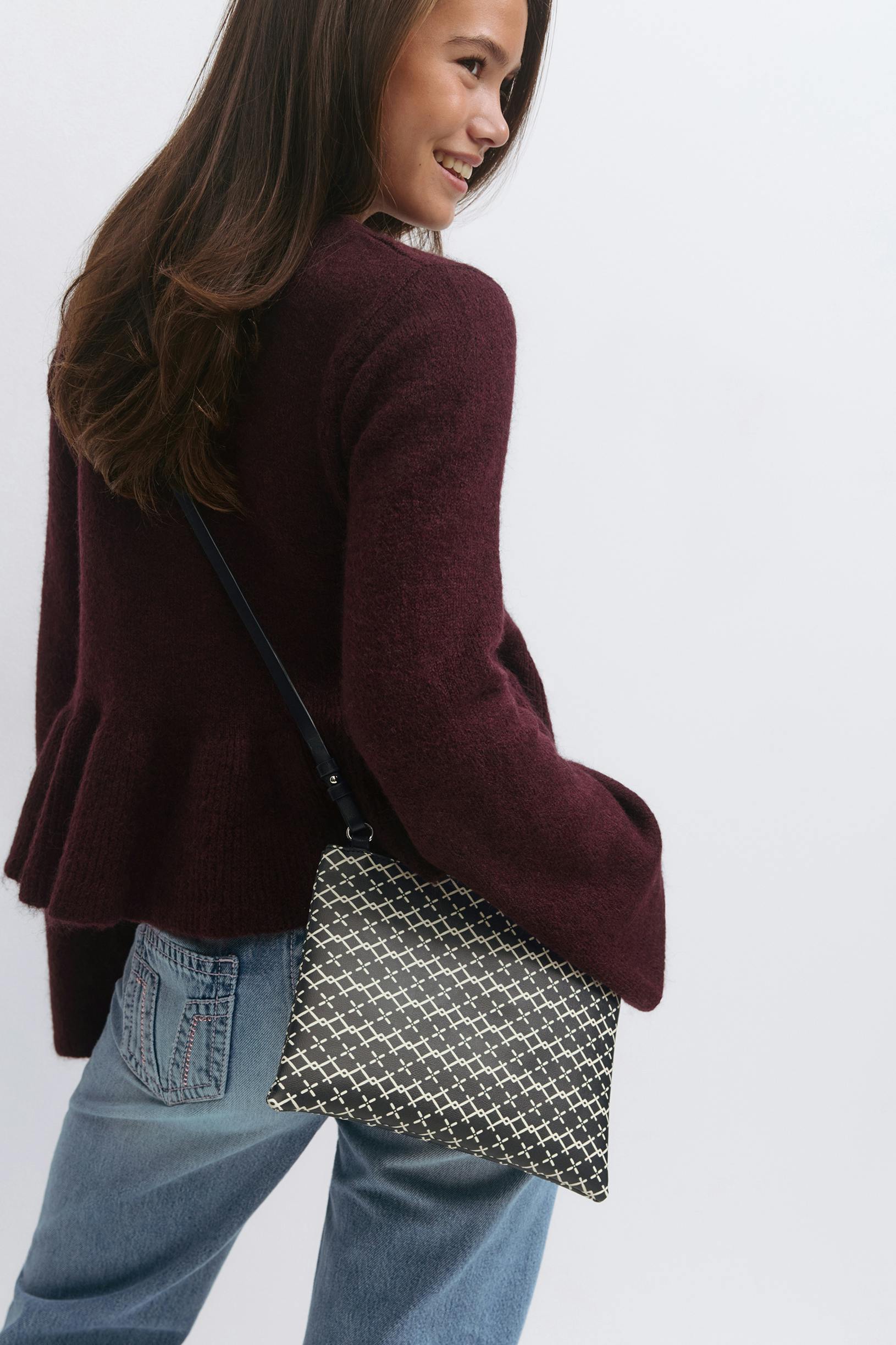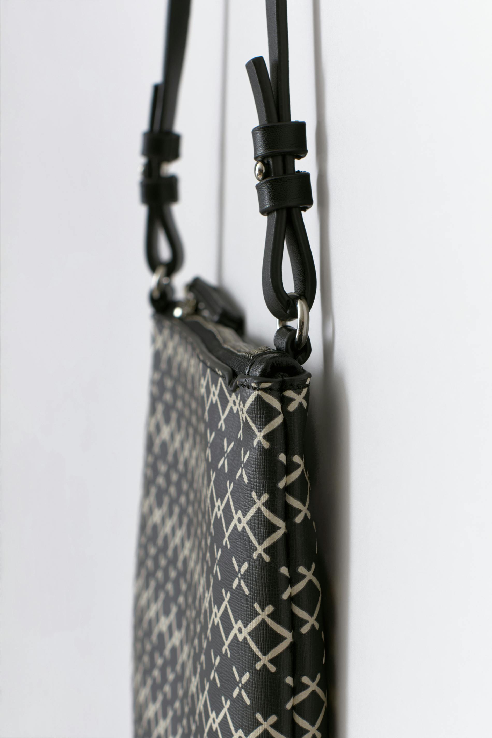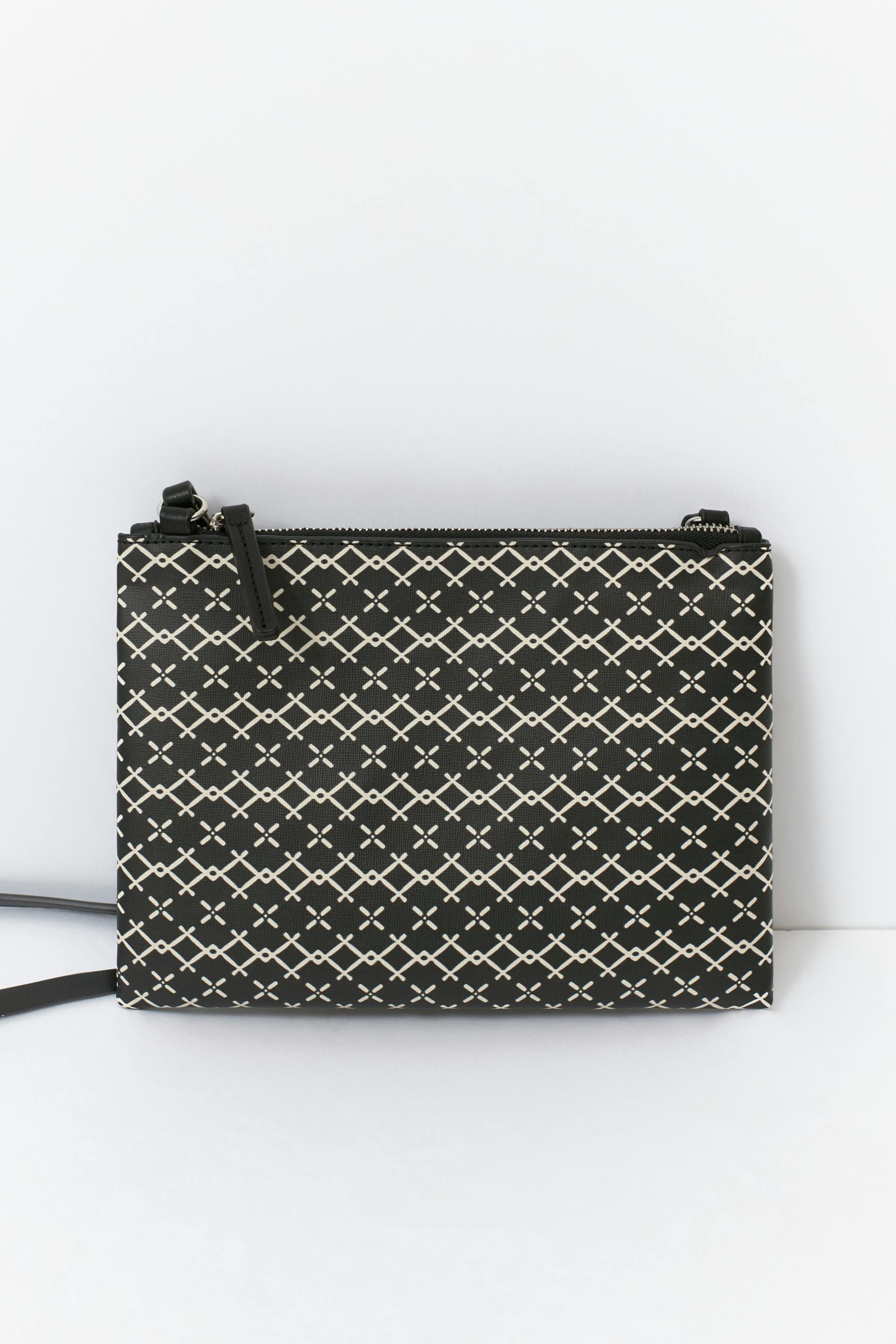 Mönstrad kuvertväska med lång, avtagbar axelrem. Kuvertväskan är svart och vit och har dragkedjestängning upptill.
