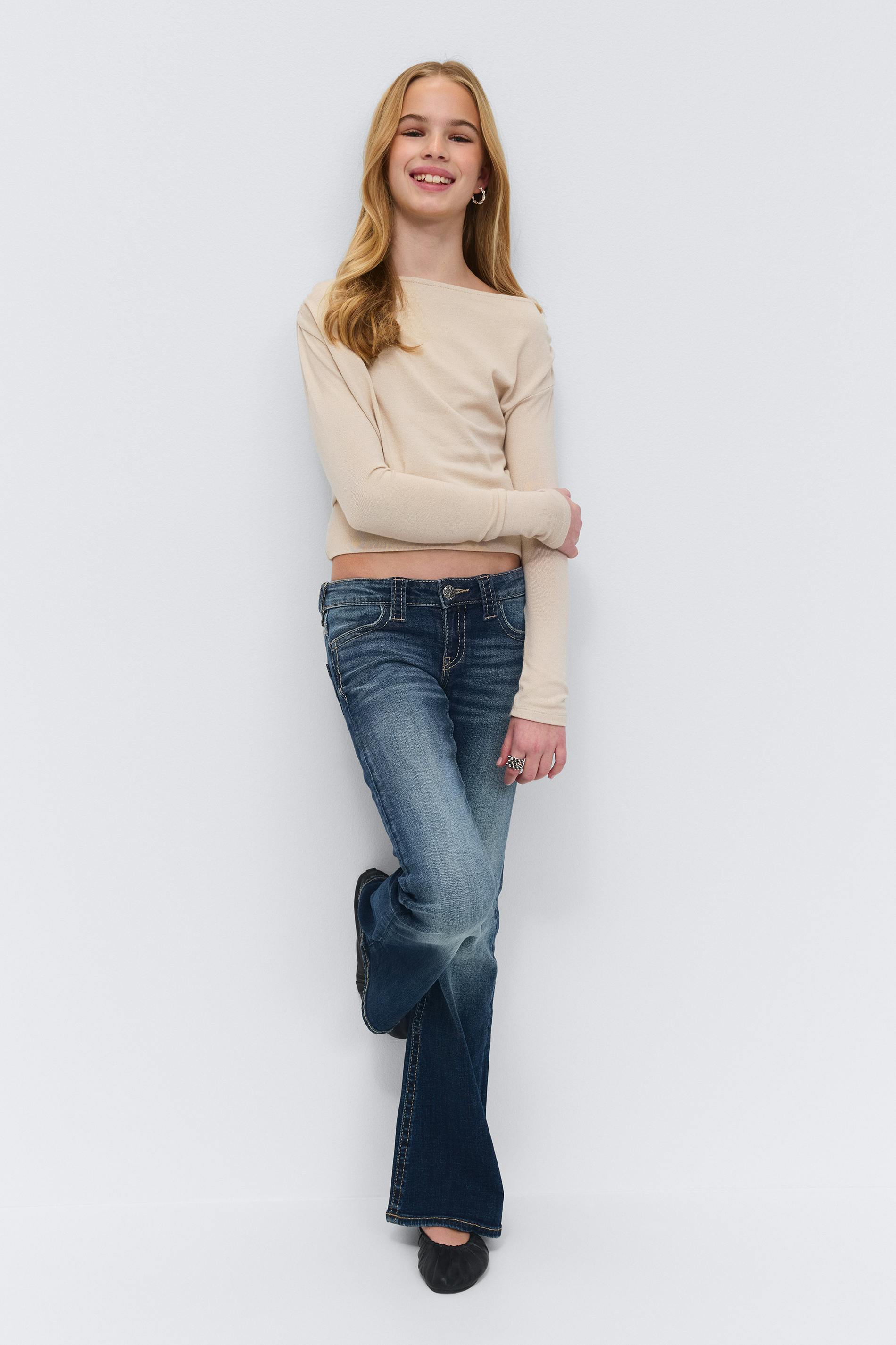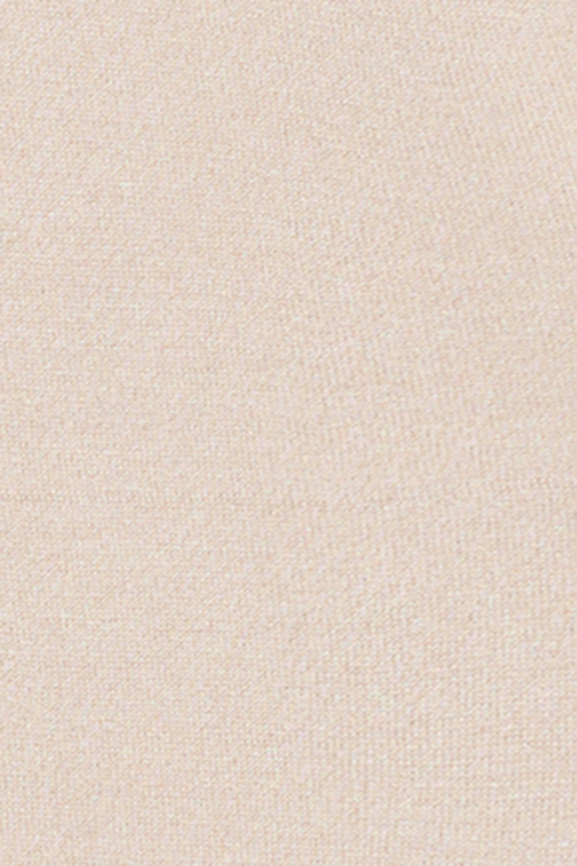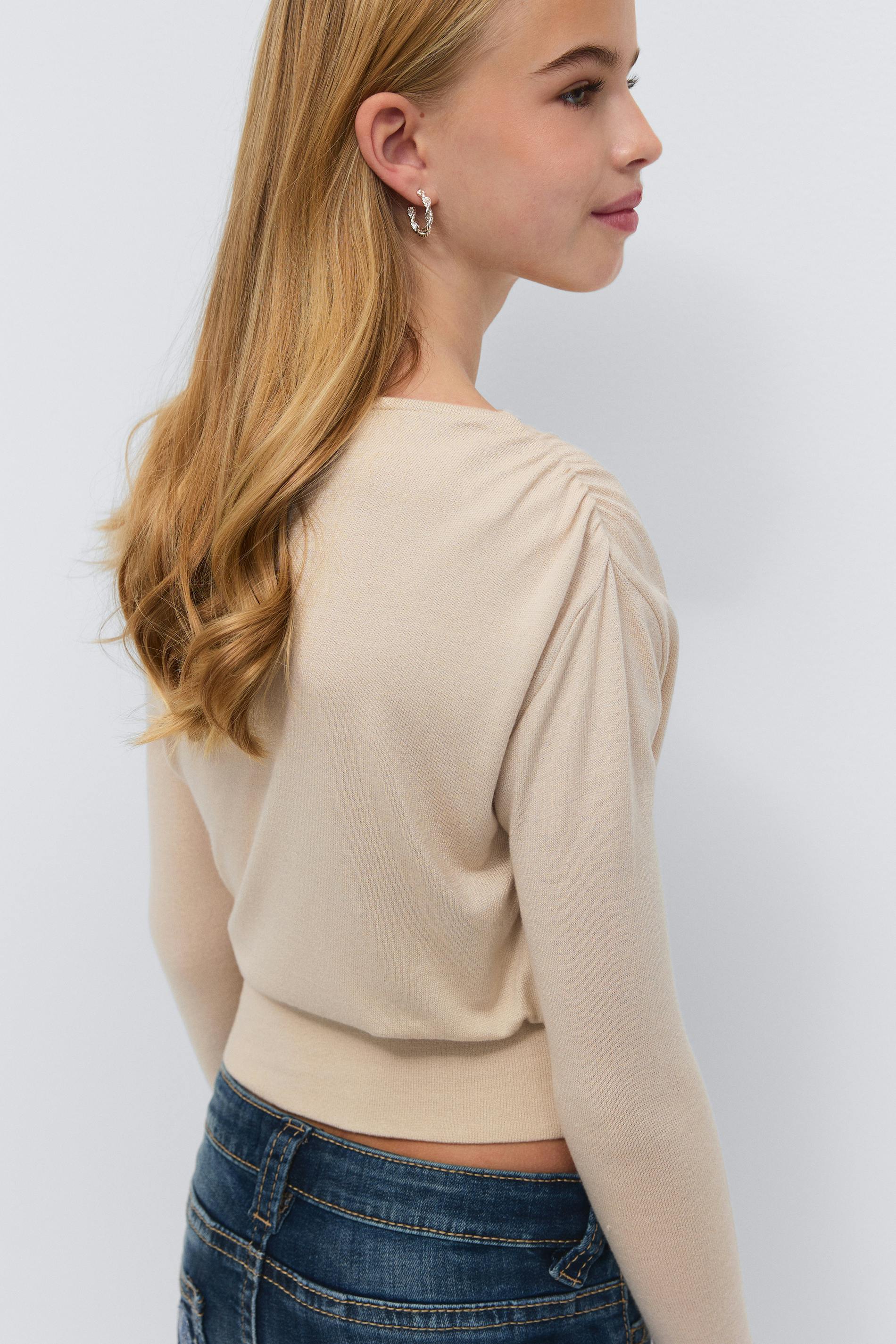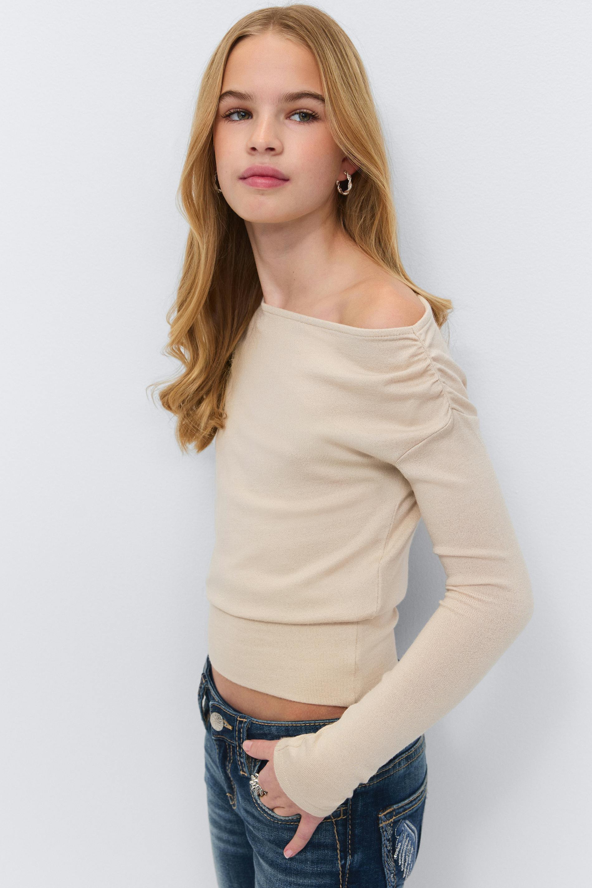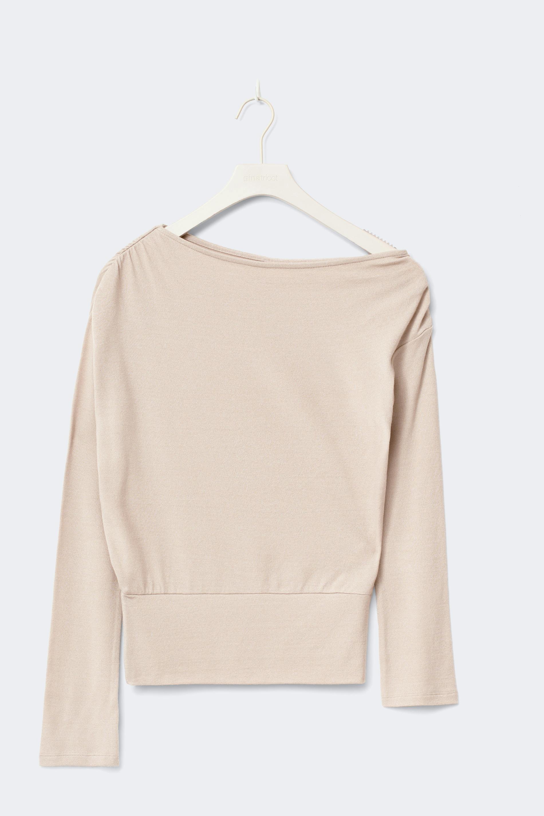 Långärmad topp med båtringning. Toppen är beige och har nerhasade axlar med rynkade detaljer. Den har åtsittande passform och mjuk kvalitet.