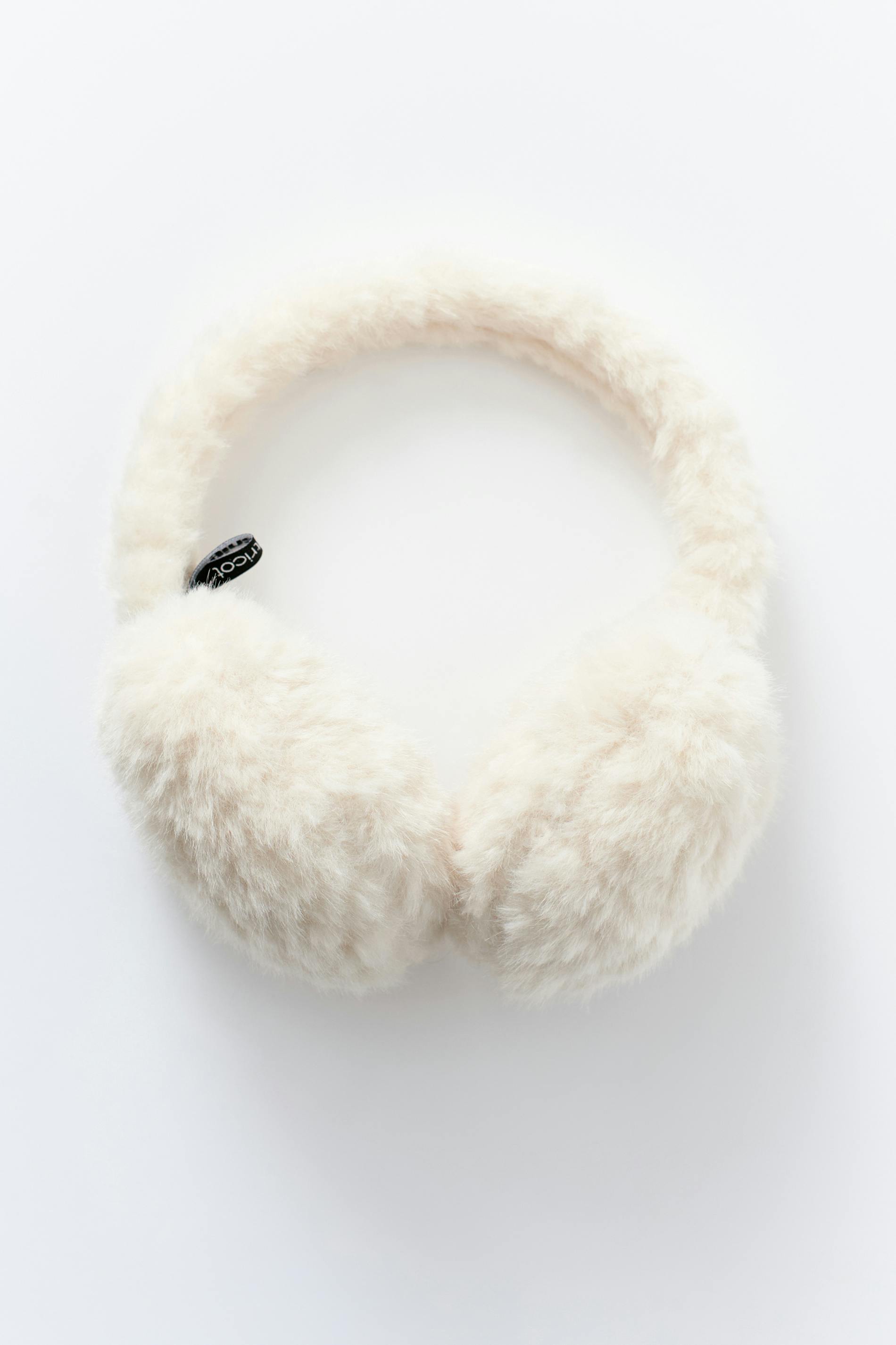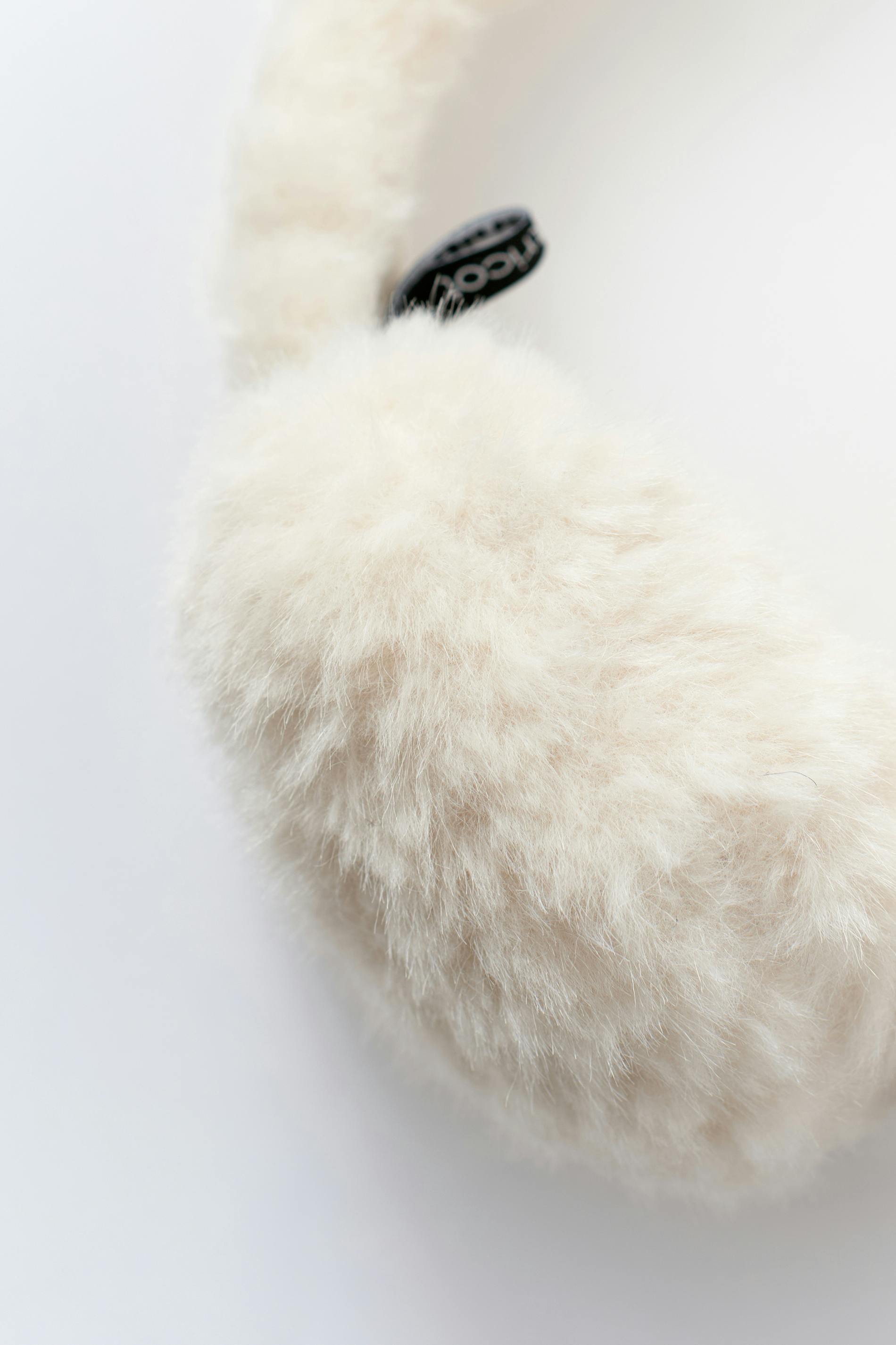 Öronmuffar med ett fluffigt, mjukt teddy-material. Öronmuffarna är vita och har en bygel upptill.