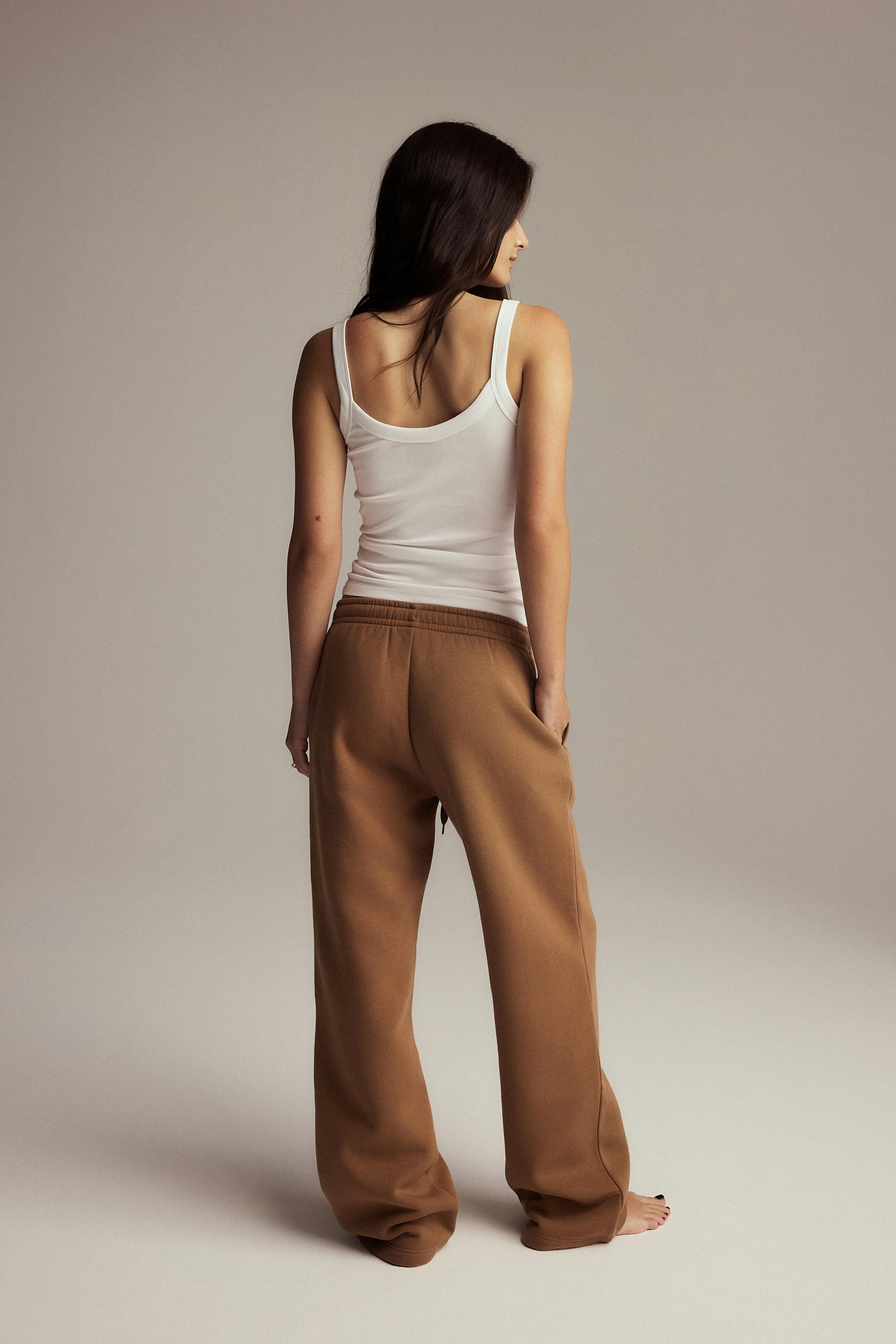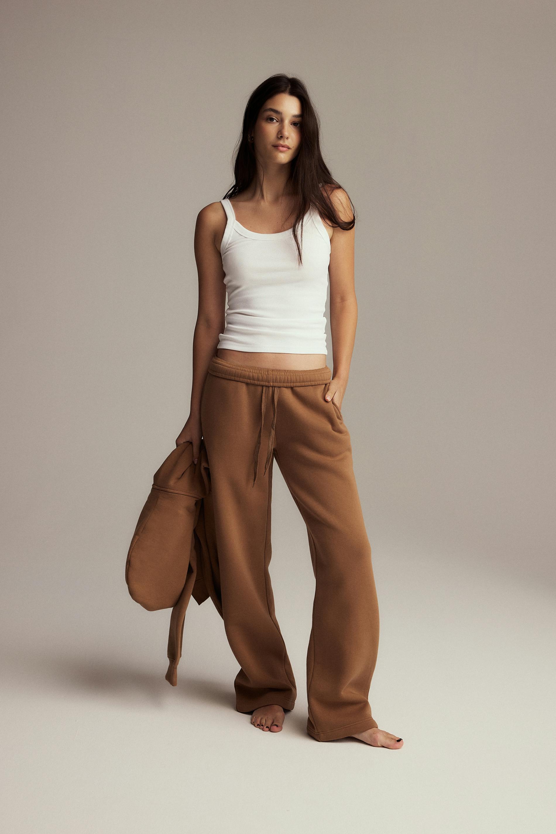 Mjukisbyxor med normal passform. Byxorna är bruna och har fickor i sidorna. De har raka ben och resår i midjan med knytning framtill.