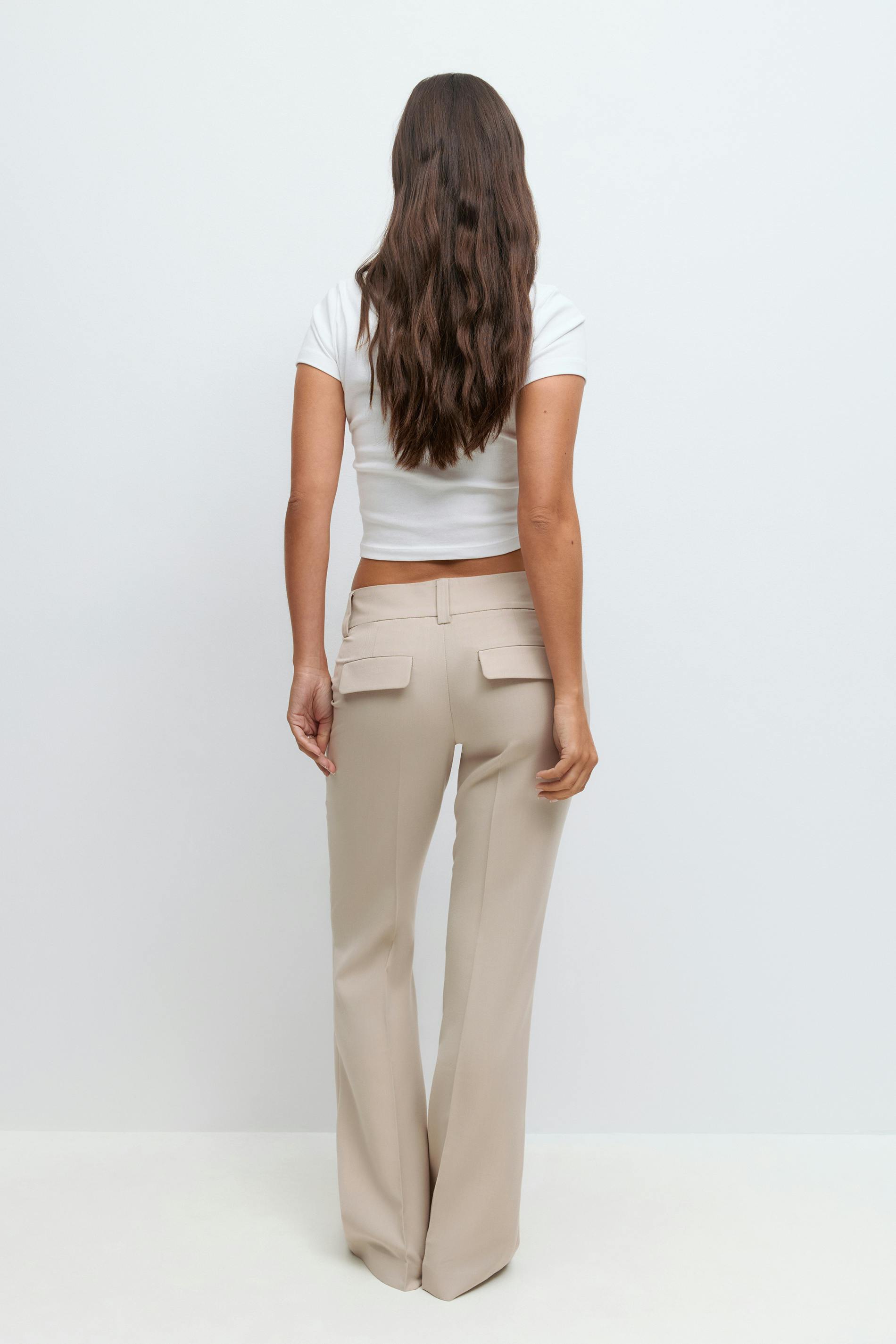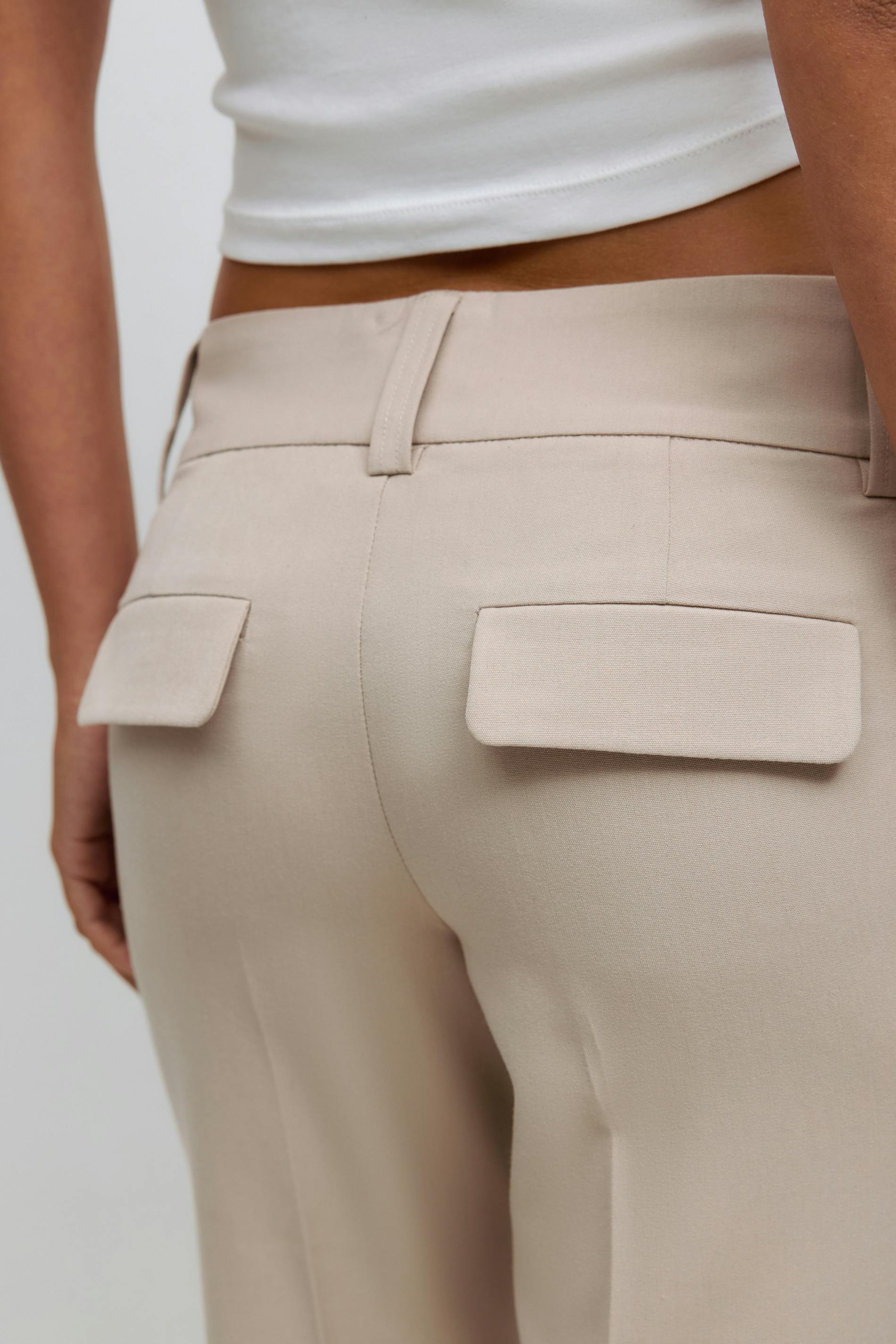 Lågmidjade kostymbyxor med utsvängda ben. Byxorna är ljusbeigea och har en ficka med lock bak. De har en dekorativ söm ner längs framsidan och en figurnära passform.