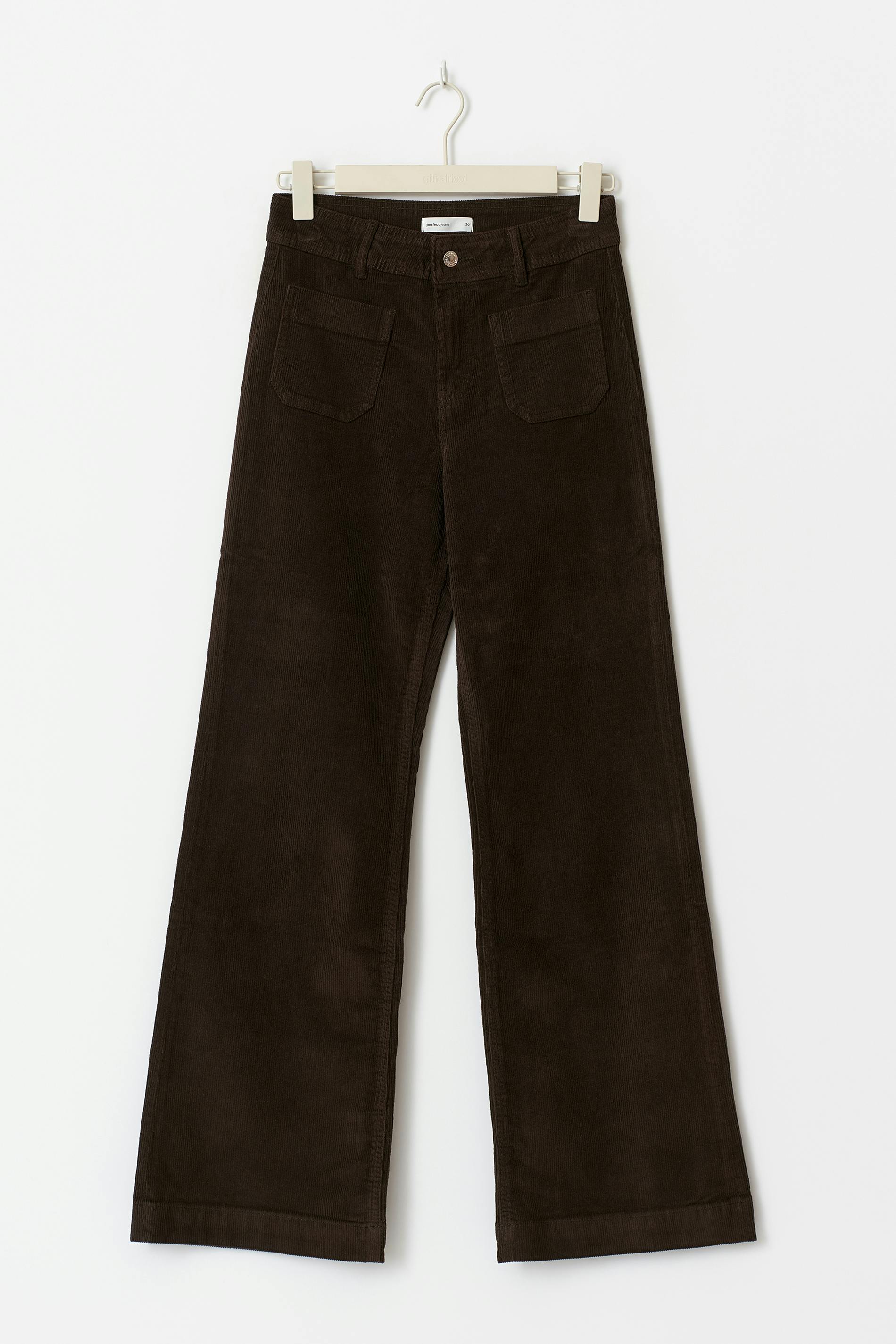 Petite manchesterbyxor med extra långa ben. Byxorna är bruna och har hög midja. De har utsvängda ben, figurnära passform, påsydda framfickor, dragkedjegylf, bälteshällor och stretchig kvalitet. Passar för dig som är 160 cm eller kortare.