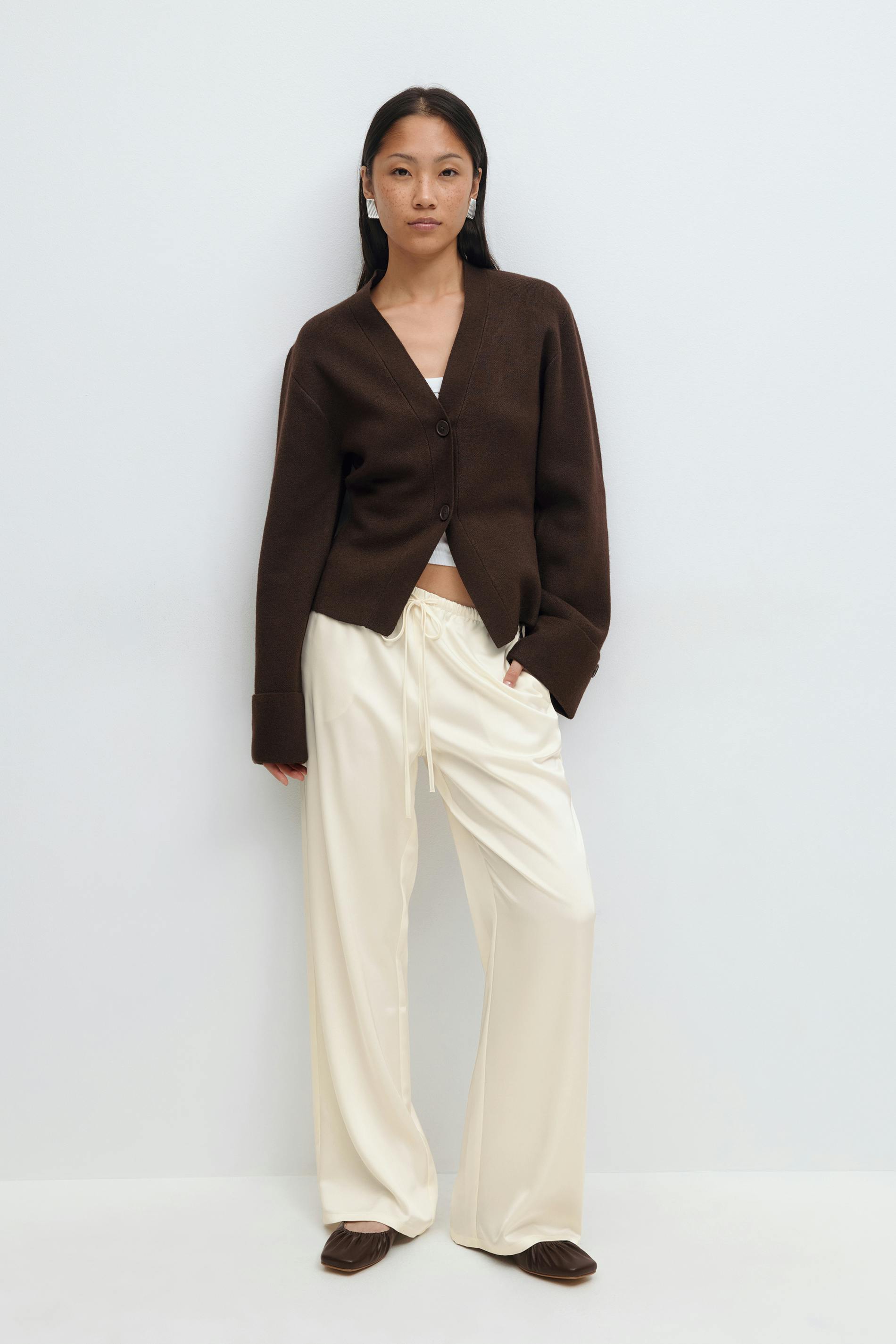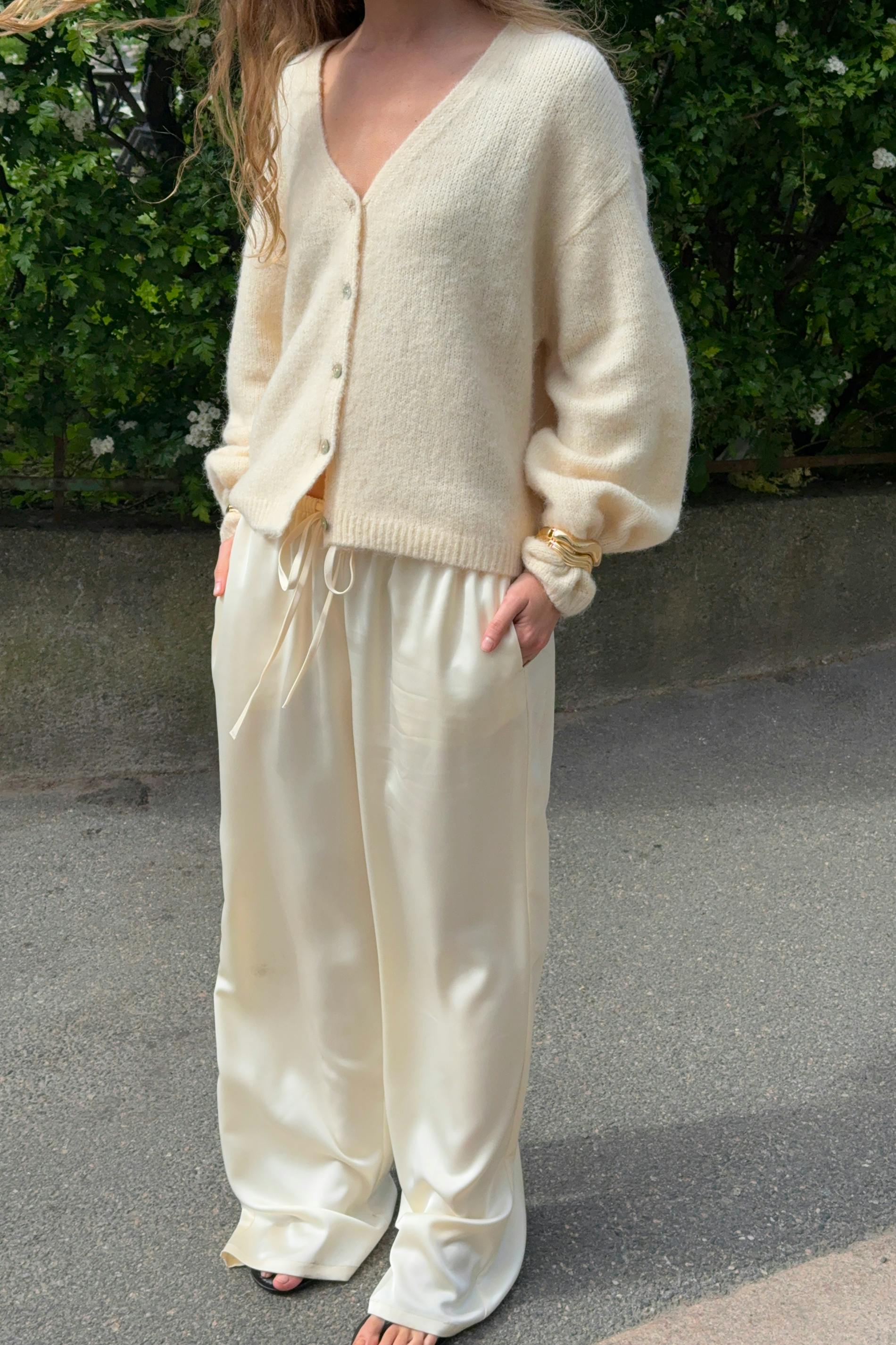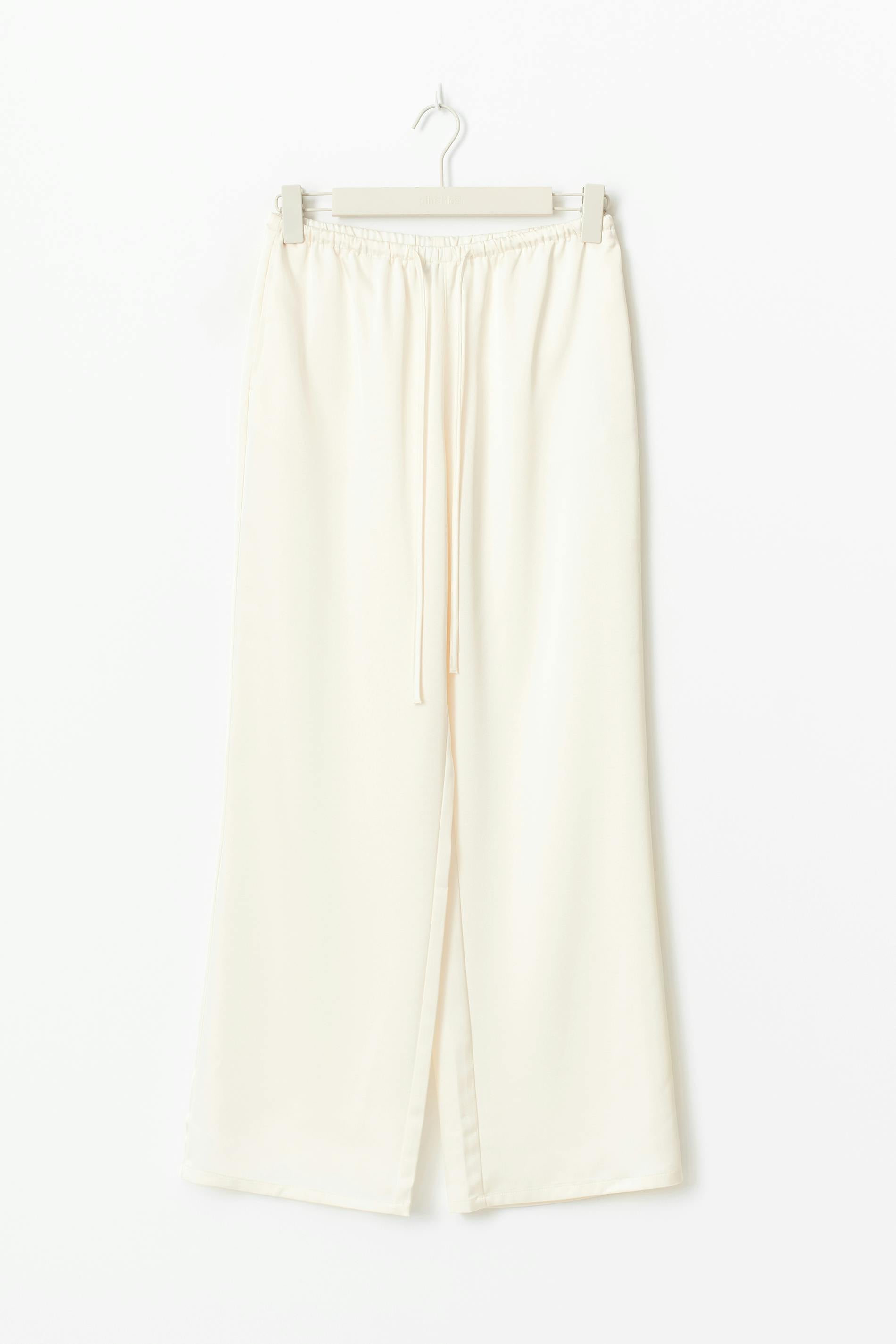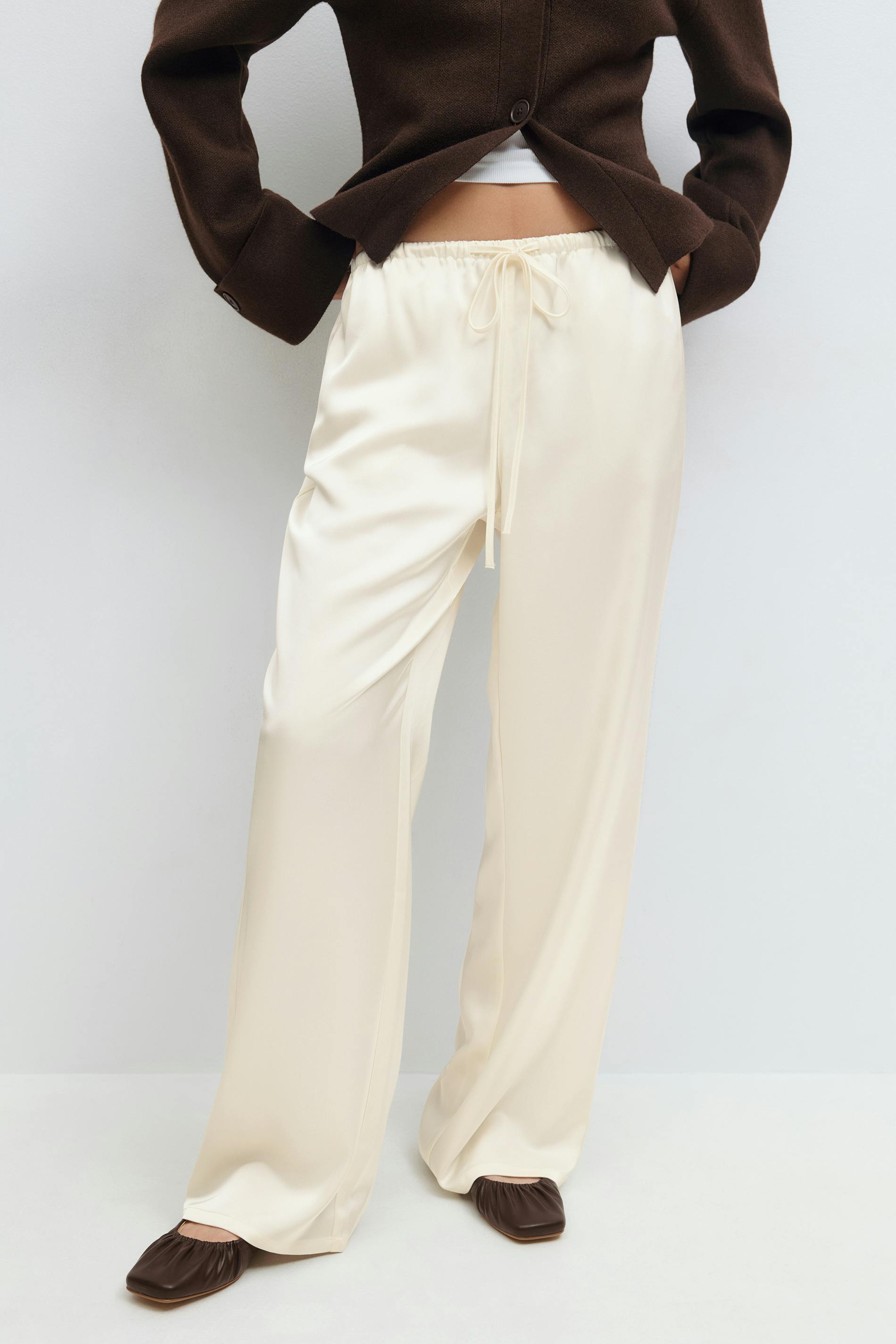 Satinbyxor med knytning fram. Byxorna är krämfärgade och har resår i midjan. De har raka ben, fickor i sidorna, glansig kvalitet, medelhög midja och normal passform.
