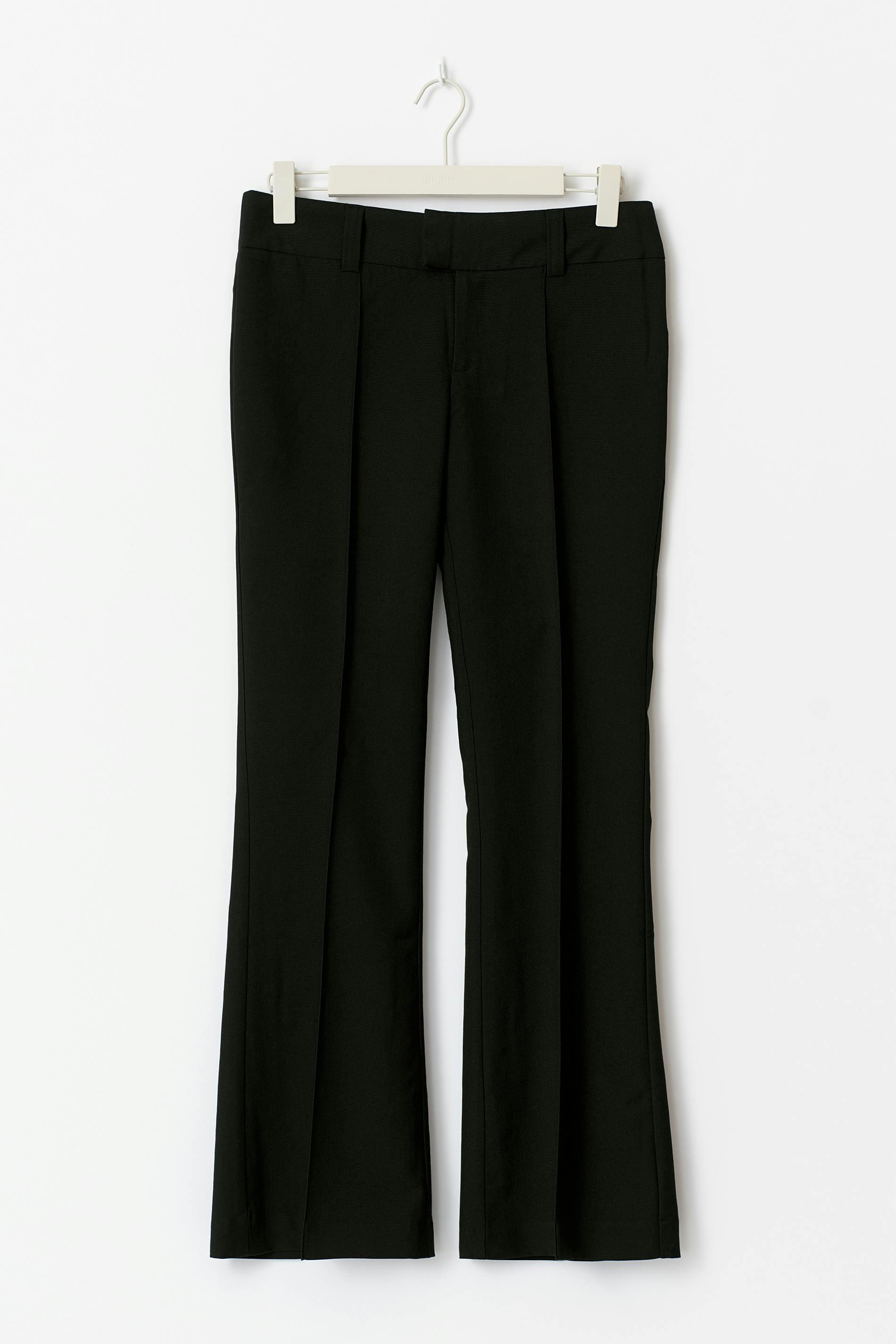 Petite kostymbyxor med utsvängda ben. Byxorna är svarta och lågmidjade och har pressveck framtill. De har fickor i sidorna, figurnära passform, bälteshällor och kortare benlängd. Passar för dig som är 160 cm eller kortare.