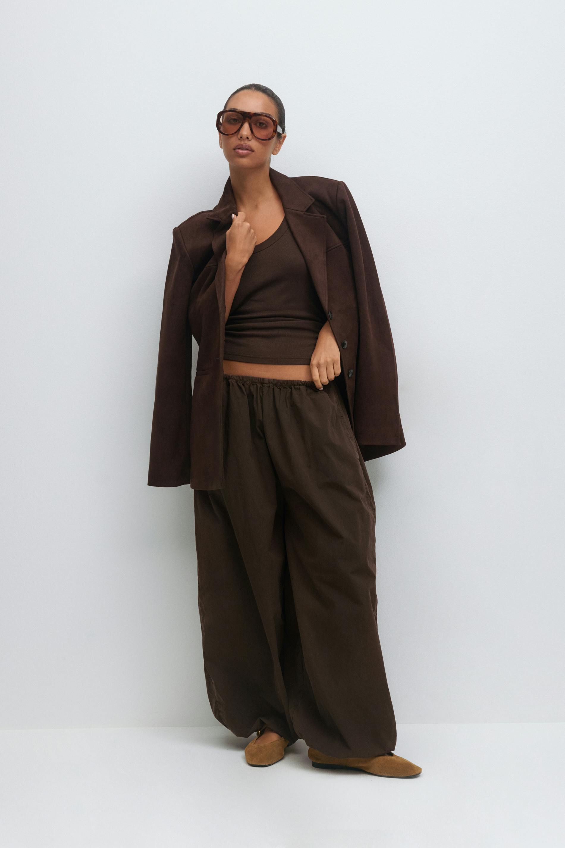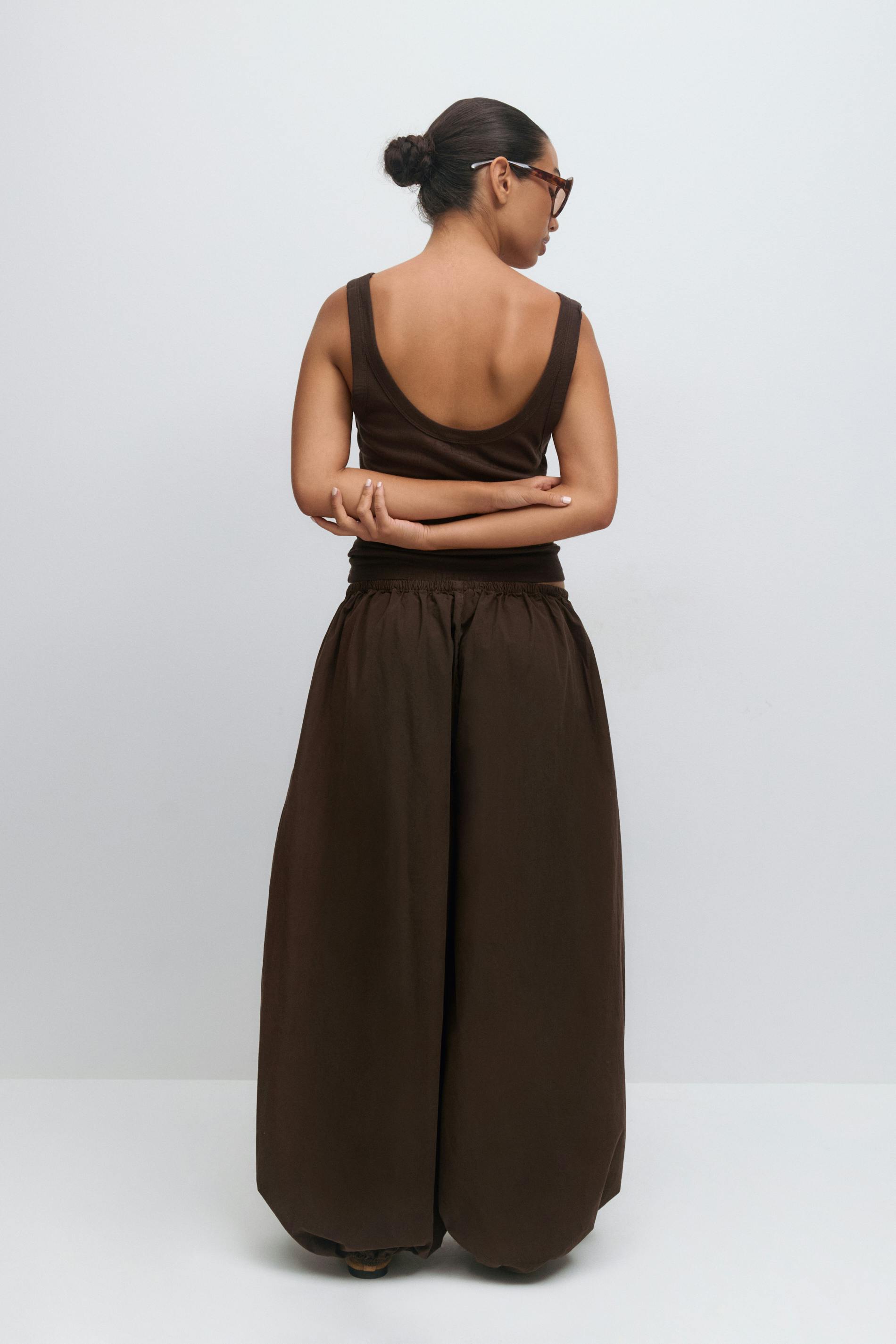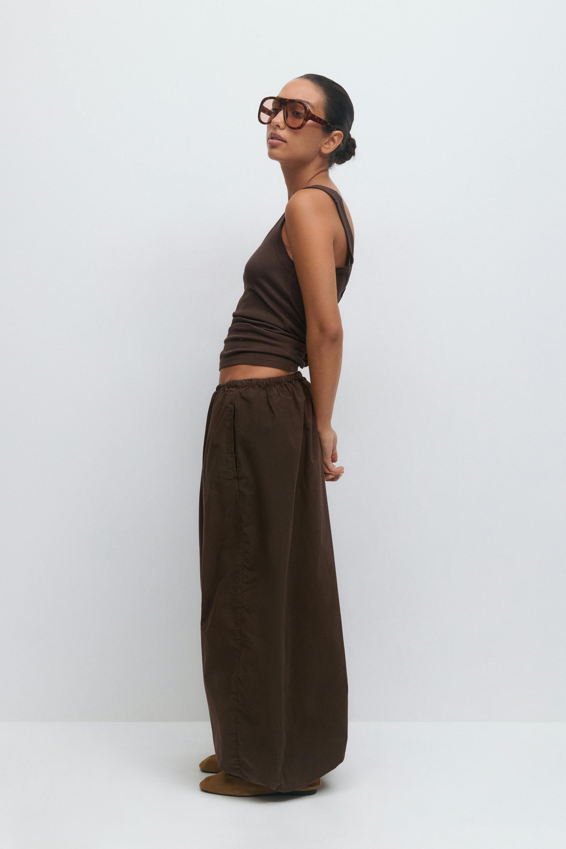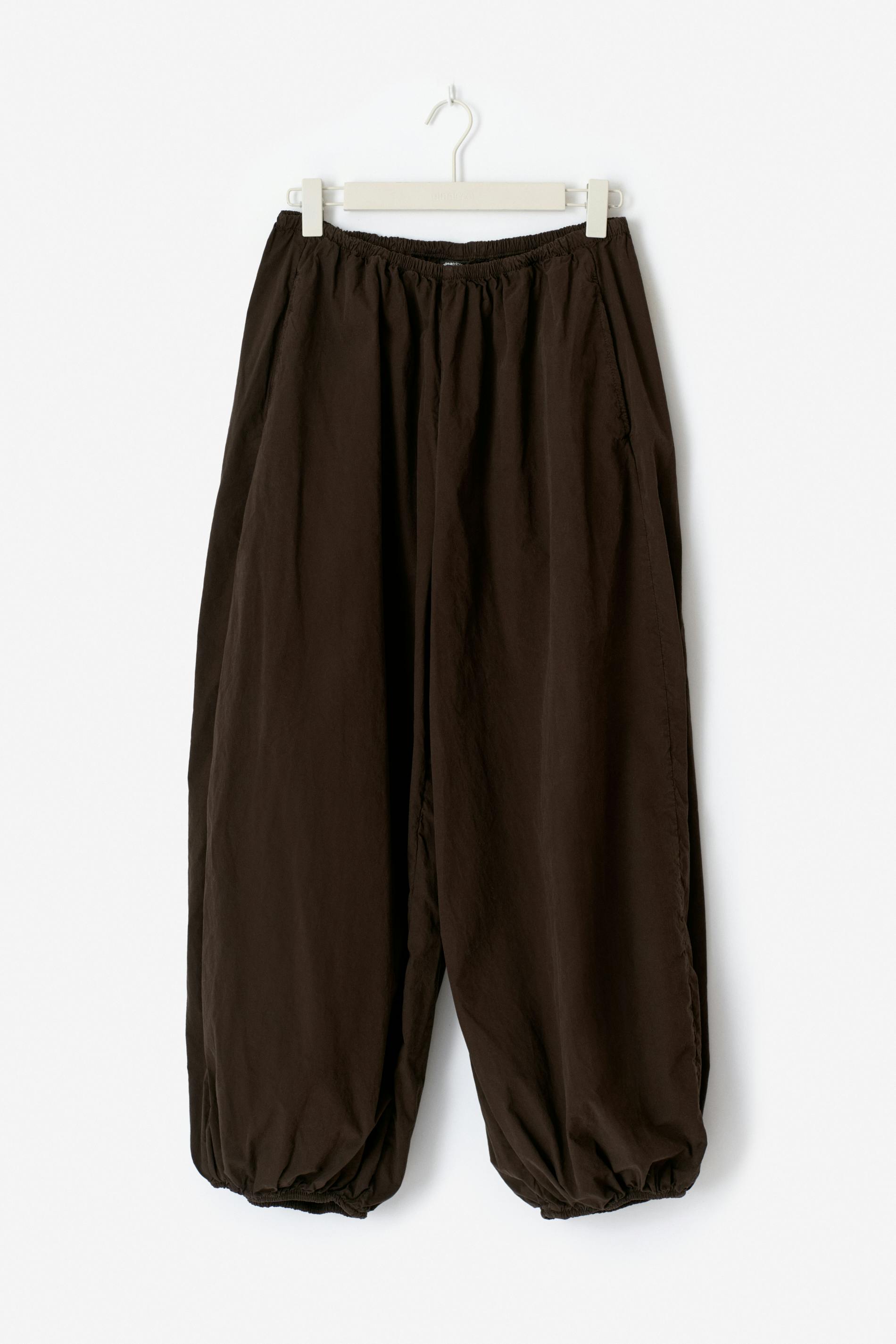 Ballongbyxor i bomull med lös passform. Ballongbyxorna är bruna och har resår i midjan och vid bensluten. De har vida ben med normallängd, fickor i sidorna och medelhög midja.