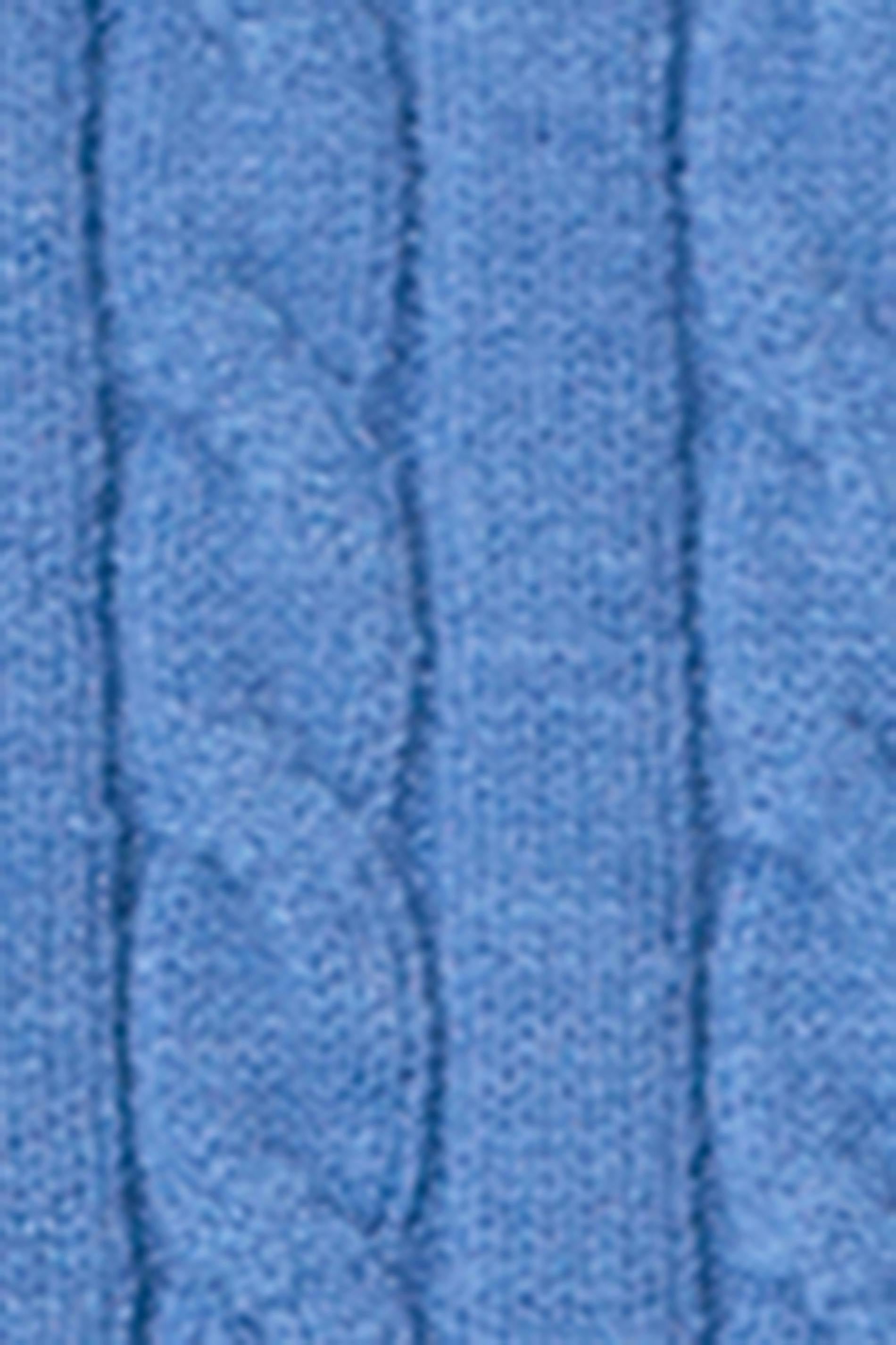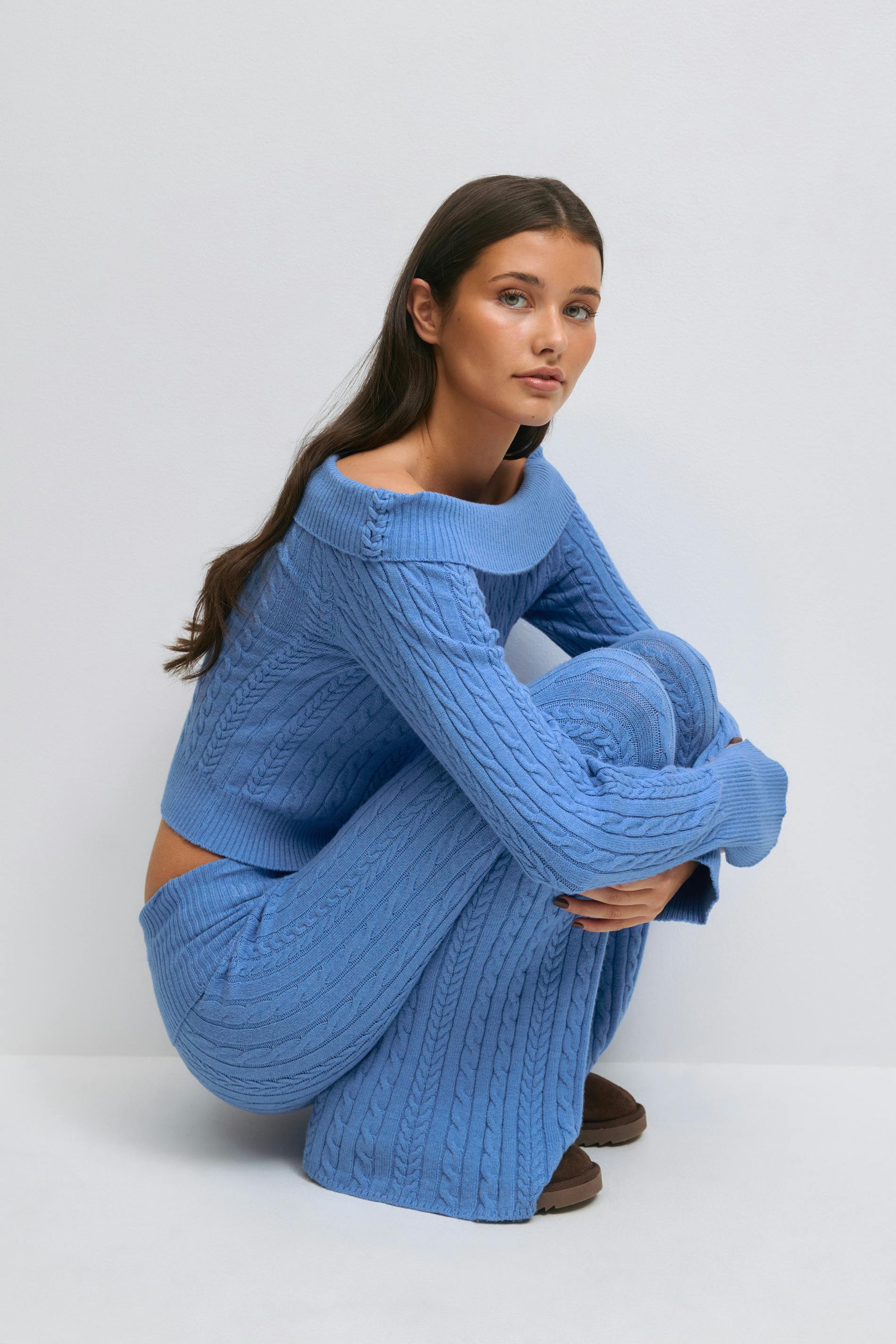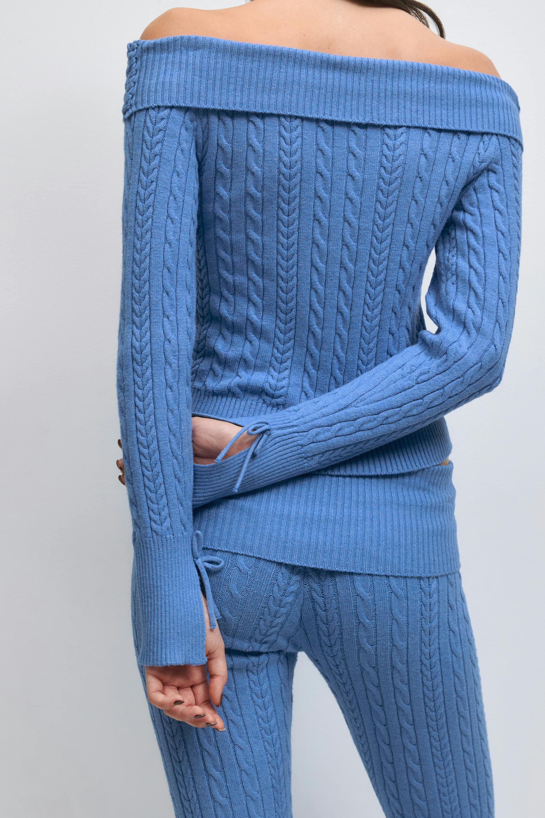 Kabelstickad off shoulder topp med en lång ärm. Toppen är blå och har en lös passform. Den har en nervikt ovankant.