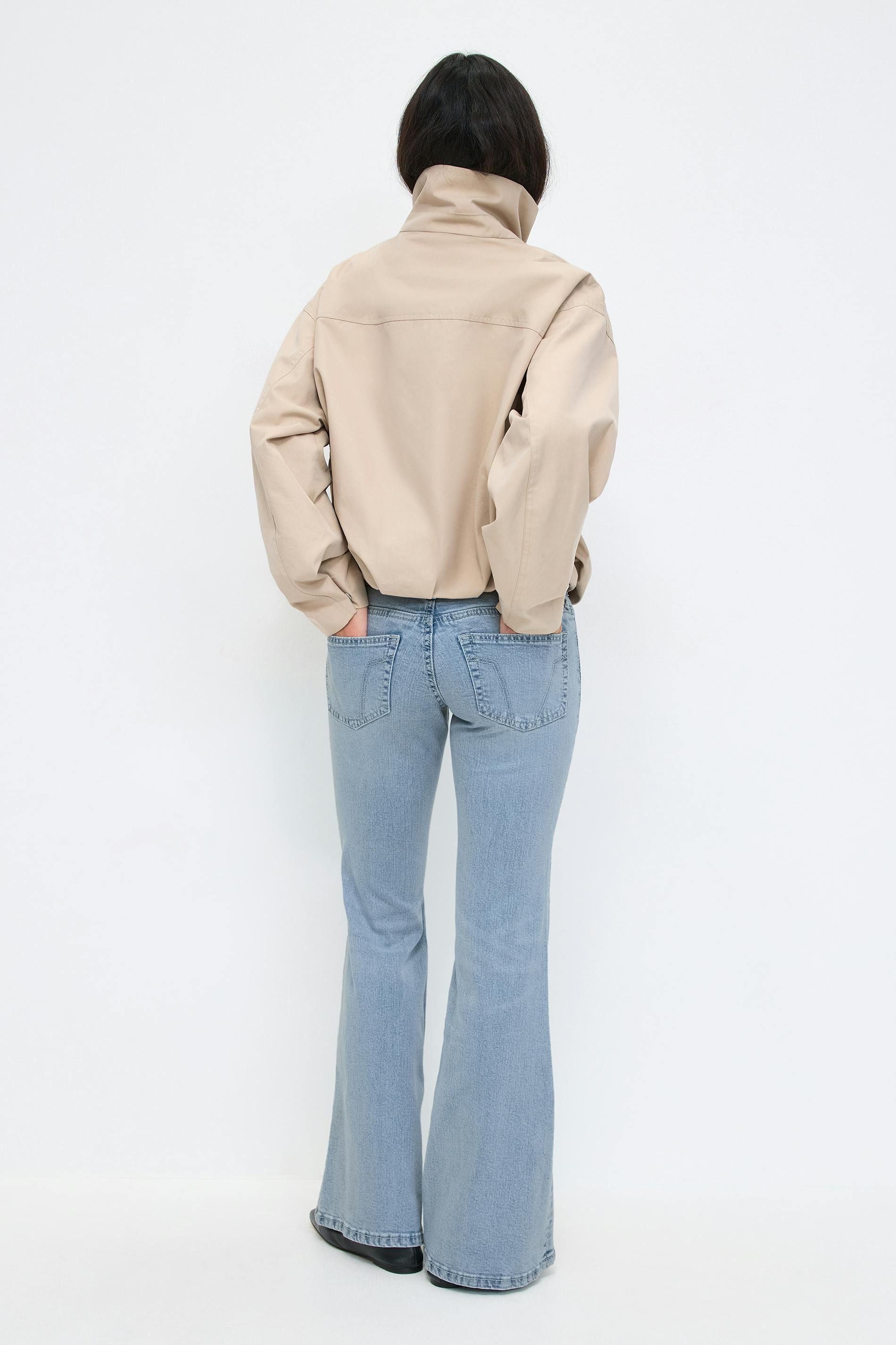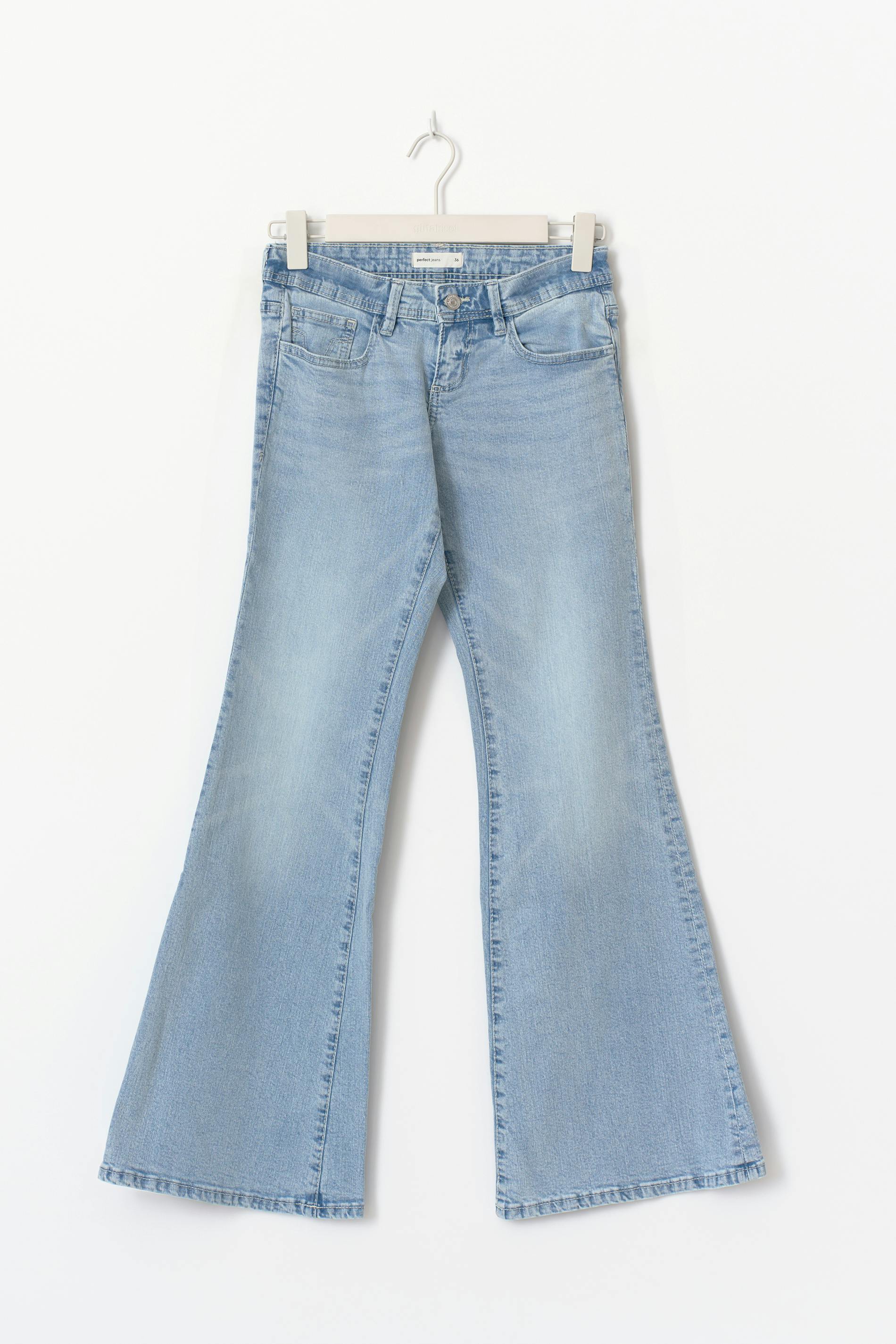 Flare jeans med låg midja. Jeansen är ljusblåa och har utsvängda ben med normallängd. De har figurnära passform, dekorativa sömmar, dragkedjegylf, bälteshällor, stretchig kvalitet och fickor fram och bak. Se gärna vår storleksguide för att hitta din storl
