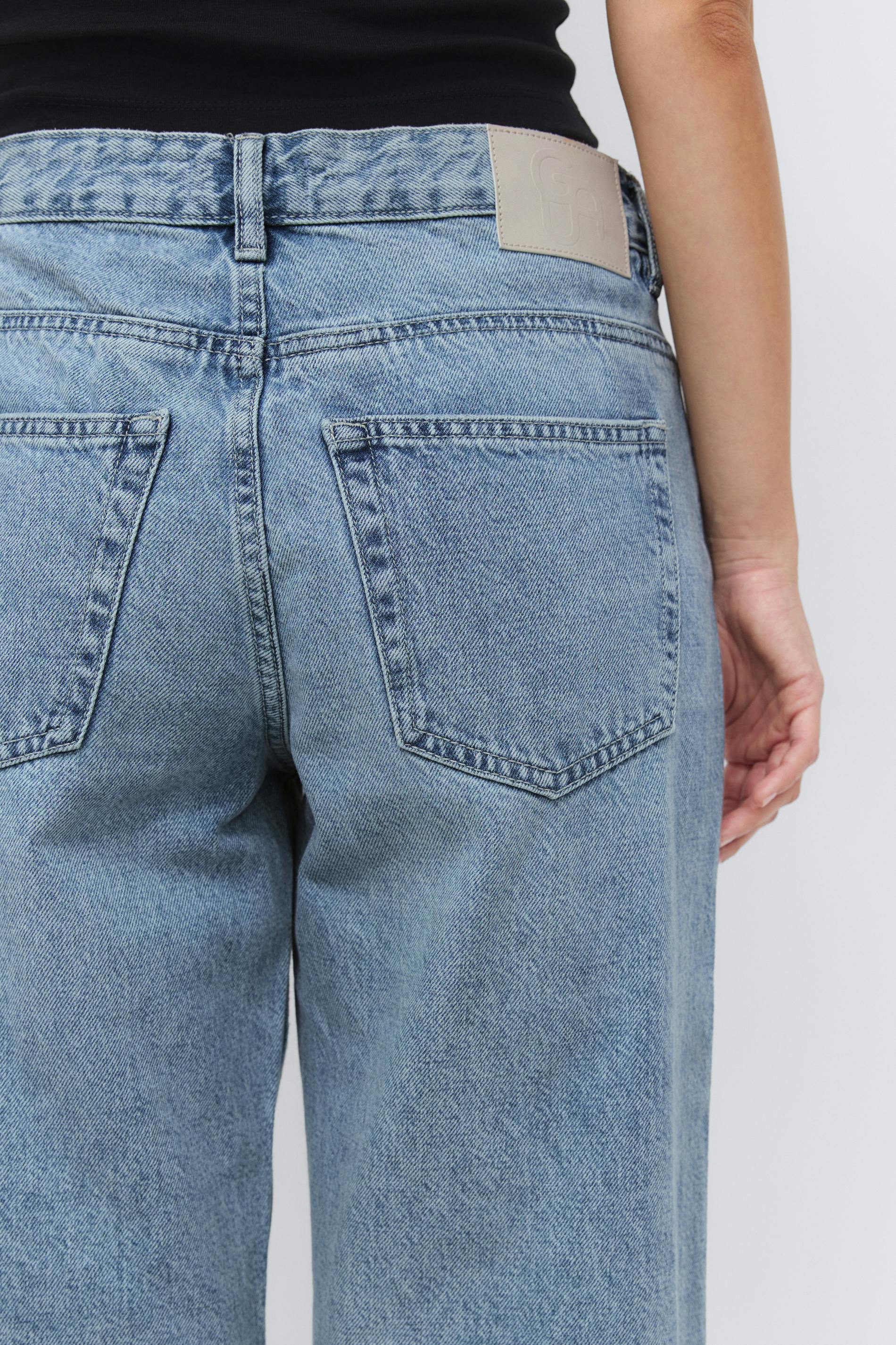 Boyfriend jeans med låg midja. Jeansen är blåa och har vida ben. De har normal passform, bälteshällor, dragkedjegylf och fickor fram och bak. Utan stretch. Se gärna vår storleksguide för att hitta din storlek.