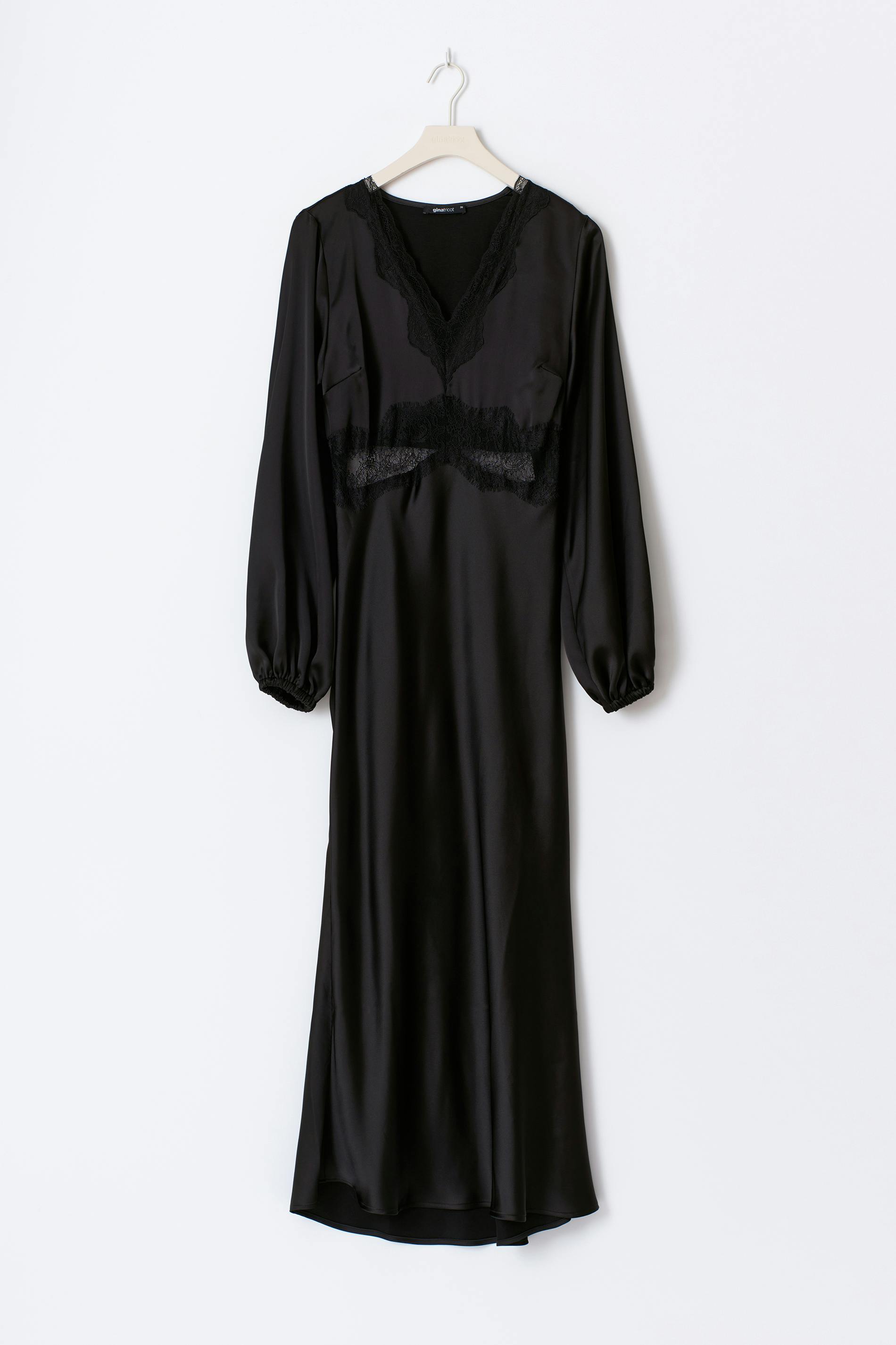 Maxiklänning i satin med ballongärm. Klänningen är svart och har spetsdetaljer vid bysten och i midjan. Den har en v-ringning, dragkedjestängning och en normal passform.