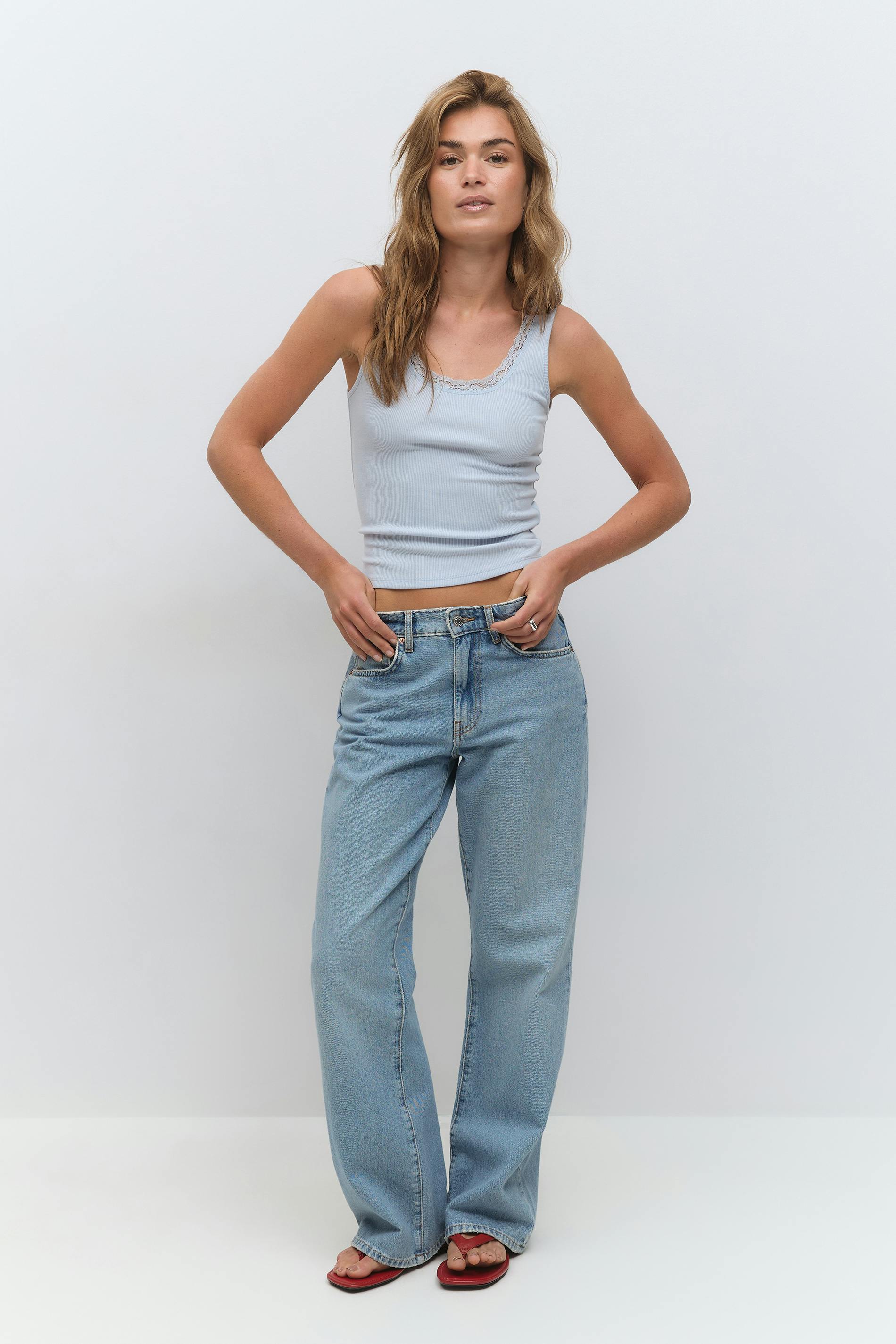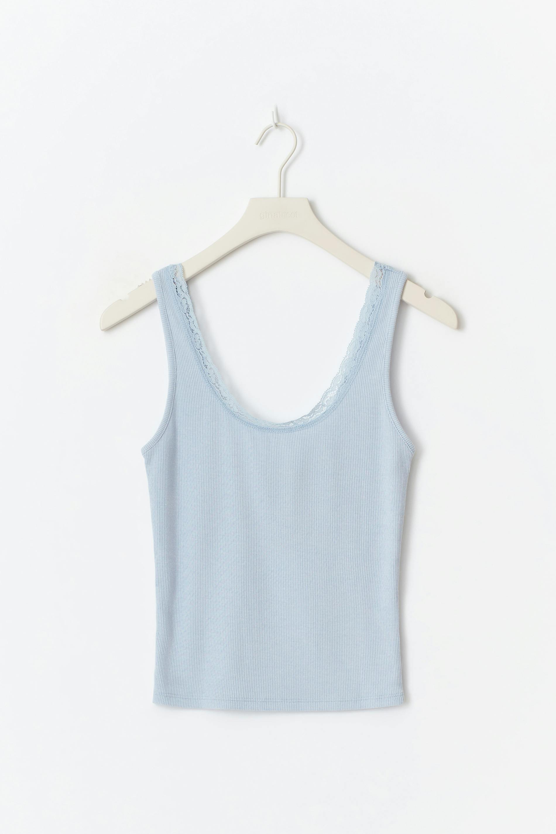 Singlet with lace on the neckline. The singlet is blue and has ribbed quality. It has deep neckline and regular fit.