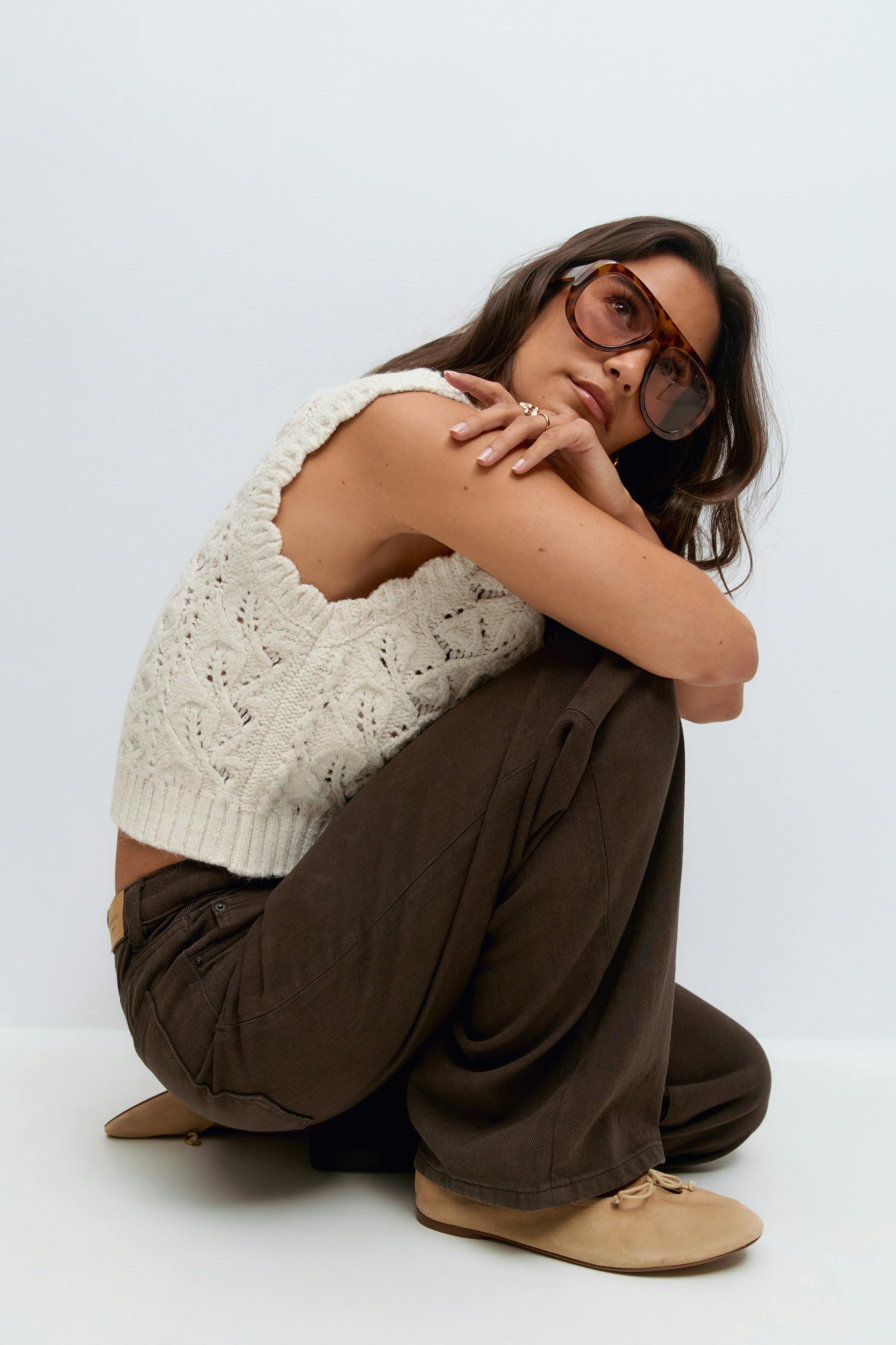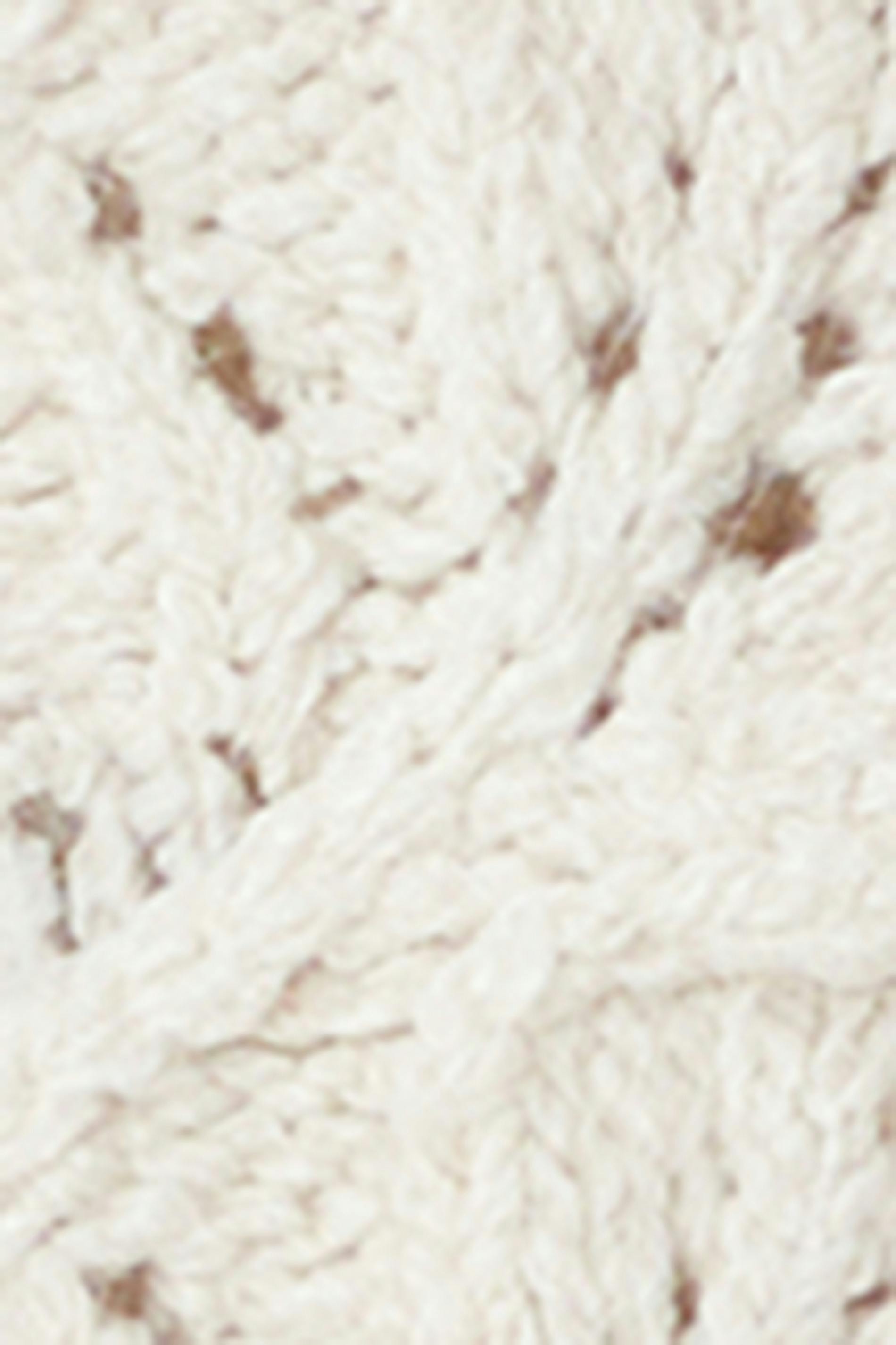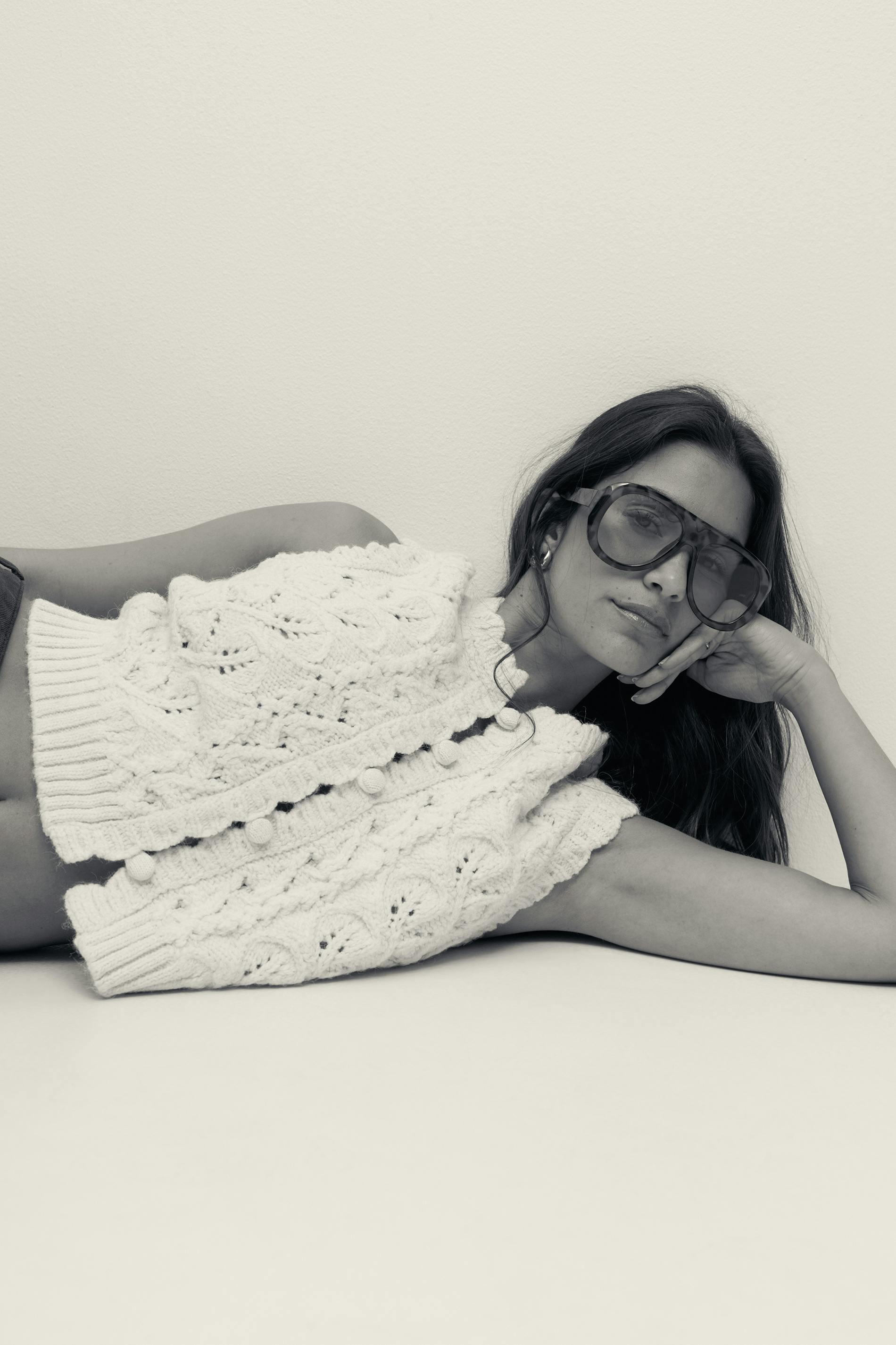 Stickad väst med ett spetsmönster. Västen är naturvit och har en ribbstickning i nederkant. Den har knappar fram.