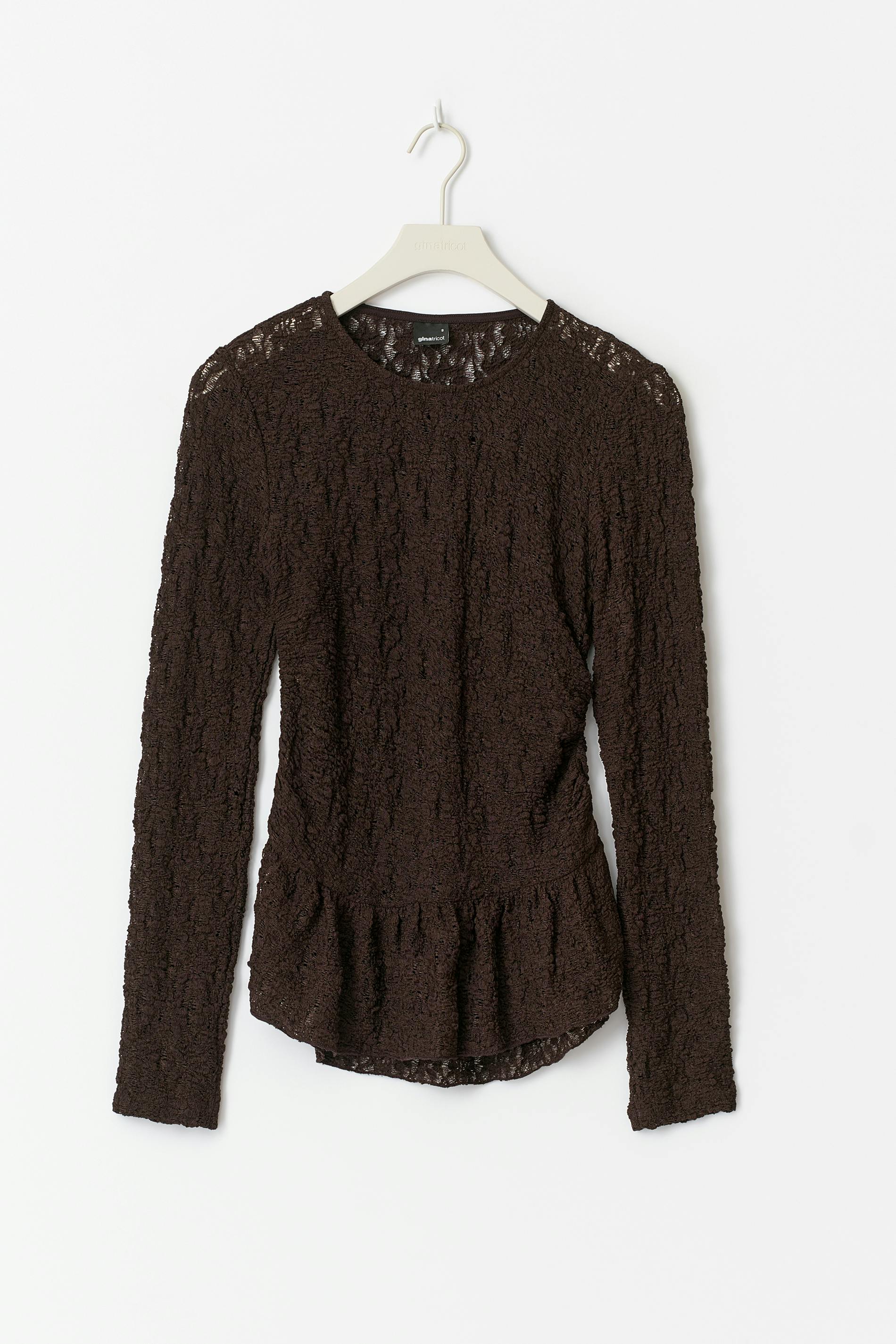 Spetstopp med volang i nederkant. Toppen är brun och har peplum-design. Den har rund halsringning, rynkningar i sidorna, lång ärm och normal passform. Ofodrad.