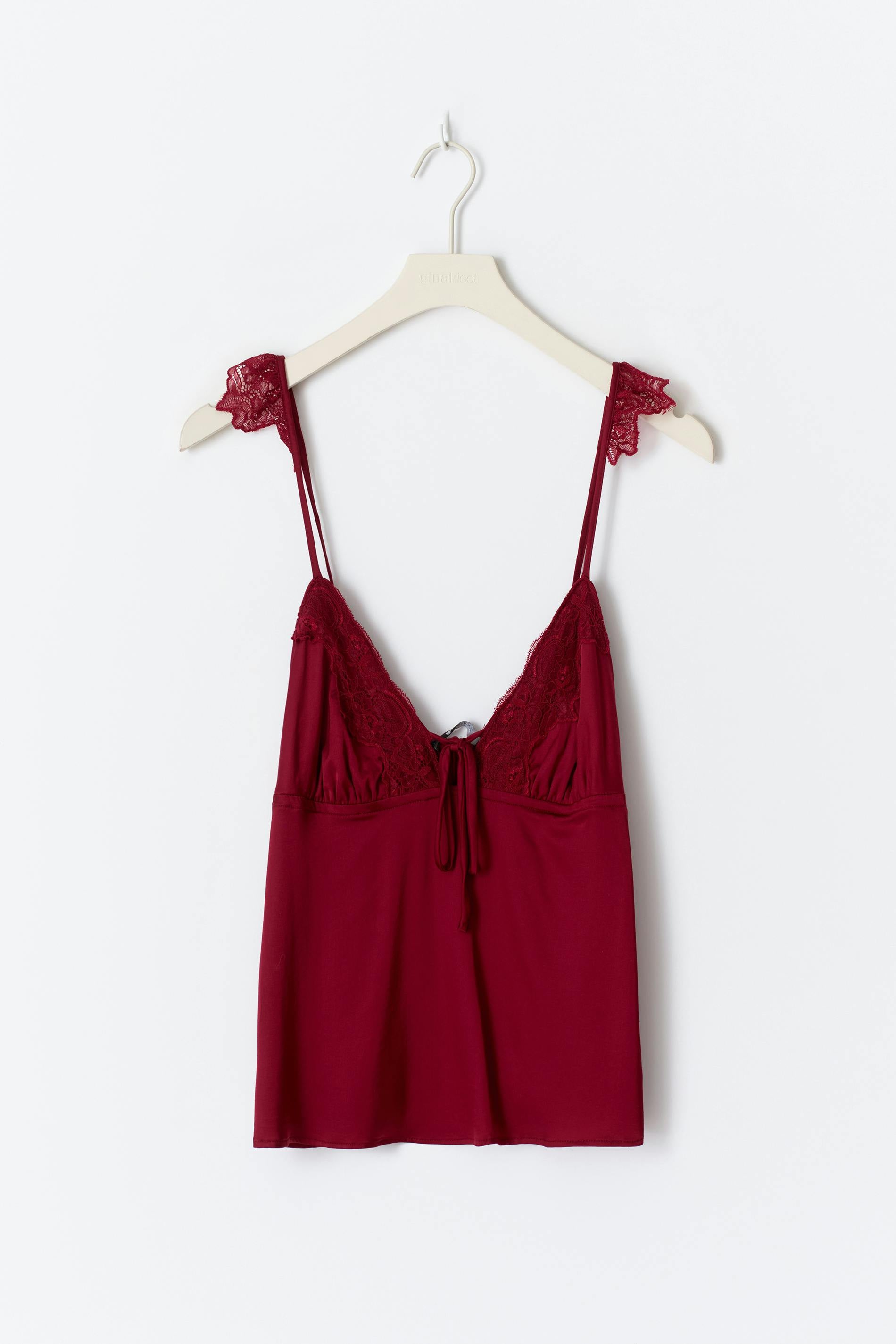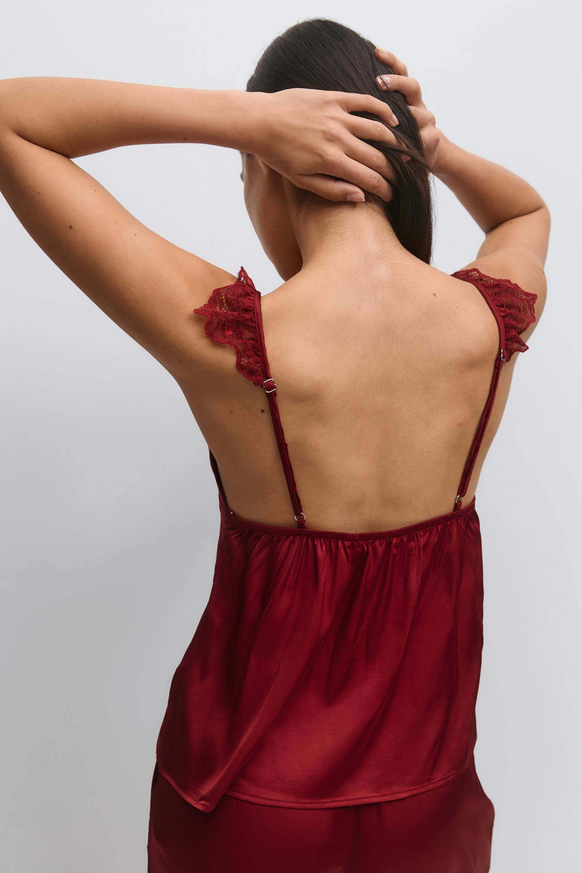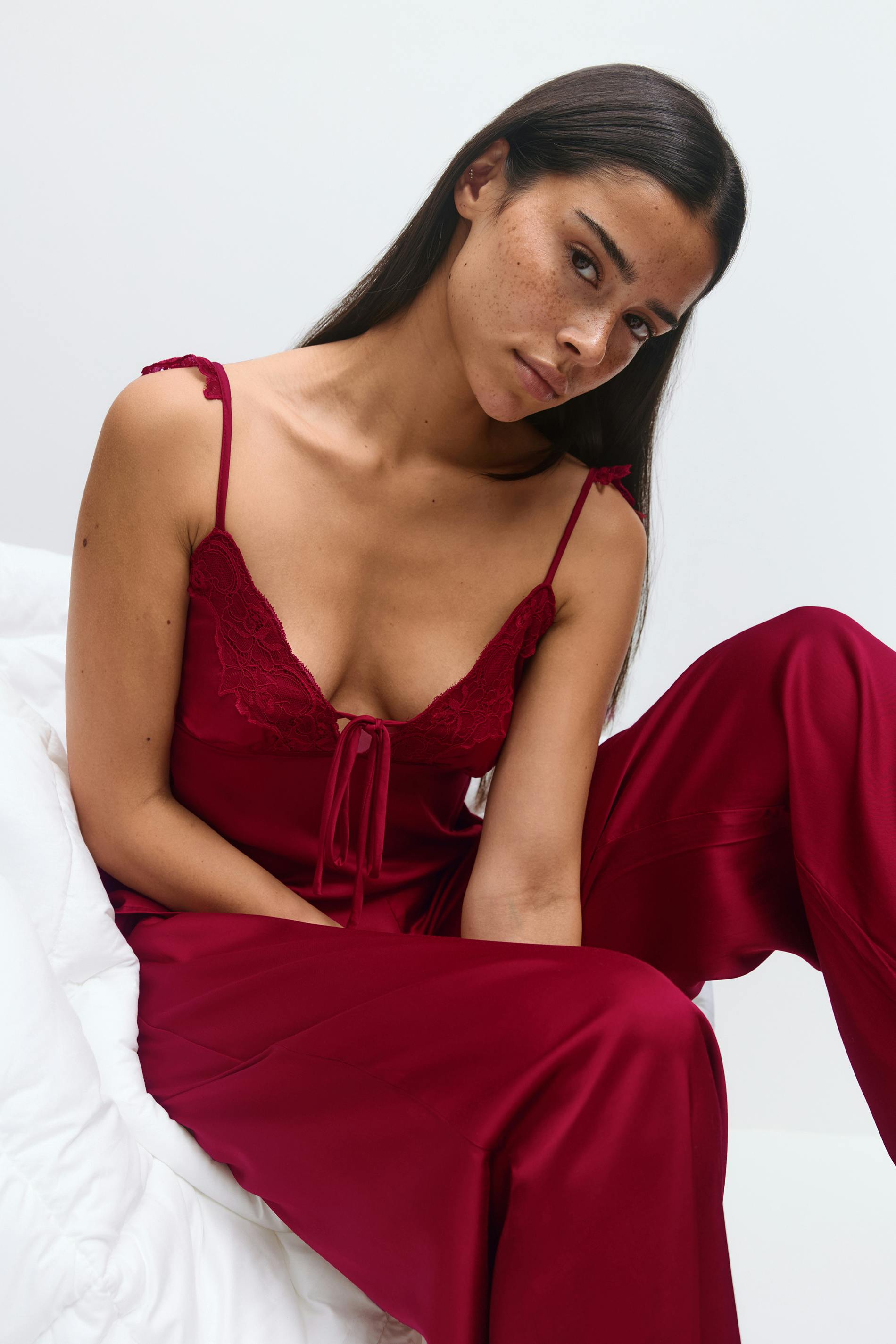Pyjamaslinne i satin med reglerbart axelband. Linnet är mörkrött och har spets upptill. Det har en rosettdetalj på framsidan, en normallängd och en lös passform nedtill.