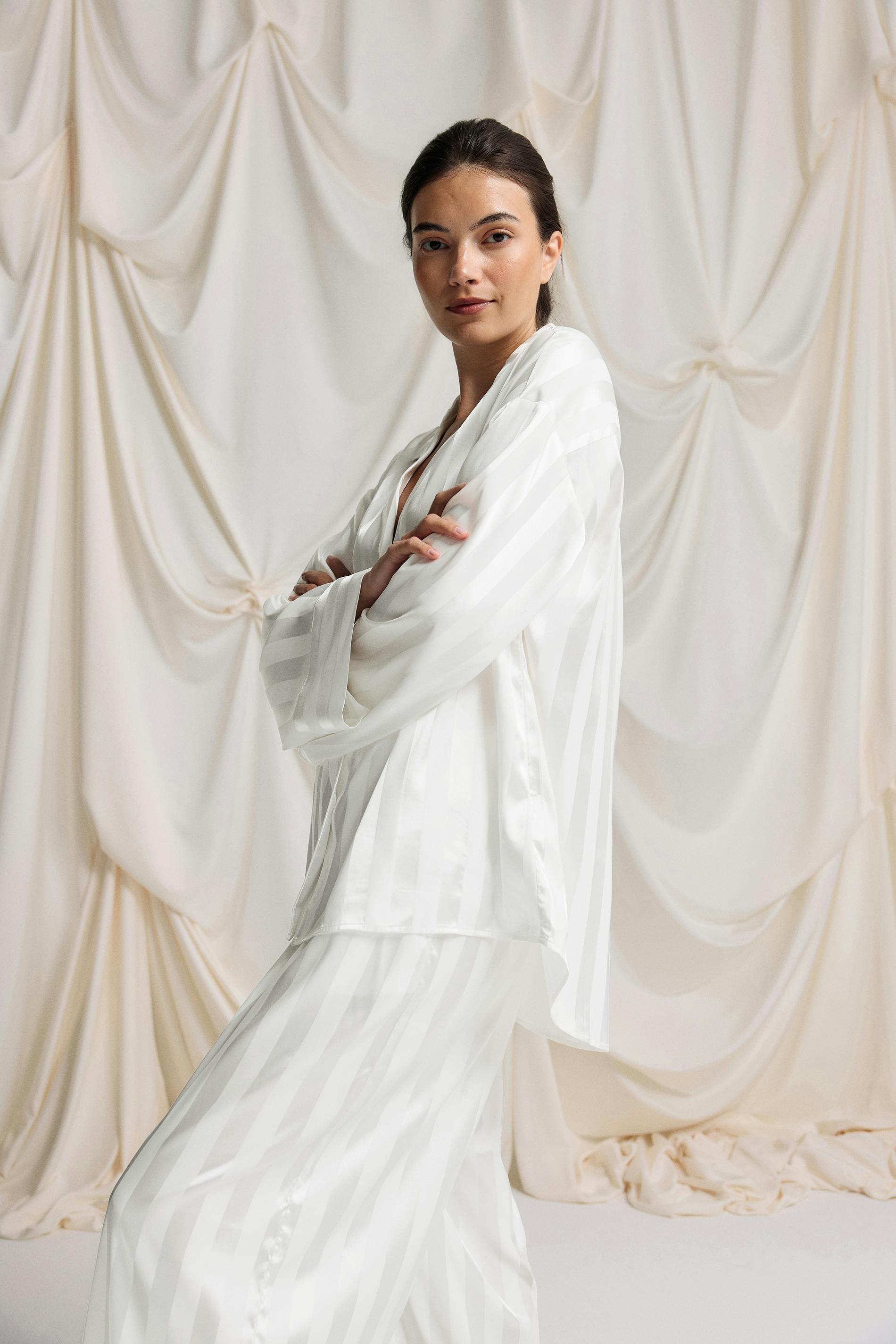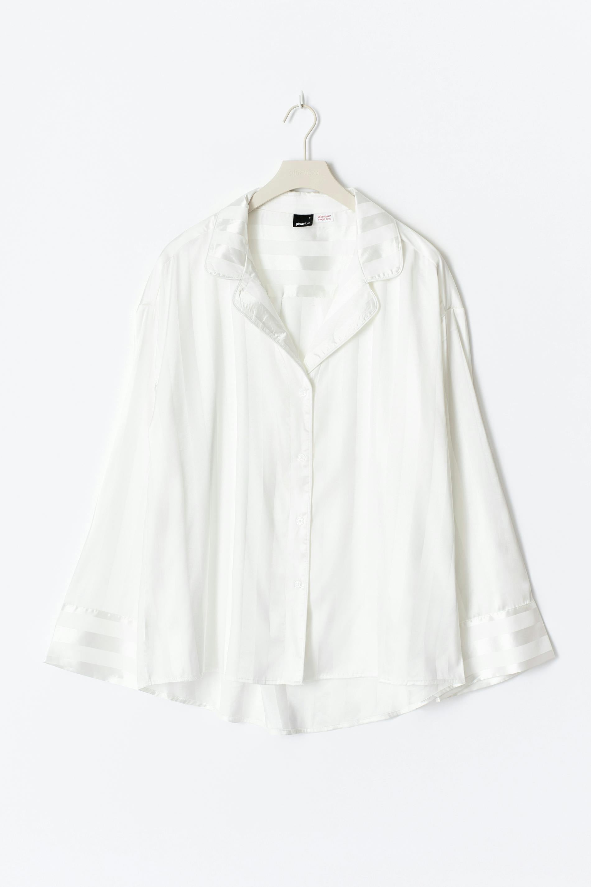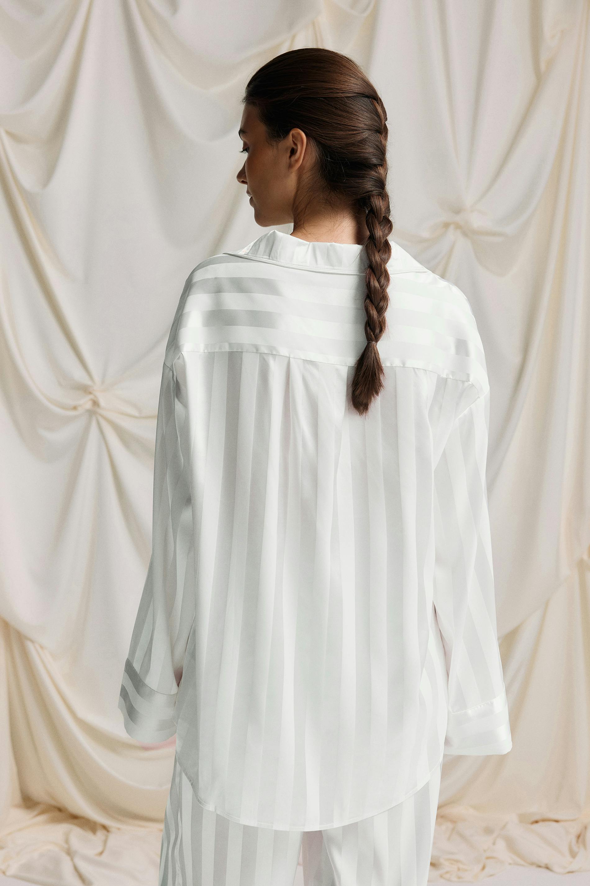 Randig pyjamasskjorta i satin med oversize fit. Skjortan är vit och har knäppning fram och fram. Den har krage, långa ärmar med manschetter och okavskärning bak.
