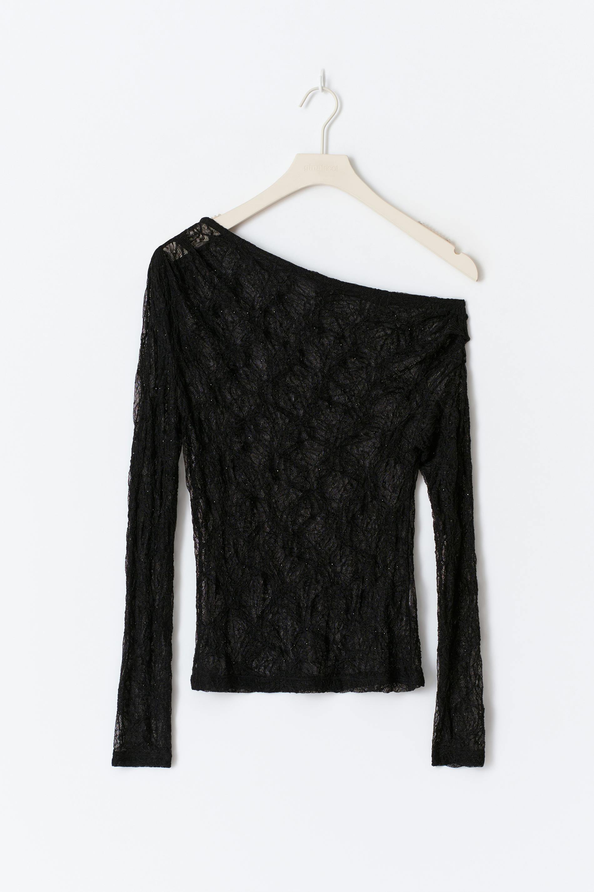 Långärmad topp i spets med strass. Toppen är svart och har en one-shoulder design. Den har en figurnära passform och en normallängd.