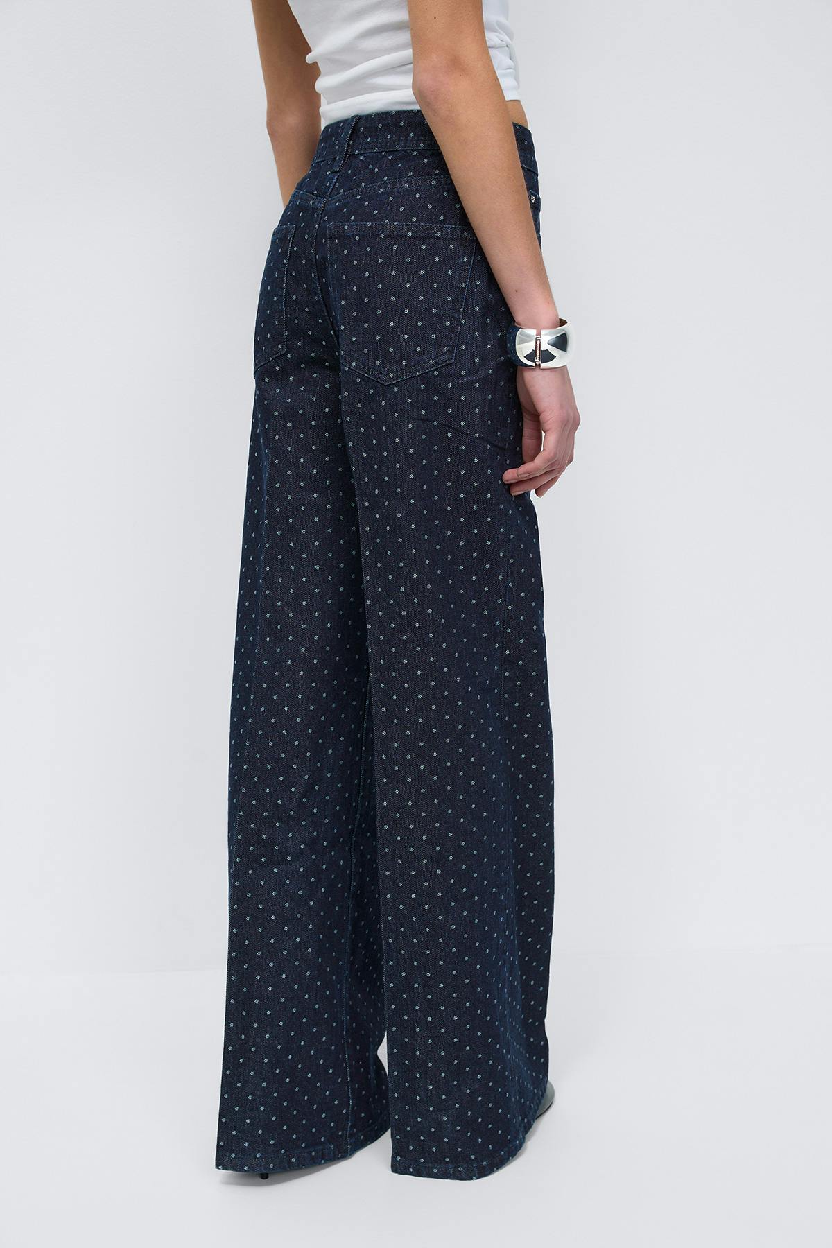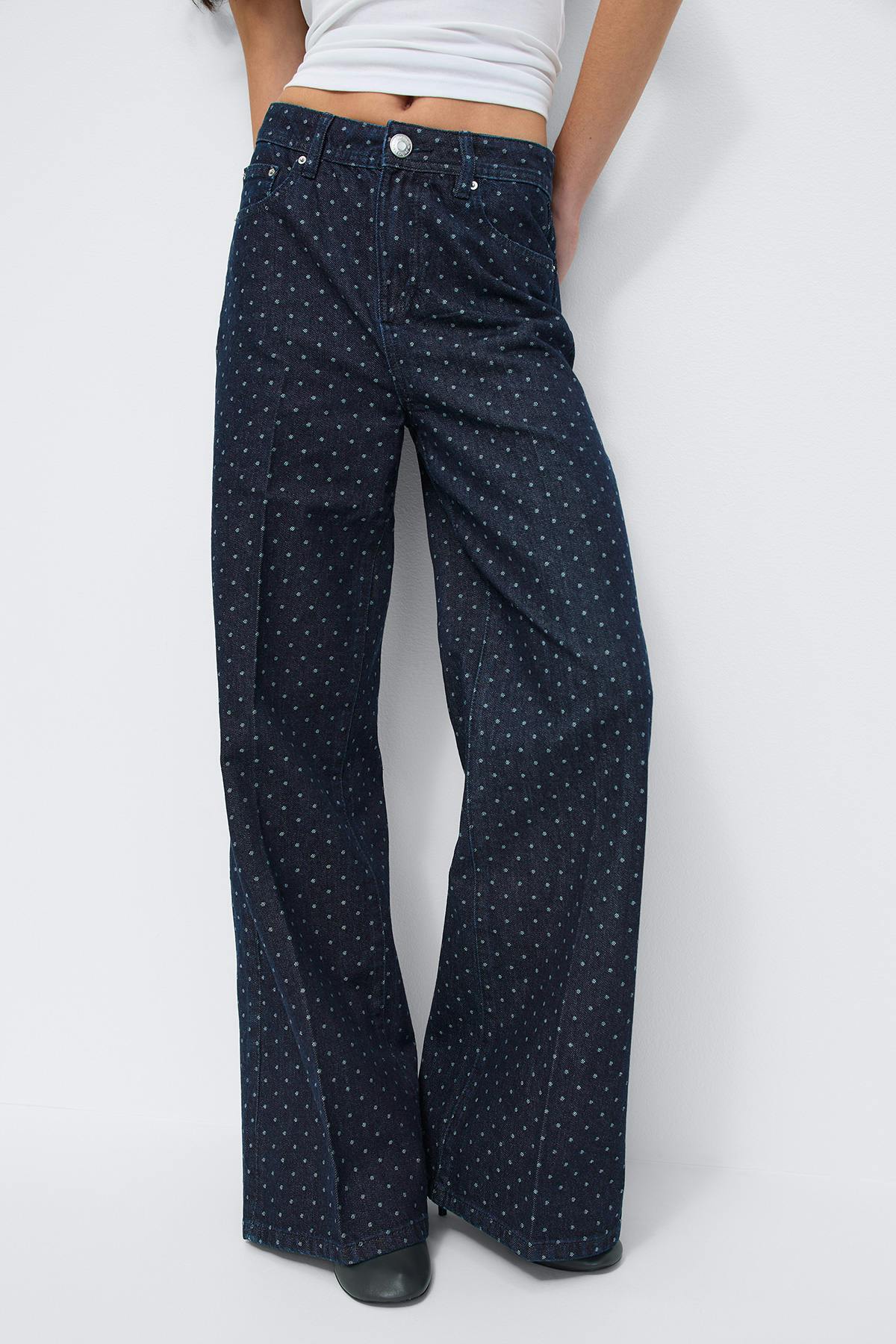 Prickiga vida jeans med hög midja. Jeansen är mörkblåa och har normal passform. De har vida ben, fickor fram och bak, bälteshällor och dragkedjegylf. Utan stretch. Se gärna vår storleksguide för att hitta din storlek.