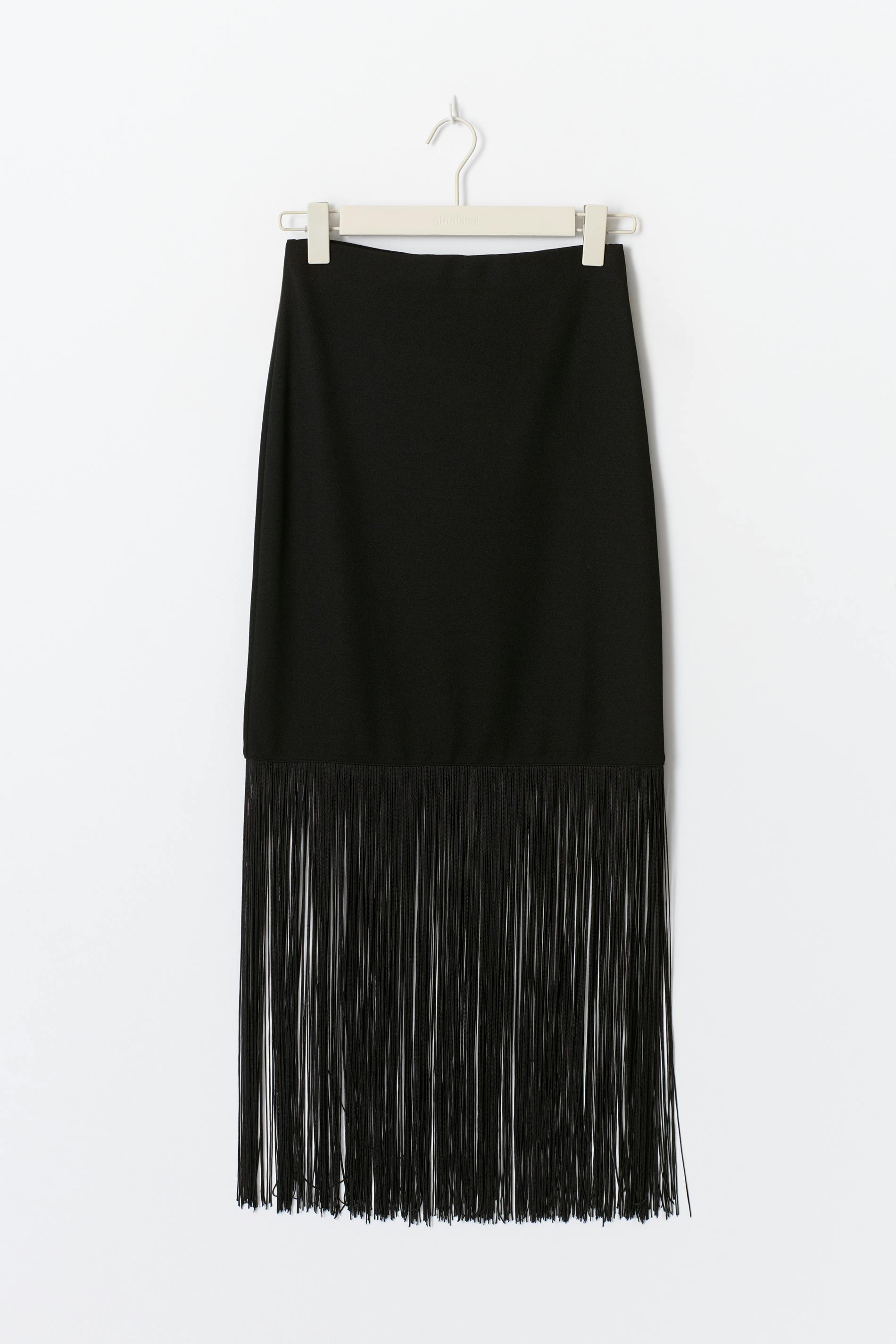 Maxikjol med långa fransar nedtill. Kjolen är svart och har en figurnära passform.