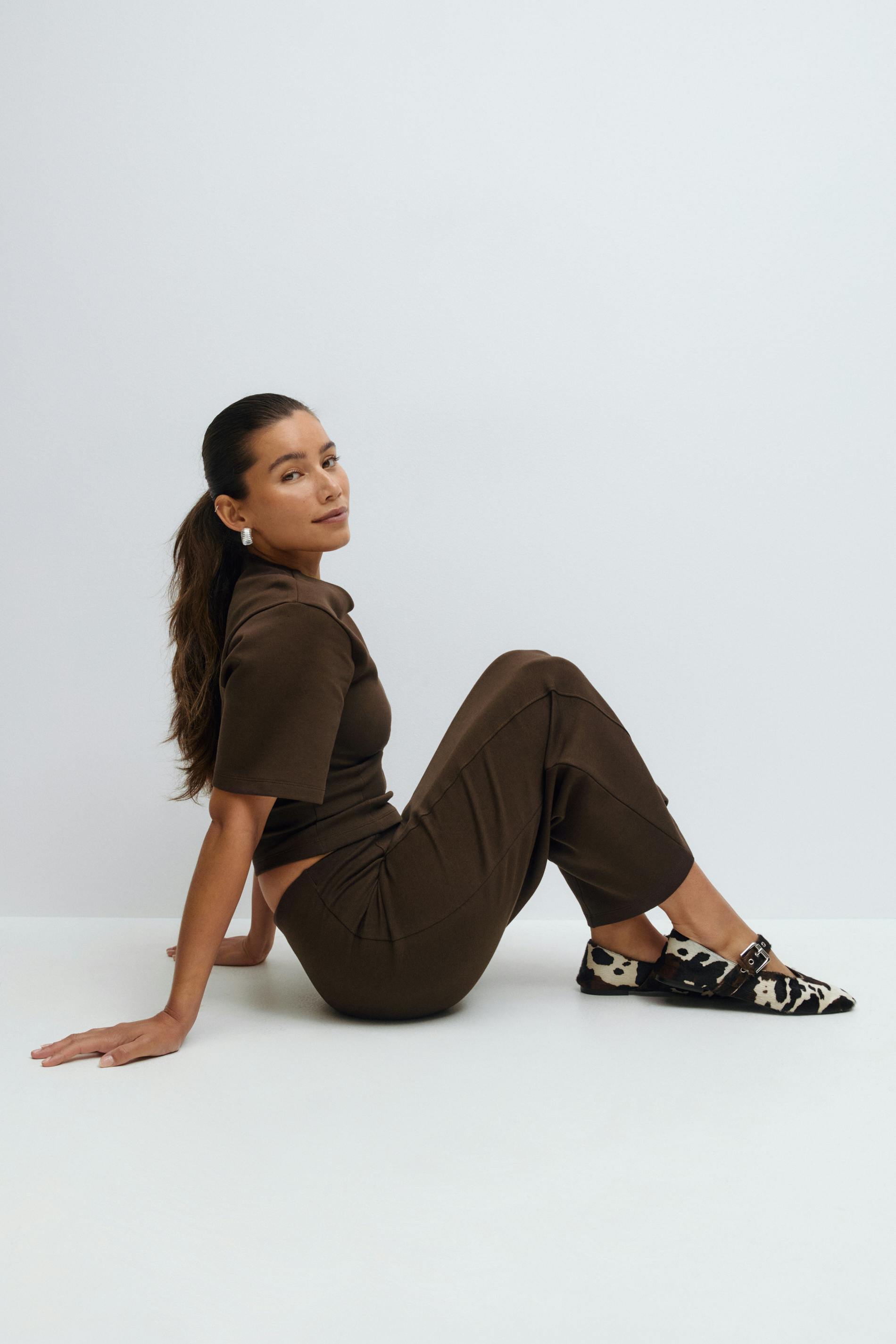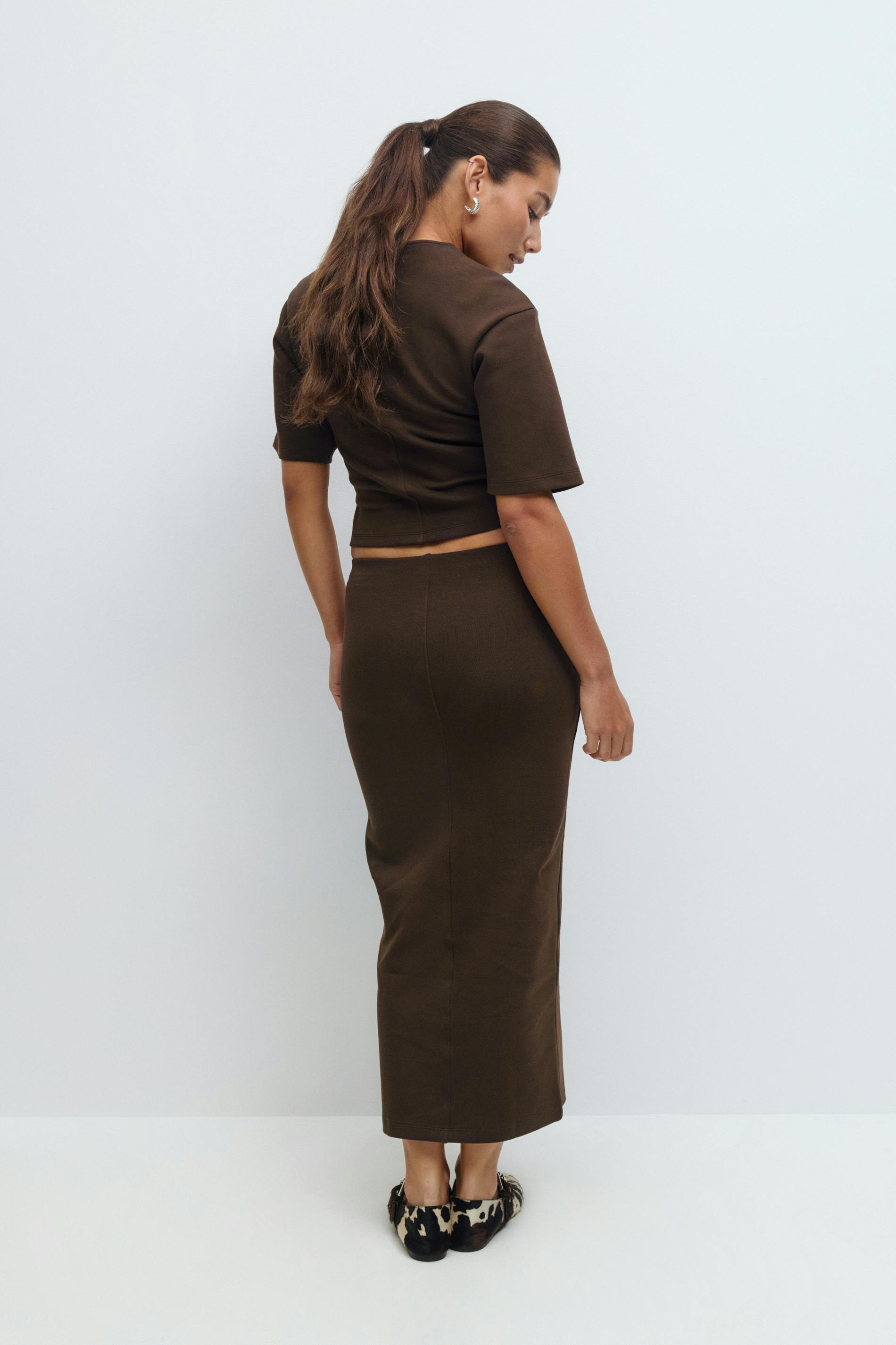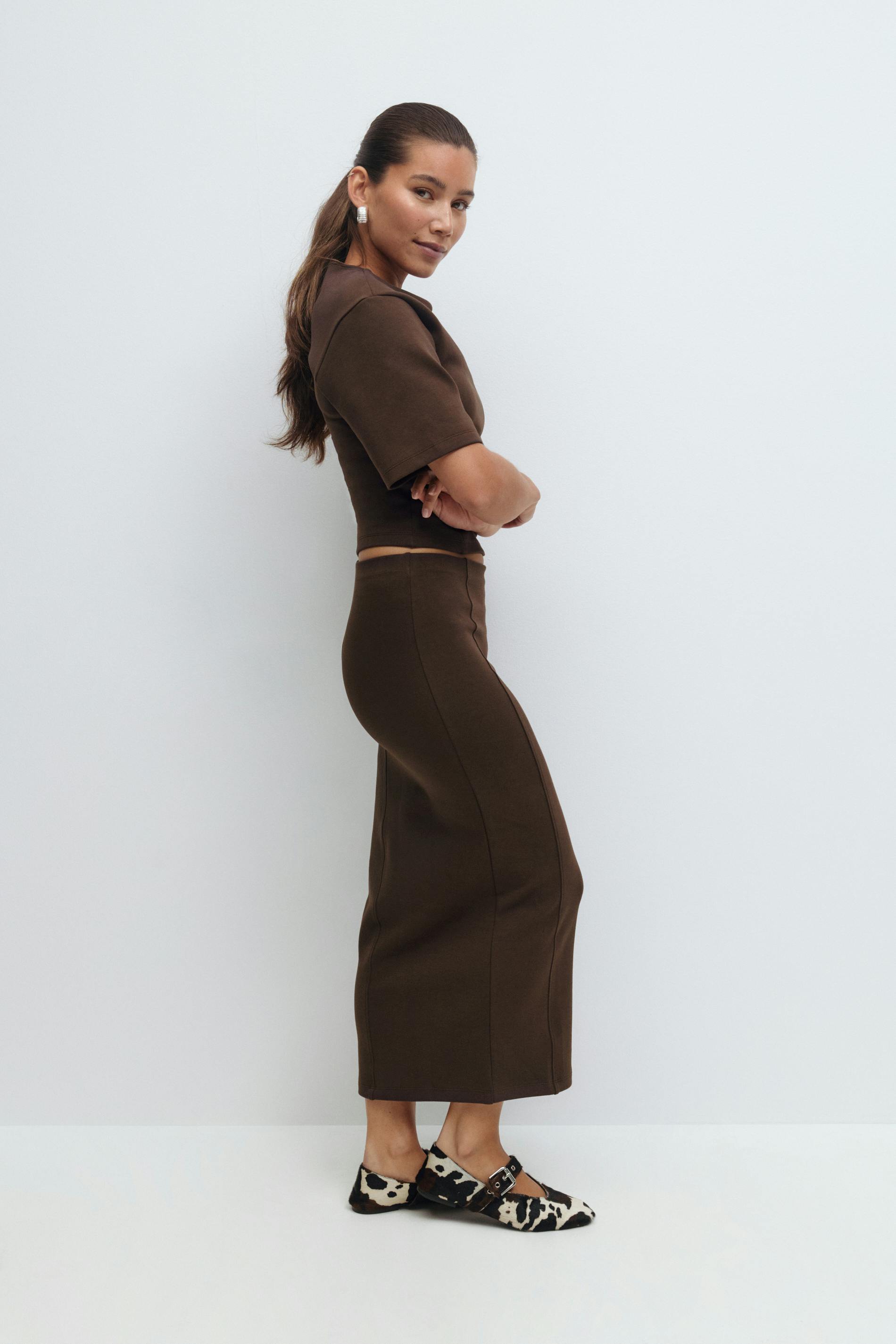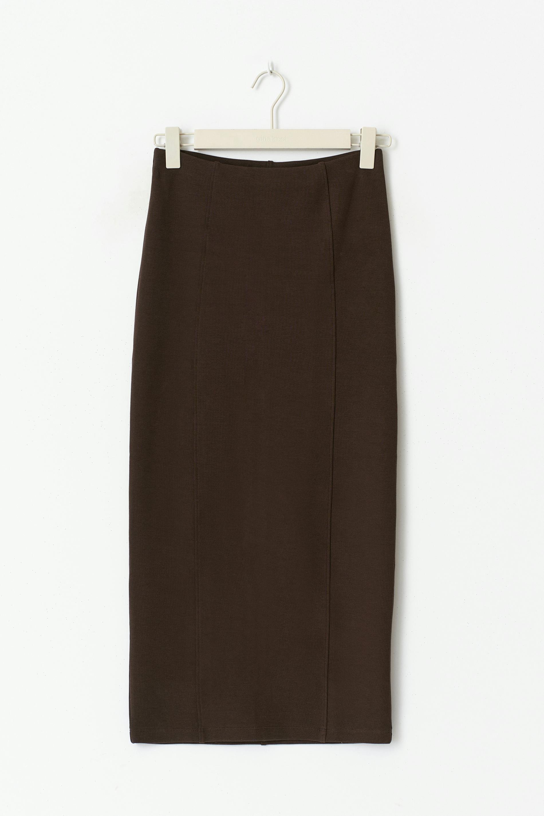 Midi skirt with seam details. The skirt is brown and has elastic at the waist. It has figure-hugging fit.