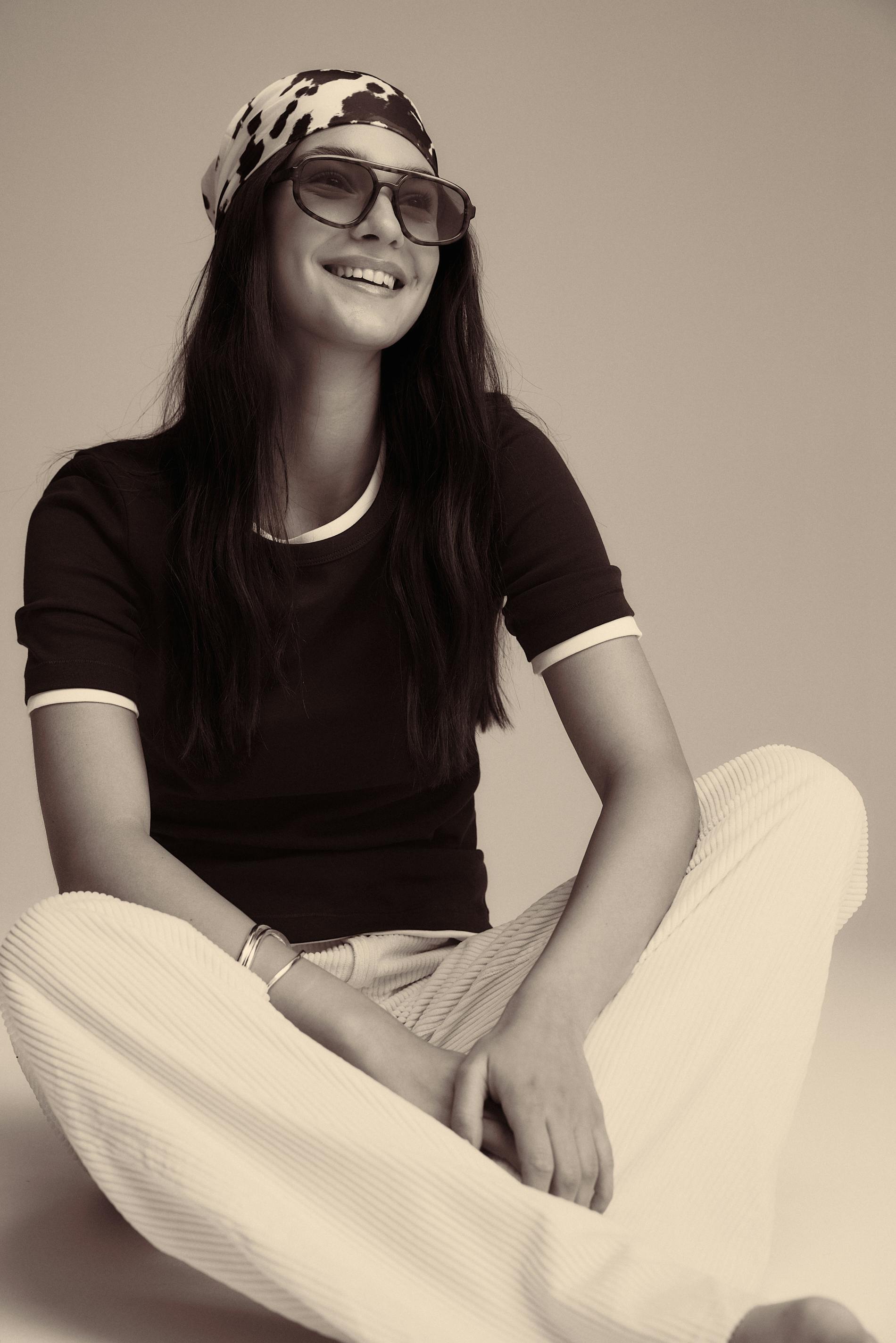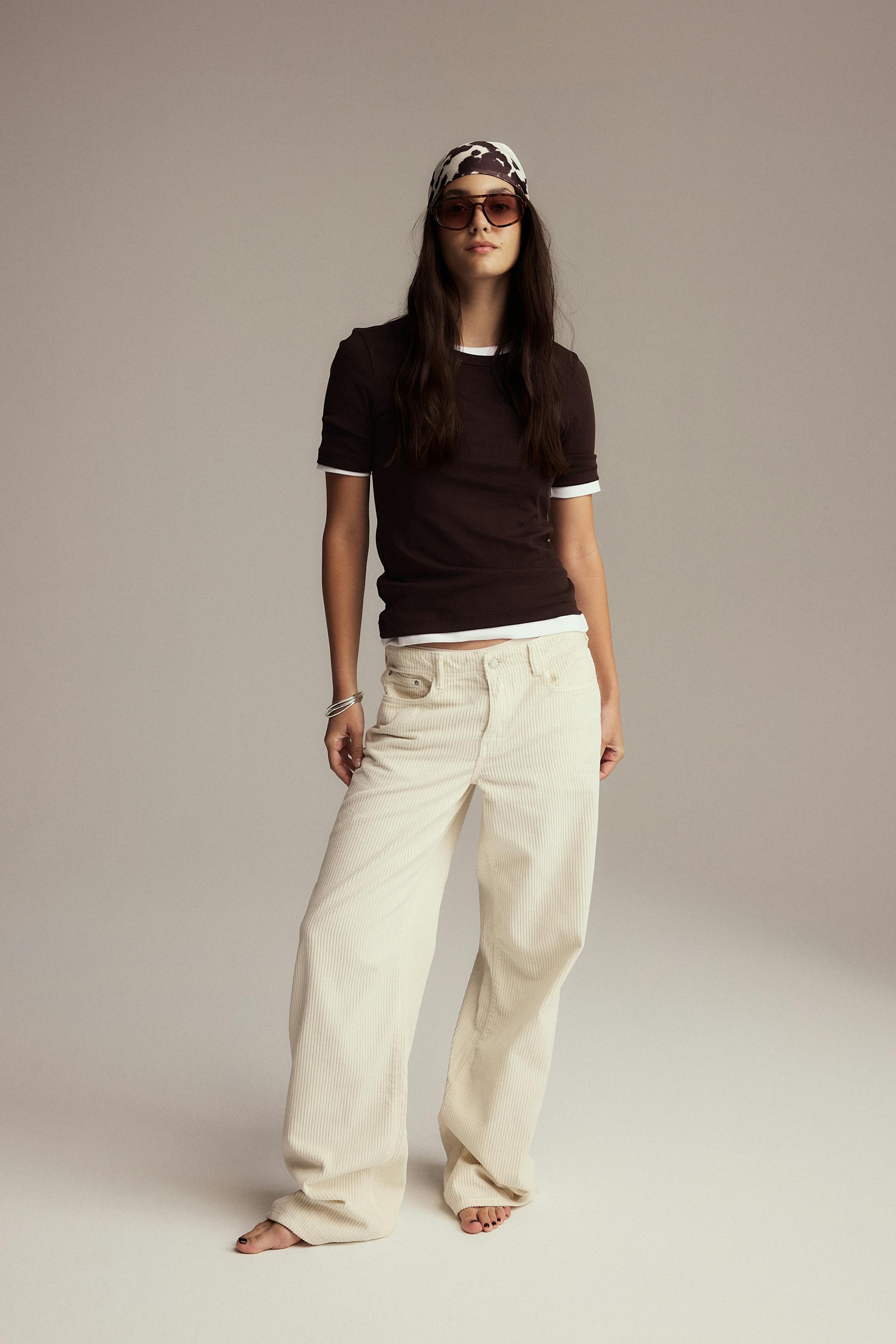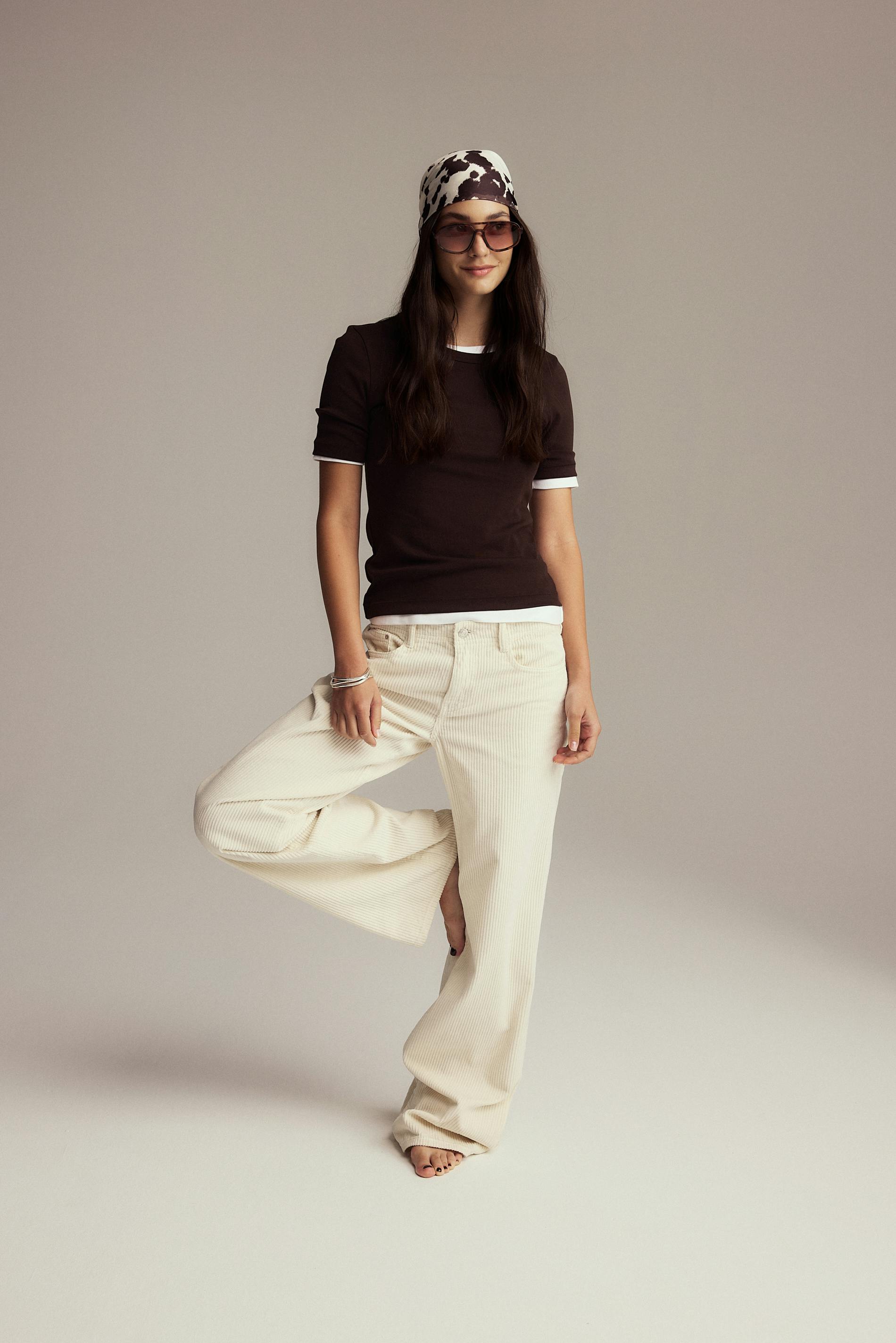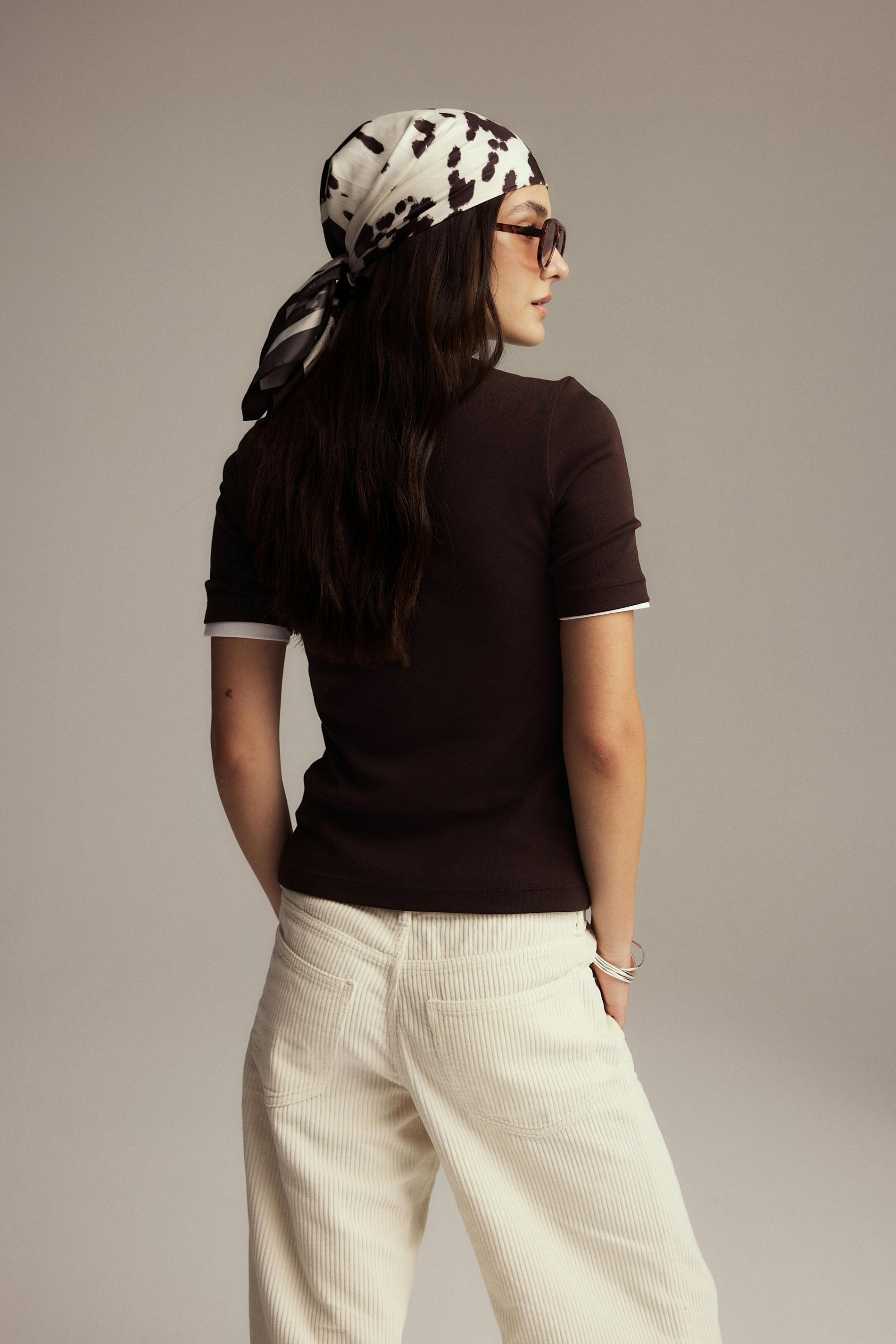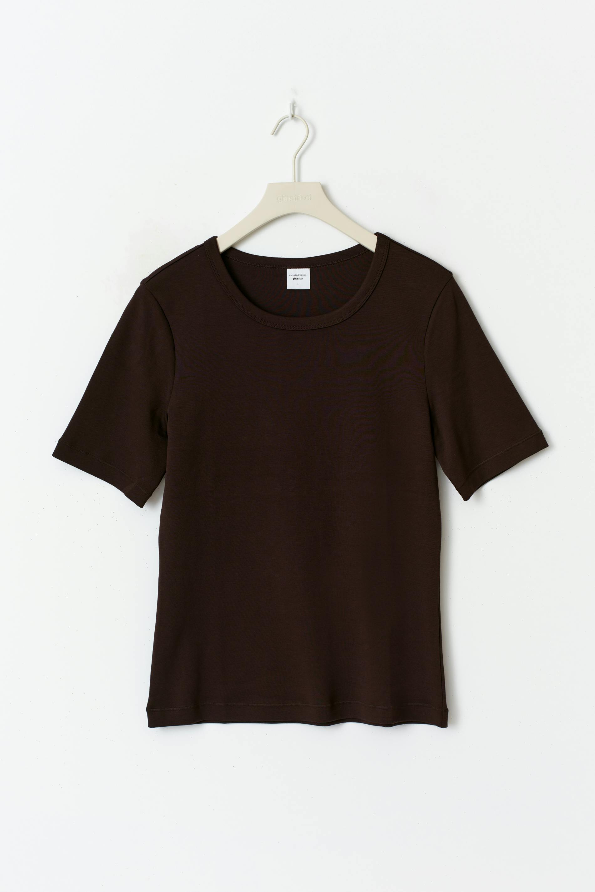 Tight t-shirt with short sleeves. The t-shirt is brown and has round neckline. It has figure-hugging fit and cropped length.