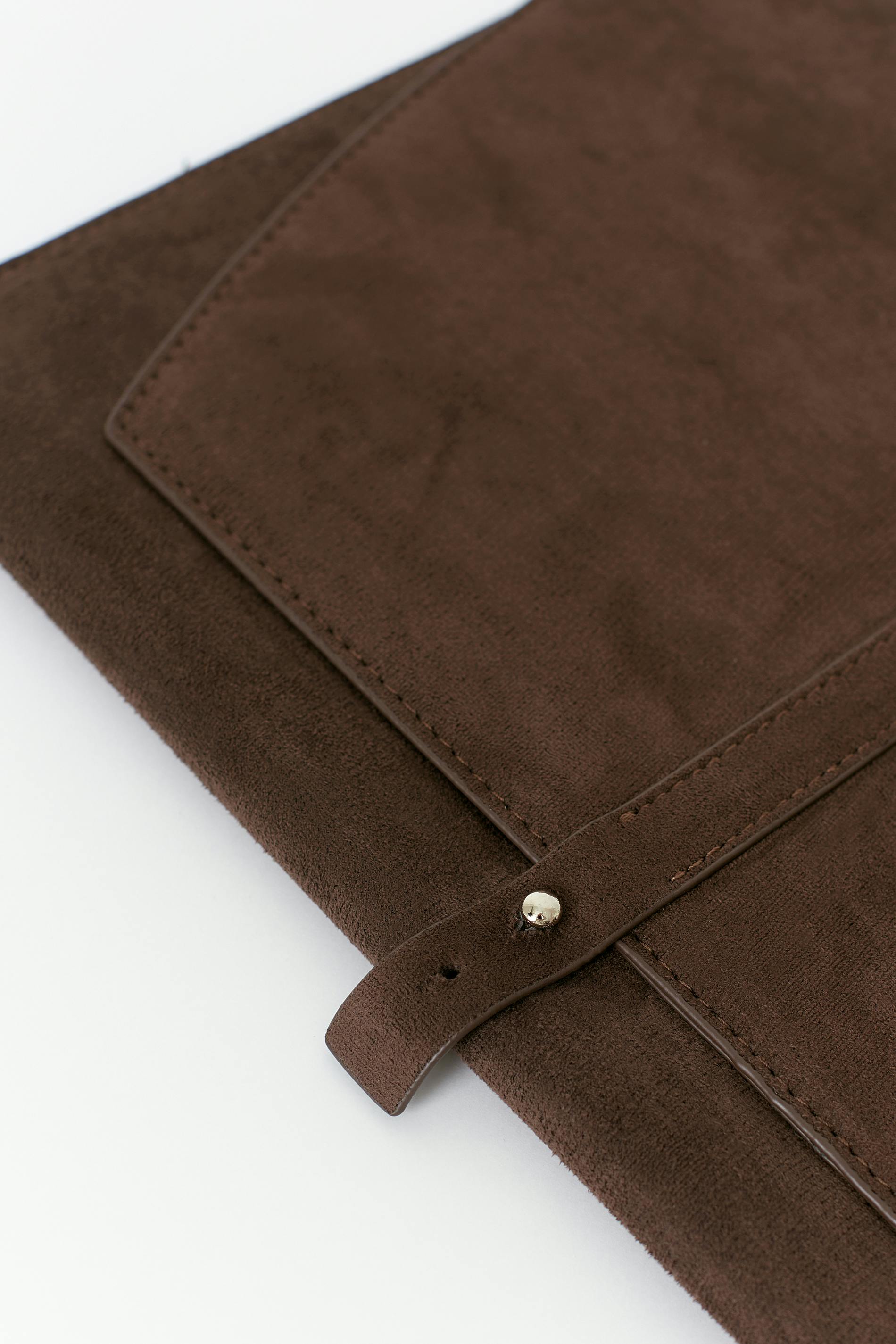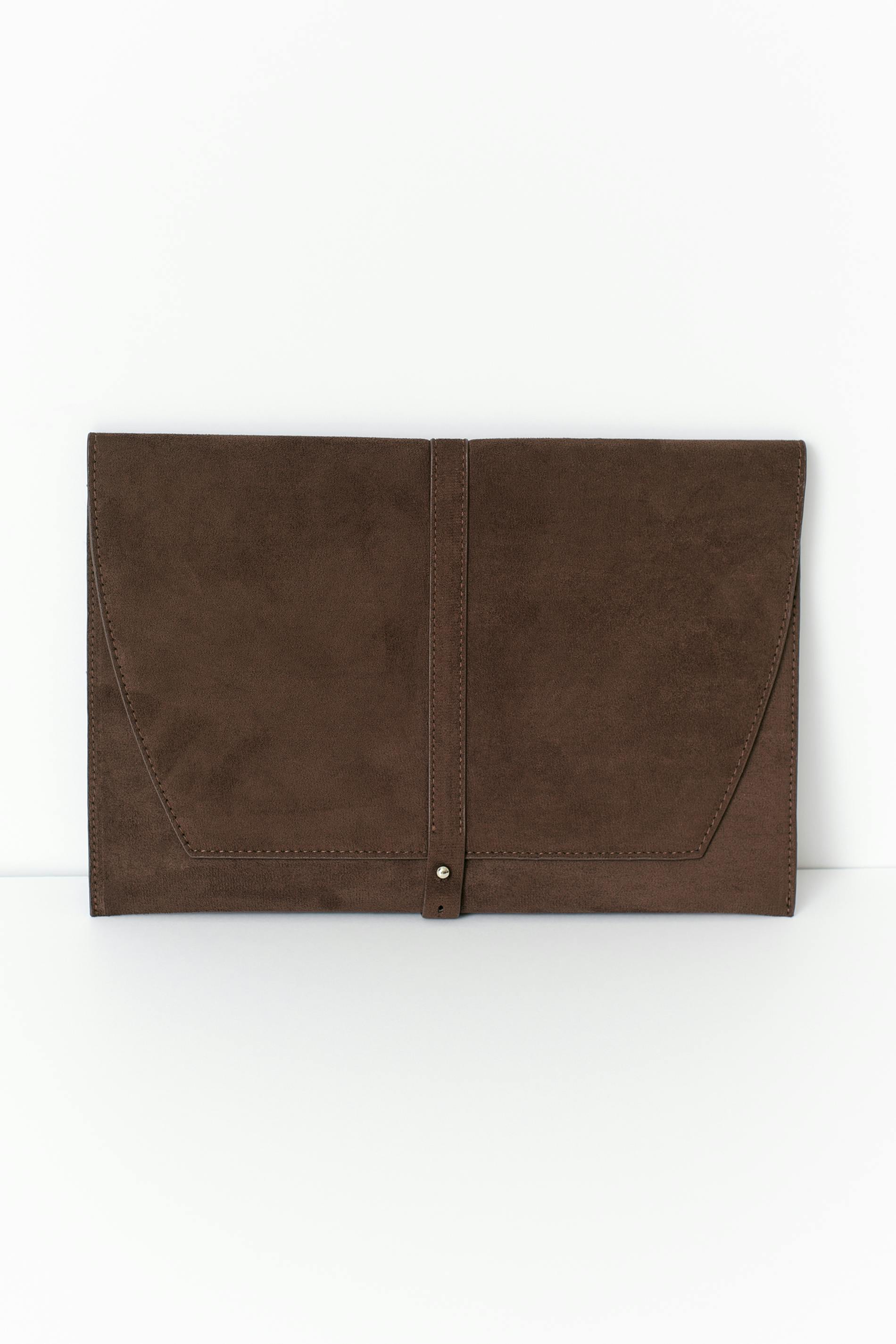 Computer case in faux suede with flap. The computer case is brown and has strap detail with metallic button.