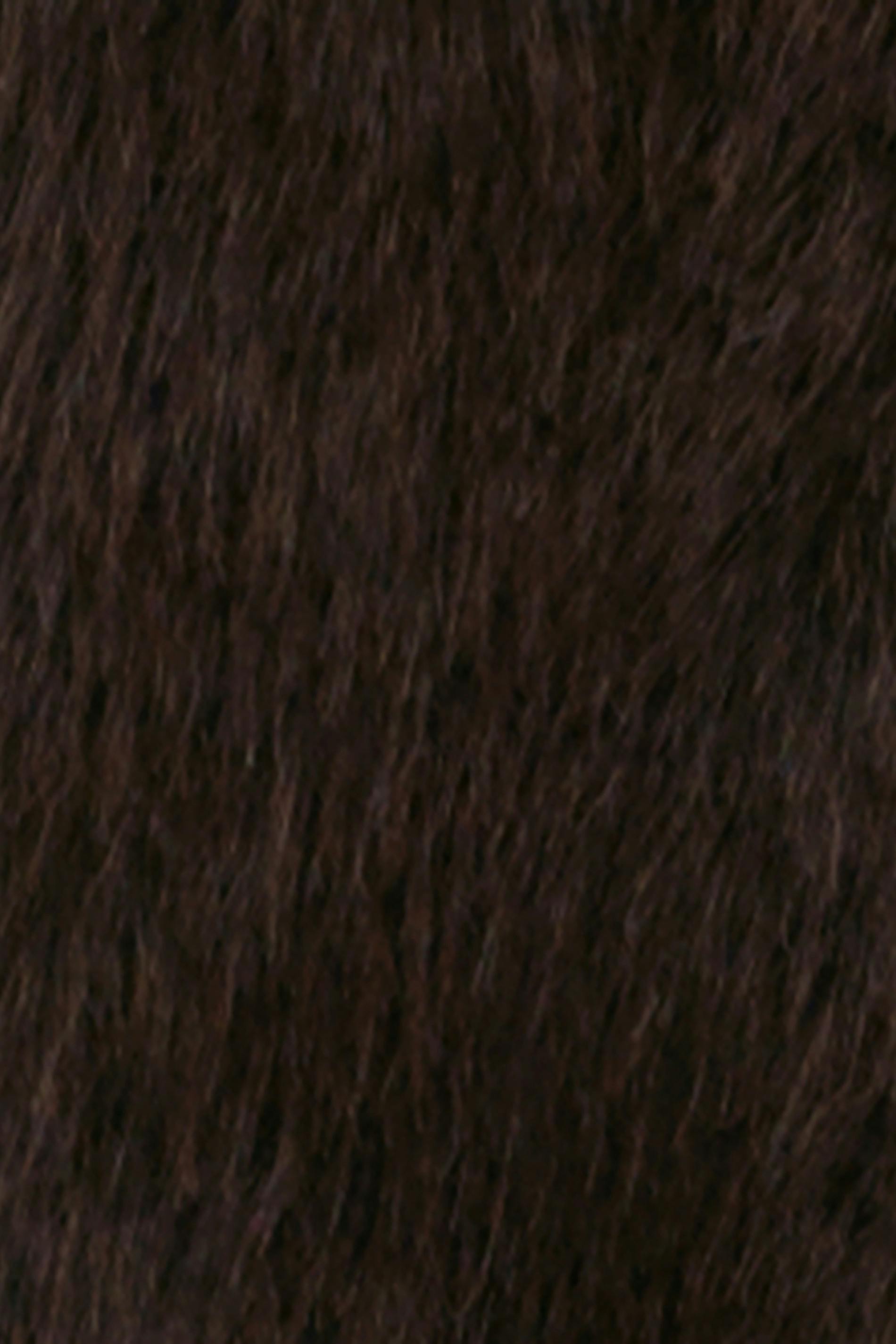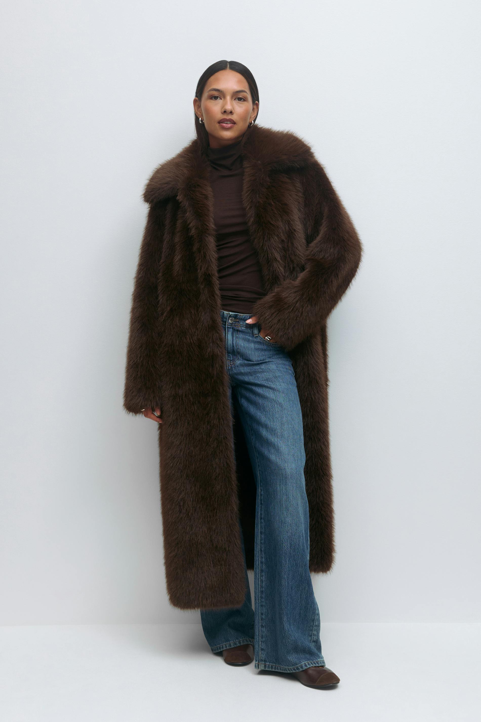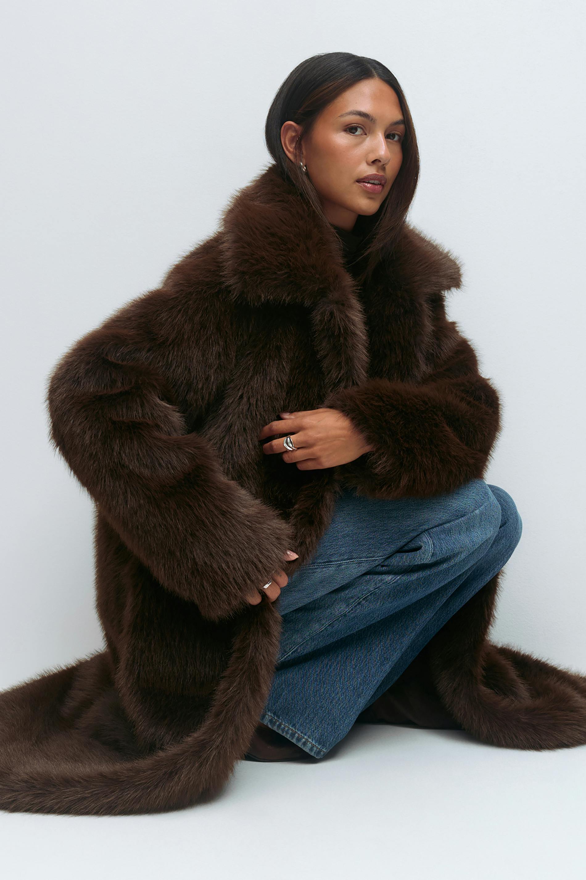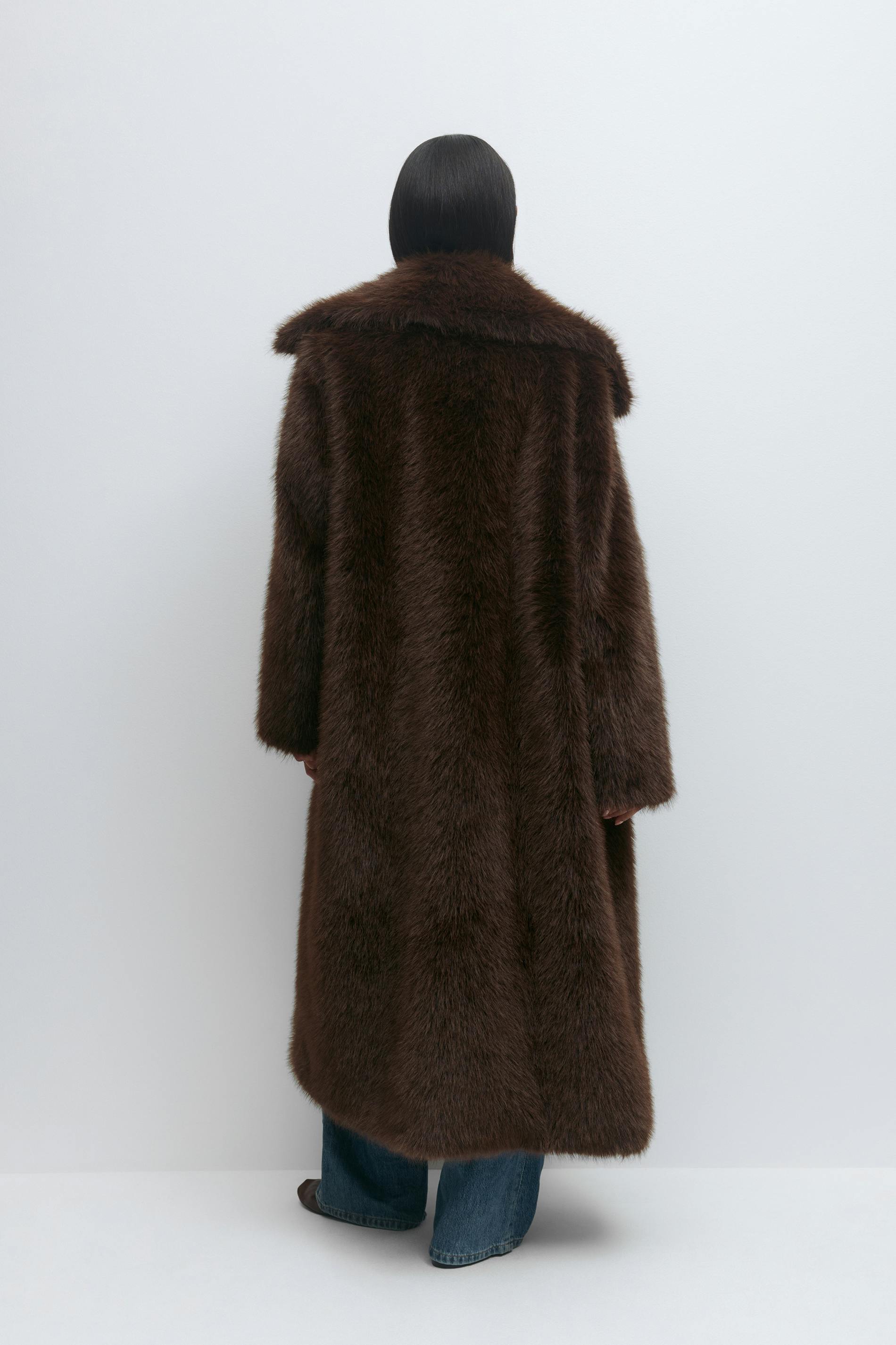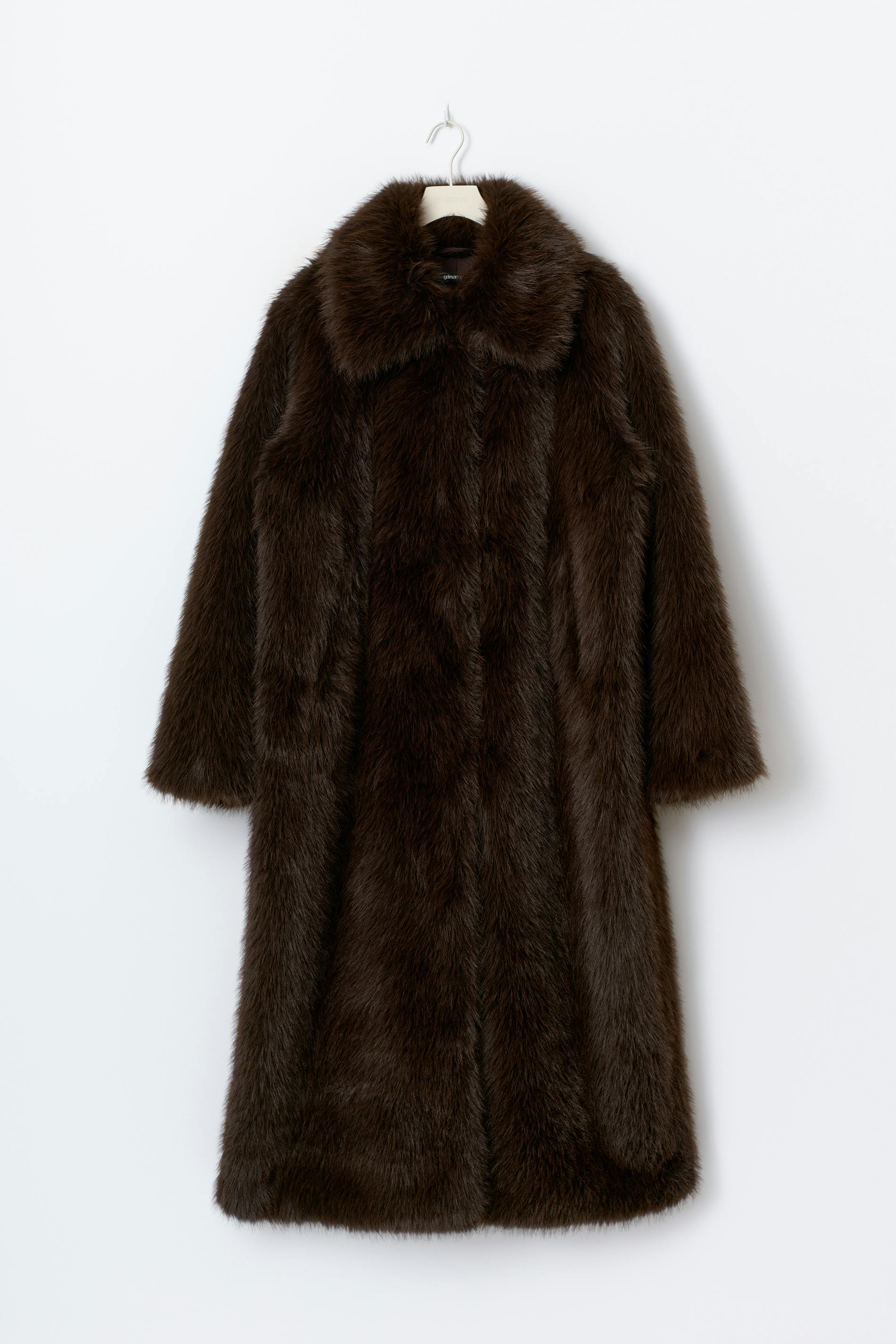 Lång pälskappa med en lång ärm. Kappan är brun och har generös passform. Den har ett fluffigt, mjukt material, fickor i sidorna och en rak passform.