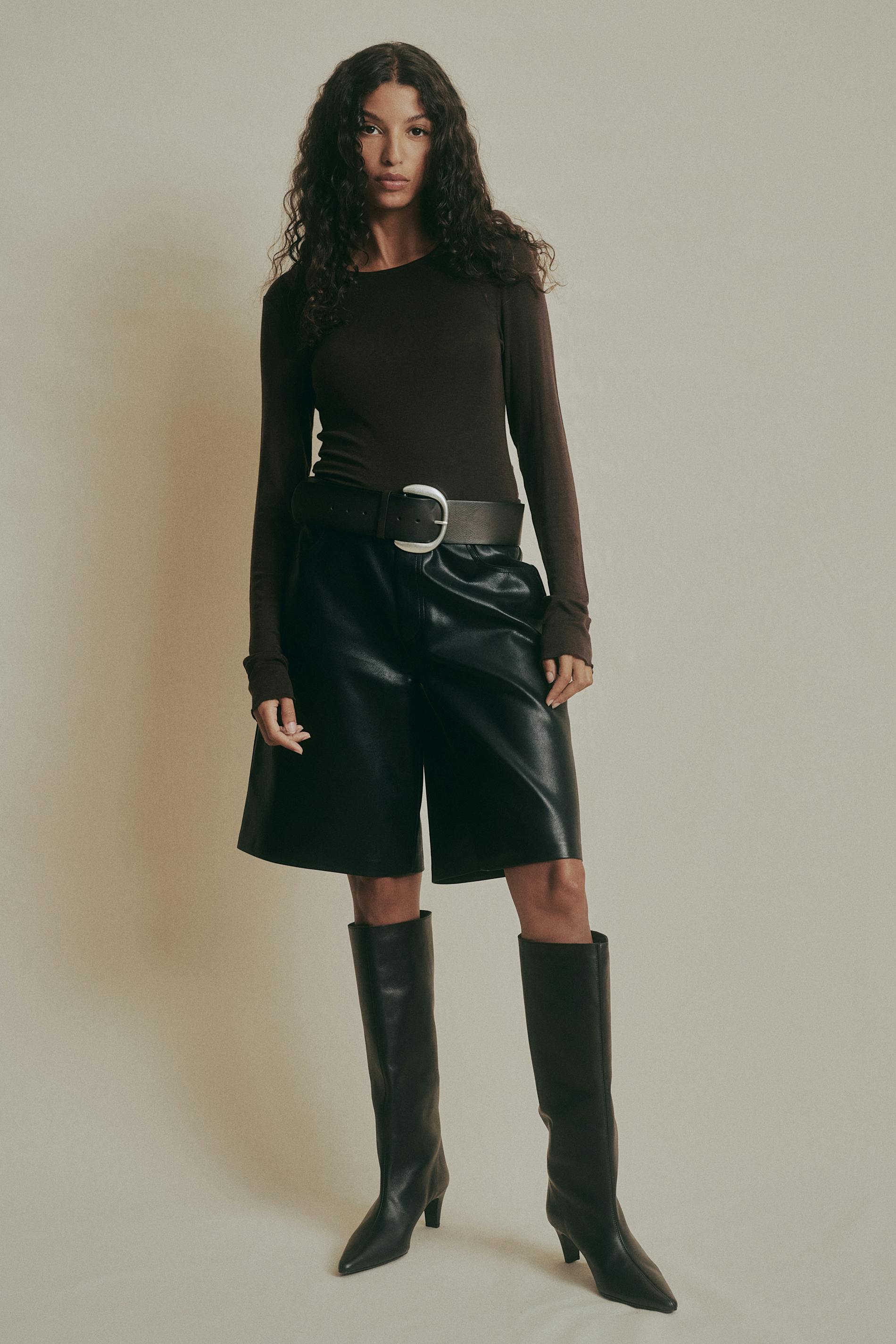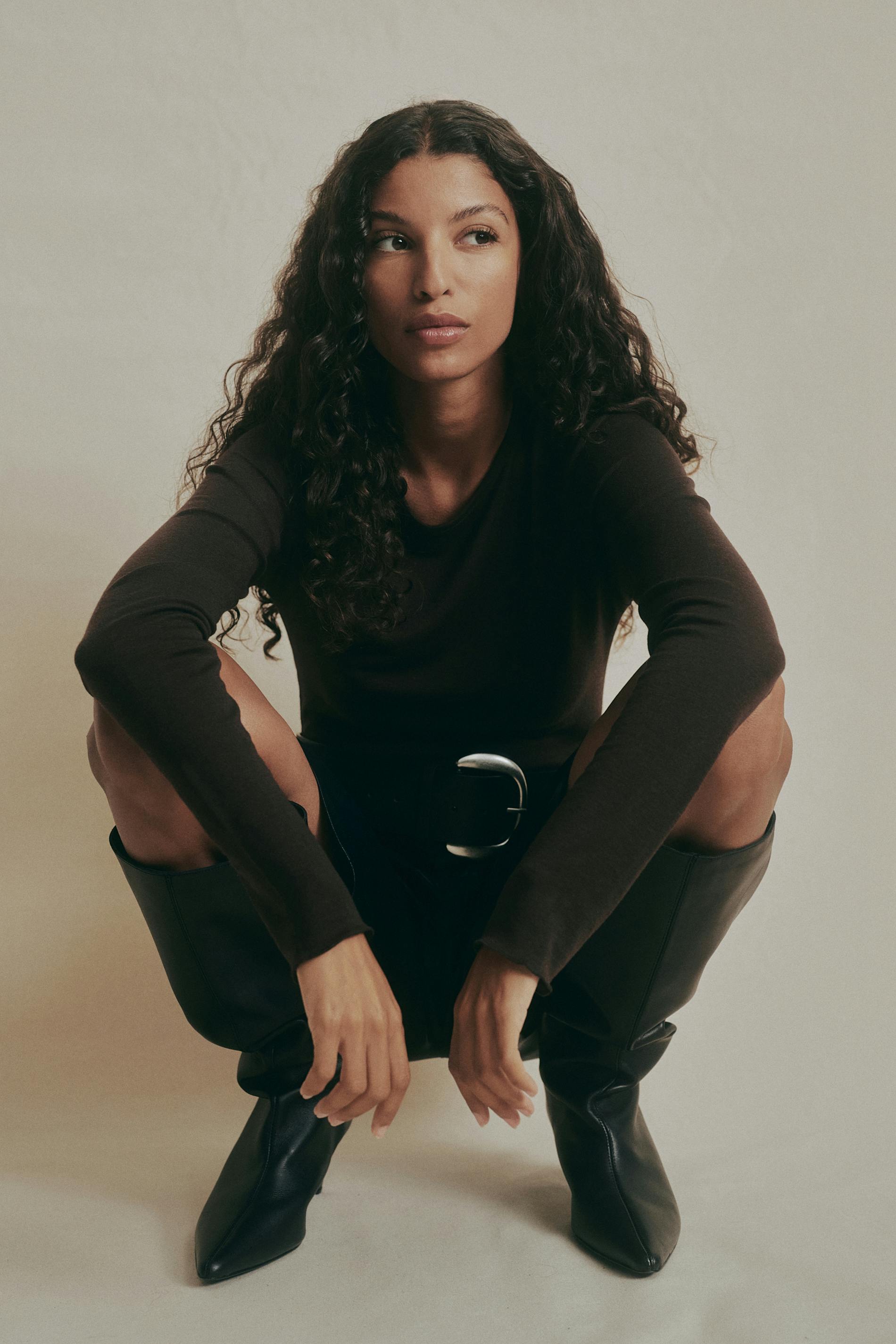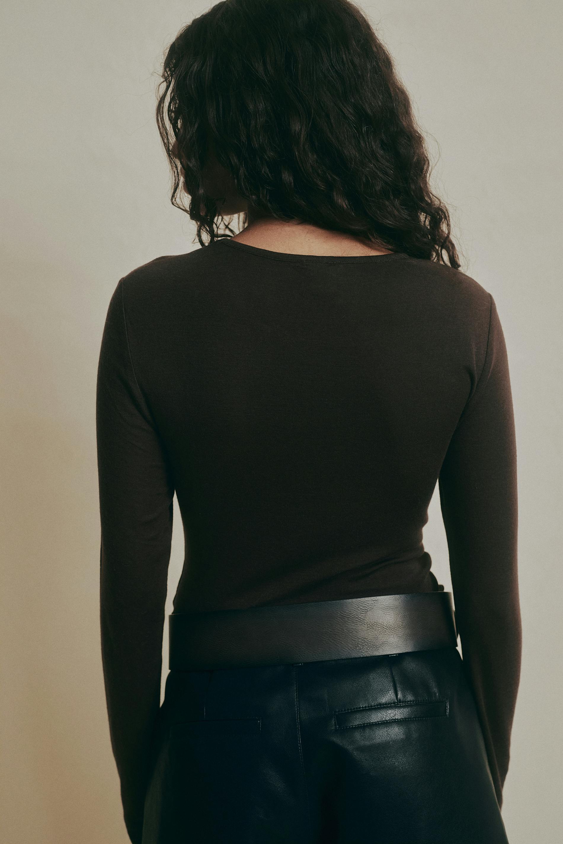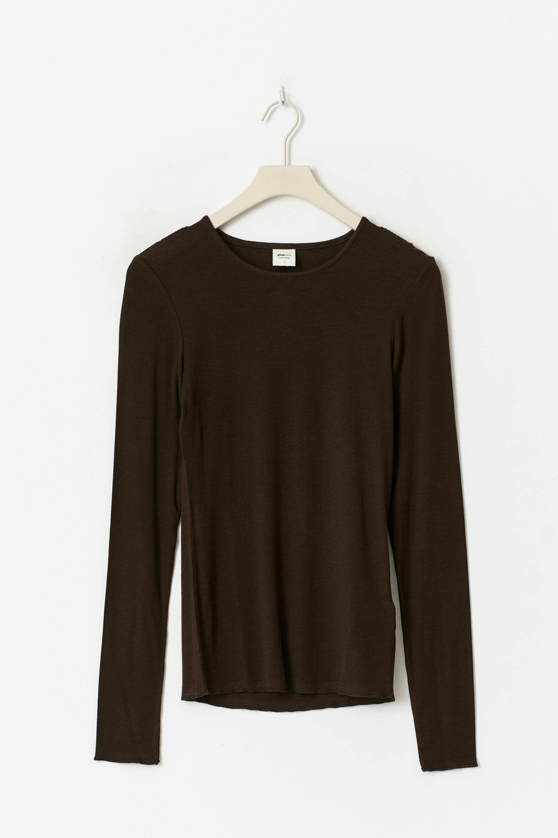 Långärmad topp i ullblandning med skir kvalitet. Toppen är brun och har rund halsringning. Den har normallängd och figurnära passform.