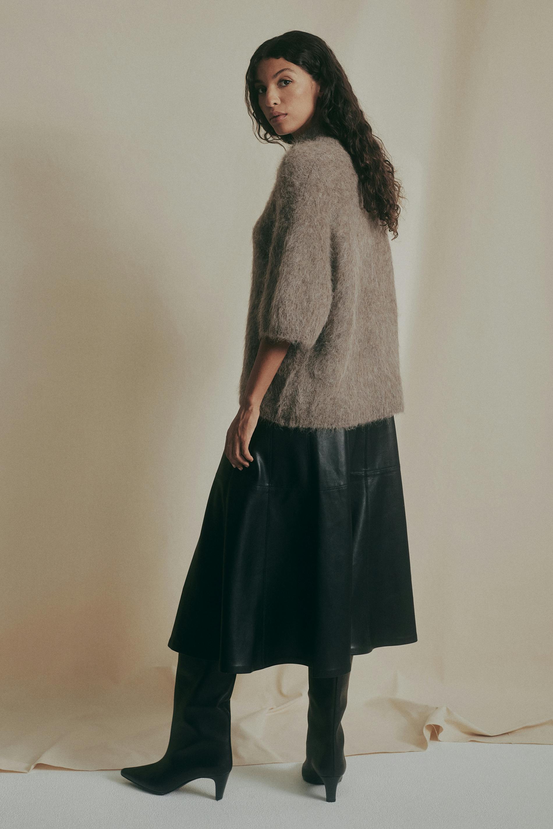 Kortärmad stickad tröja i alpackamix med polokrage. Tröjan är brun och har fluffig kvalitet. Den har oversize fit och ribbstickning vid ärmslut och i nederkant.