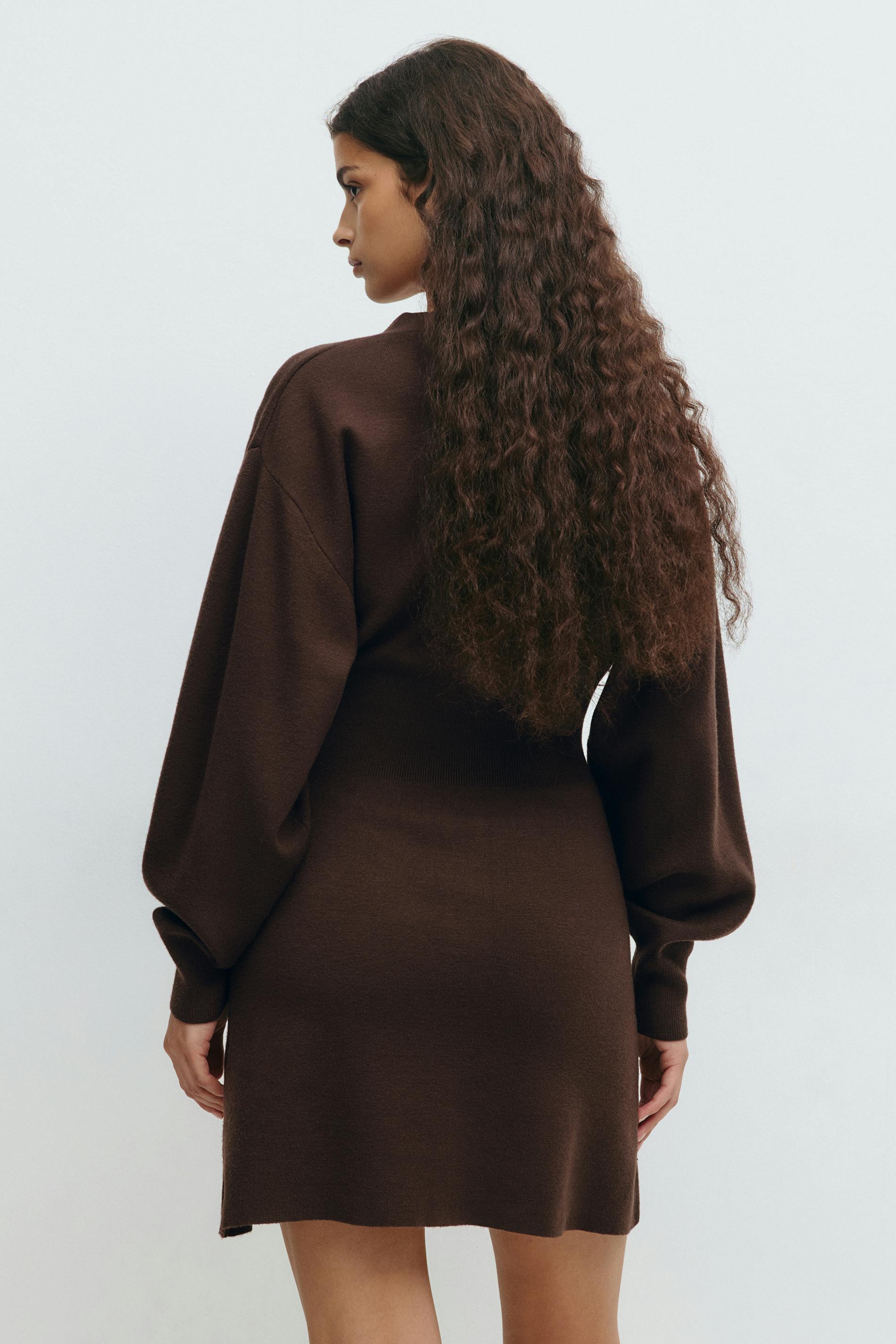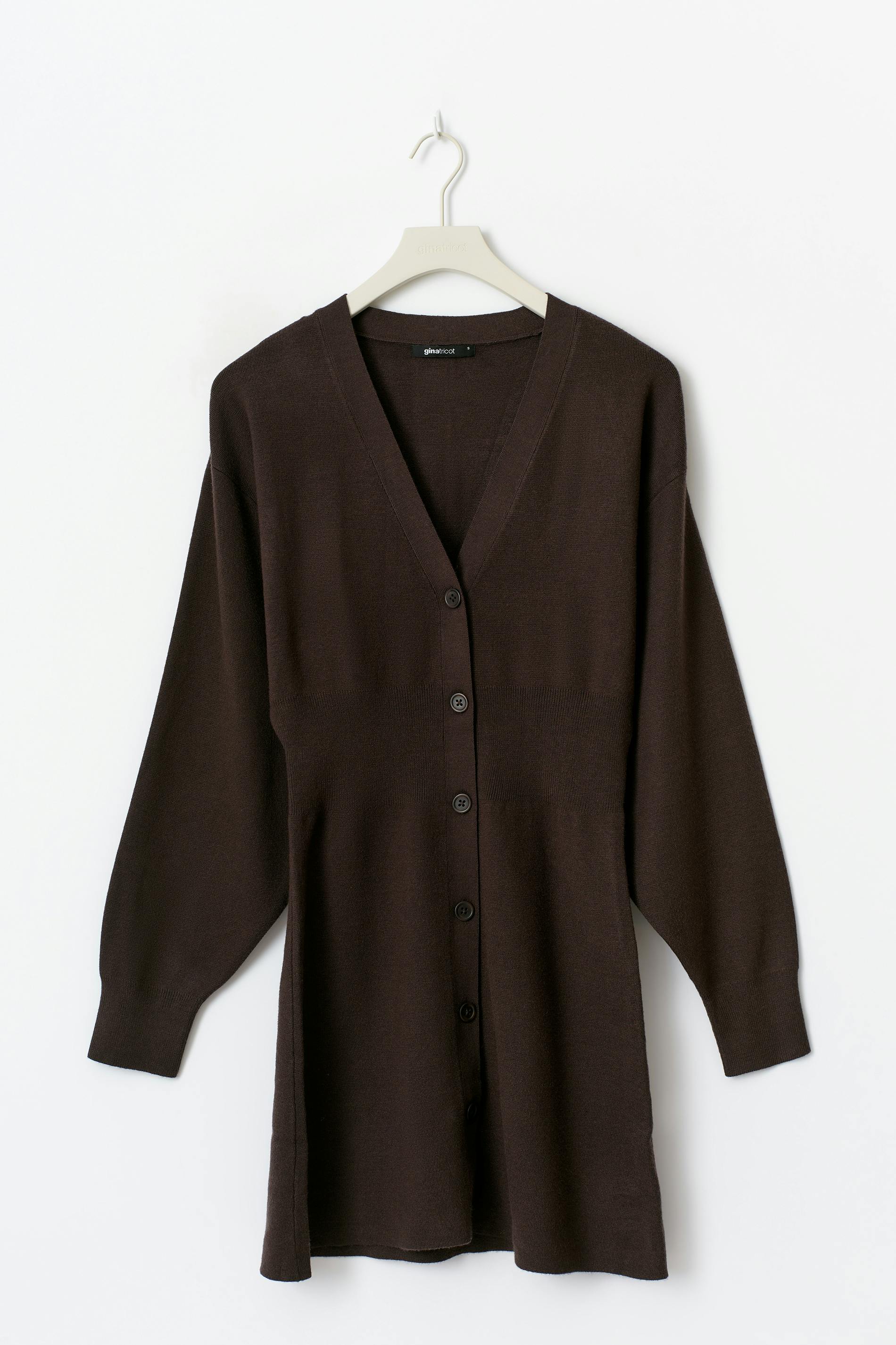 Stickad klänning med knappar ner längs framsidan. Klänningen är brun och har intagen midja. Den har figurnära passform, lång ärm, v-ringning och nedhasad axel.