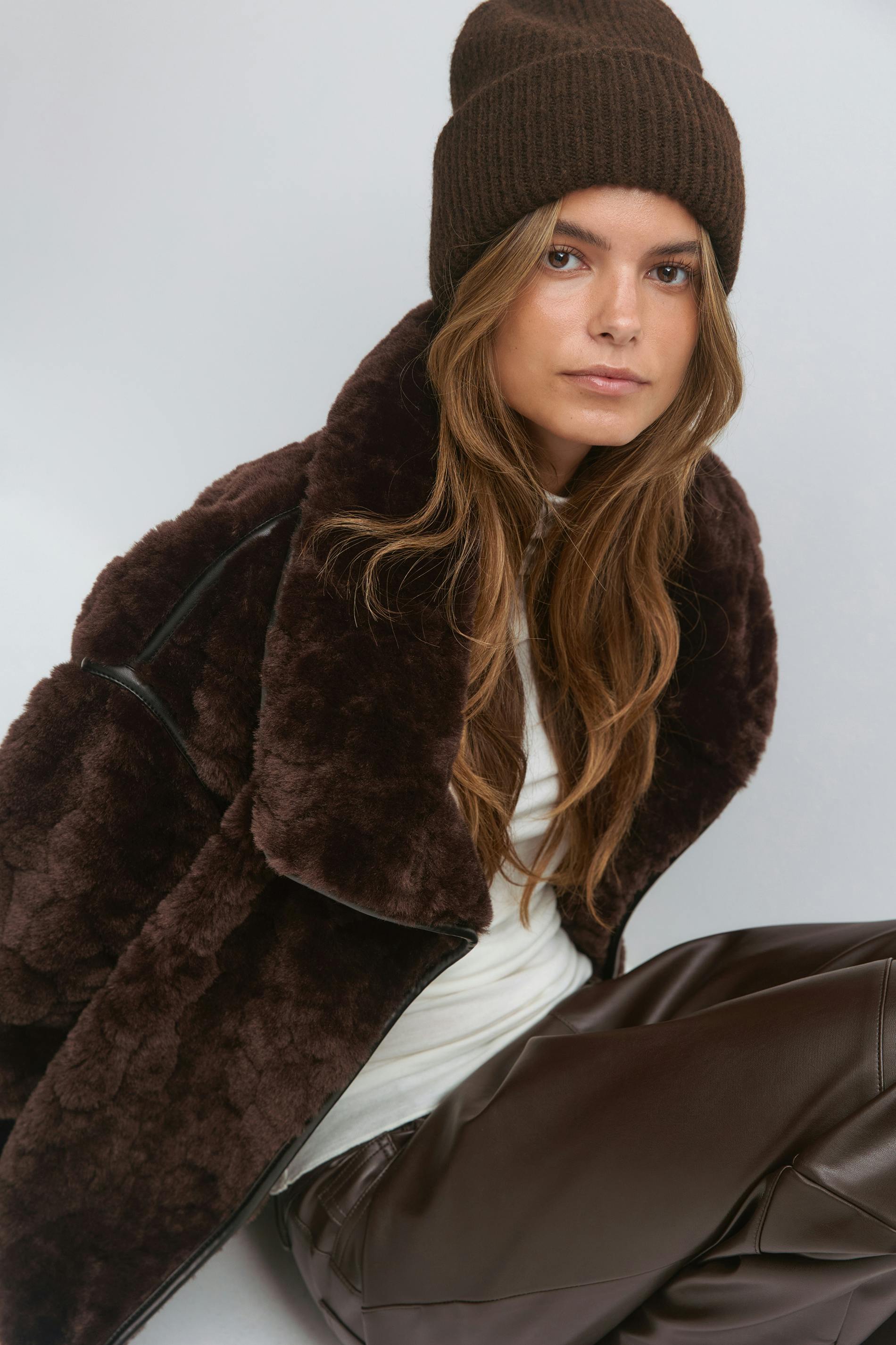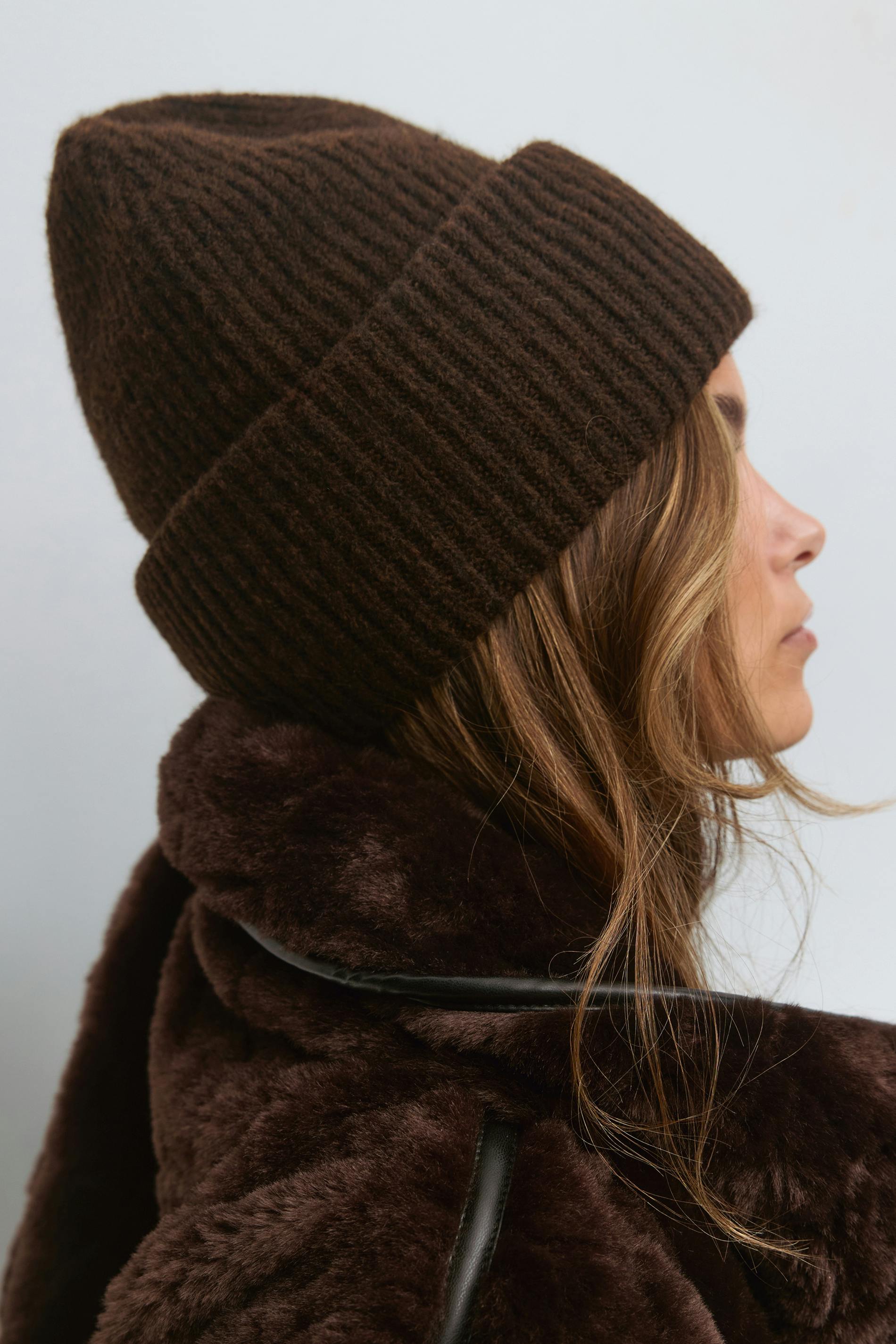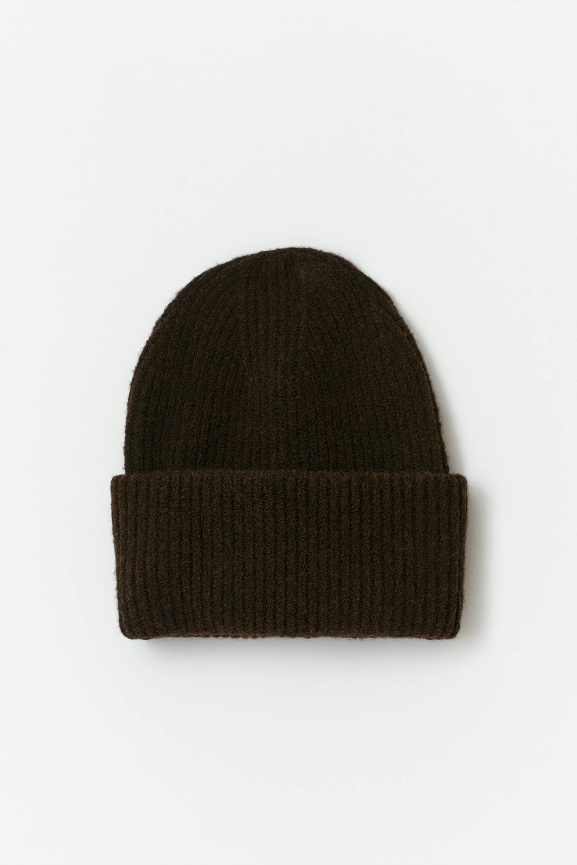 Ribbstickad mössa med bred, uppvikt kant. Mössan är brun och har figurnära passform.