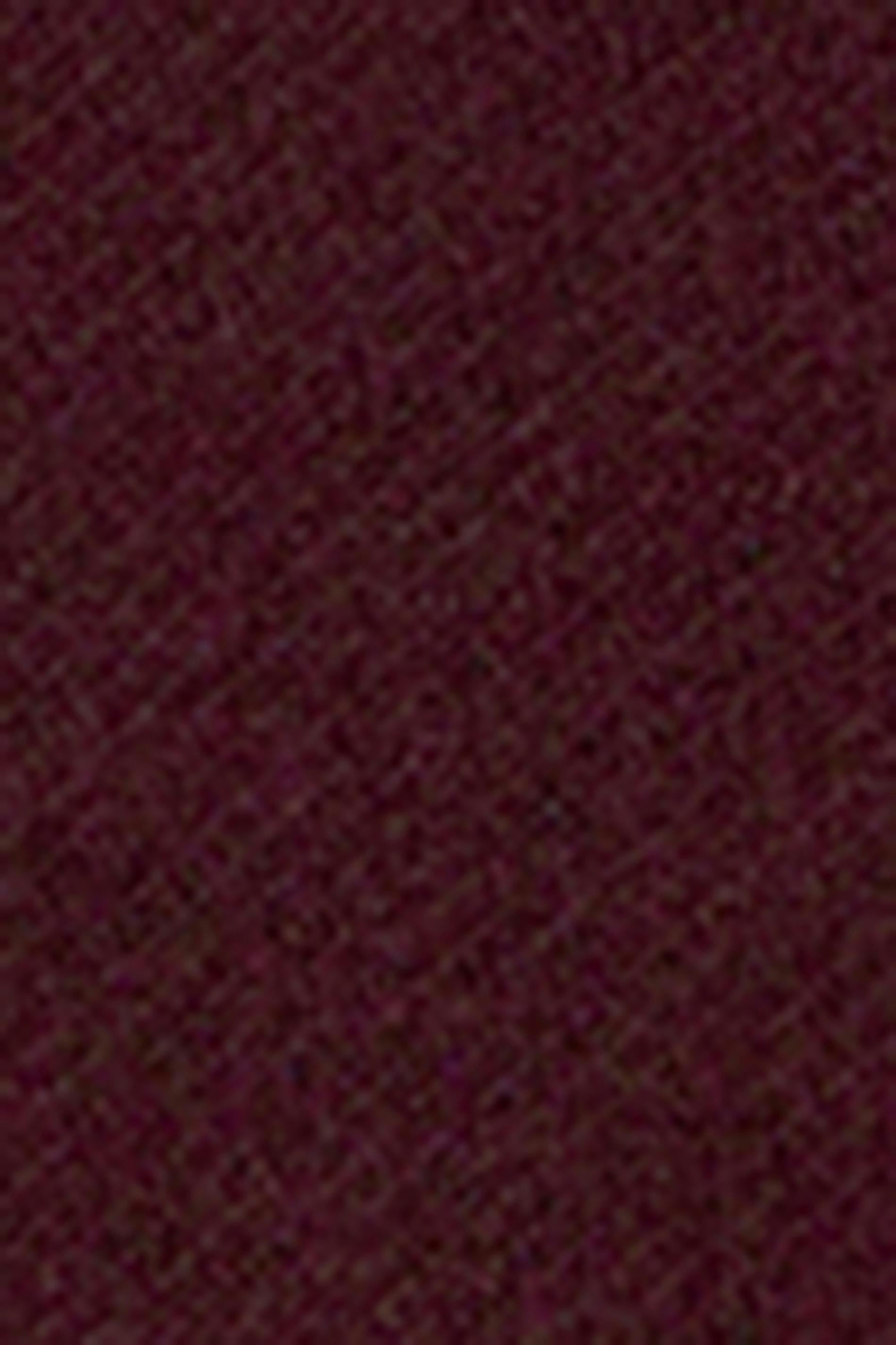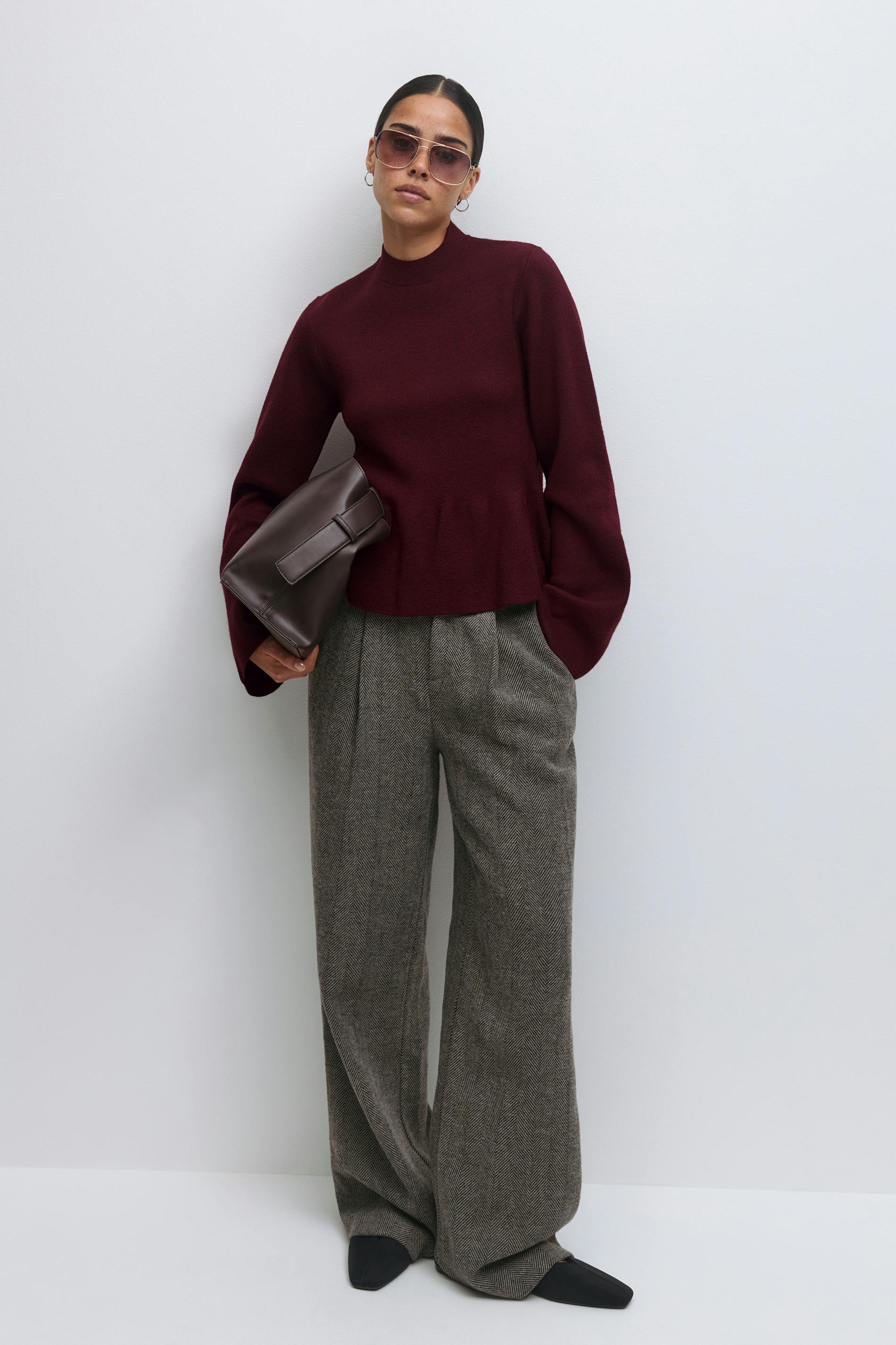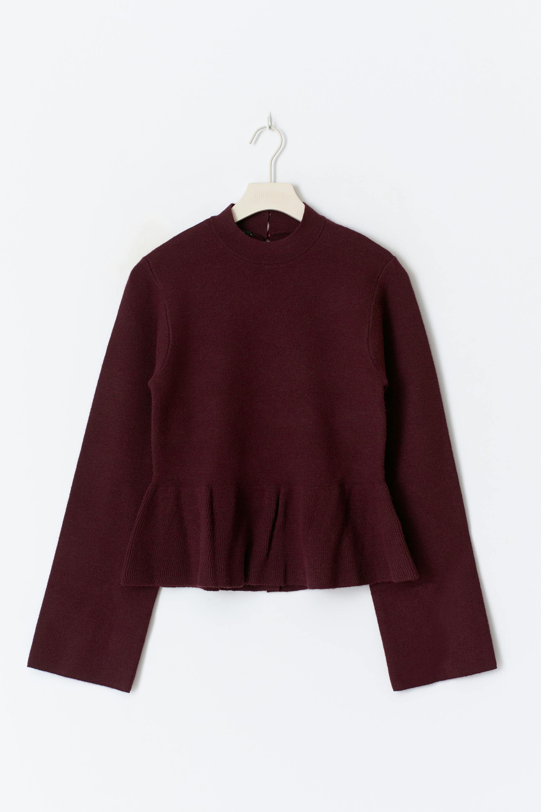 Stickad peplumtopp med volanger i nederkant. Toppen är vinröd och har en lång ärm. Den har en rund halsringning och en normal passform.