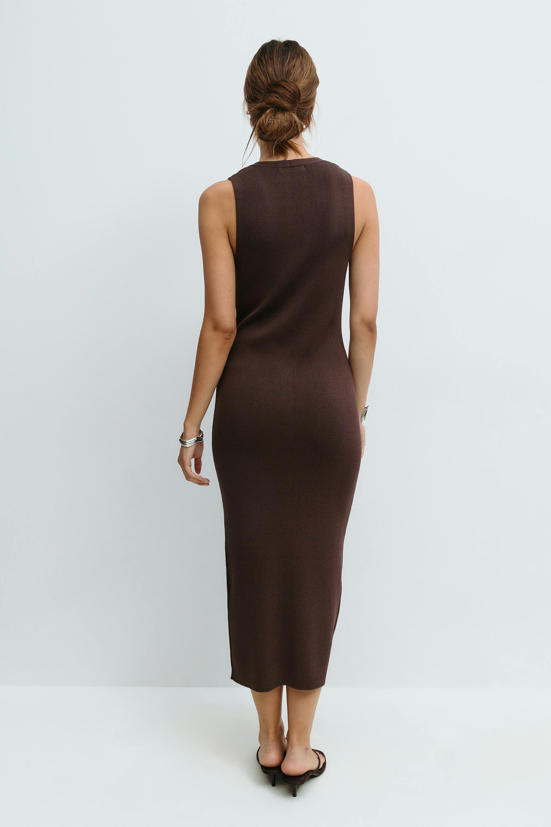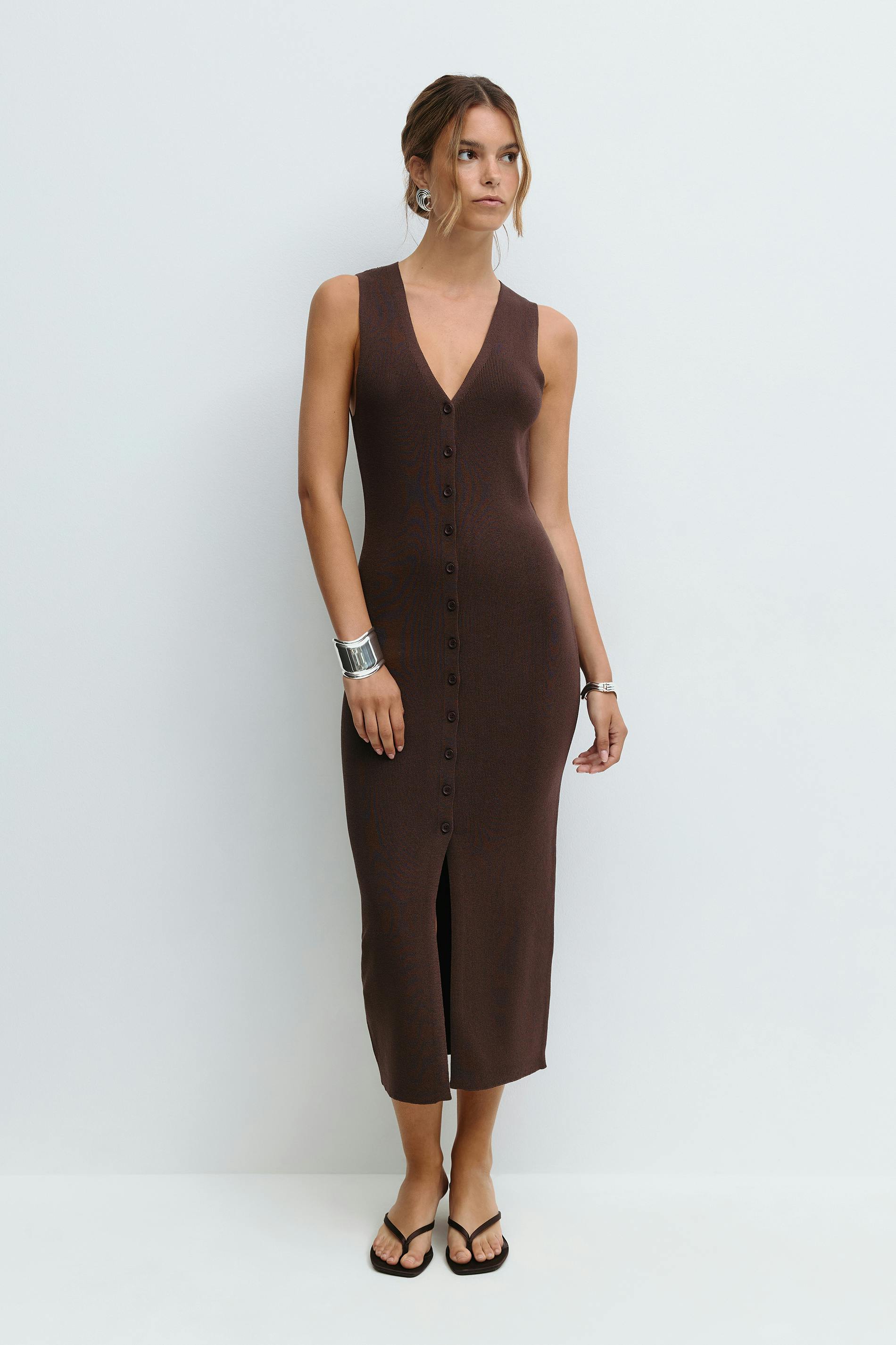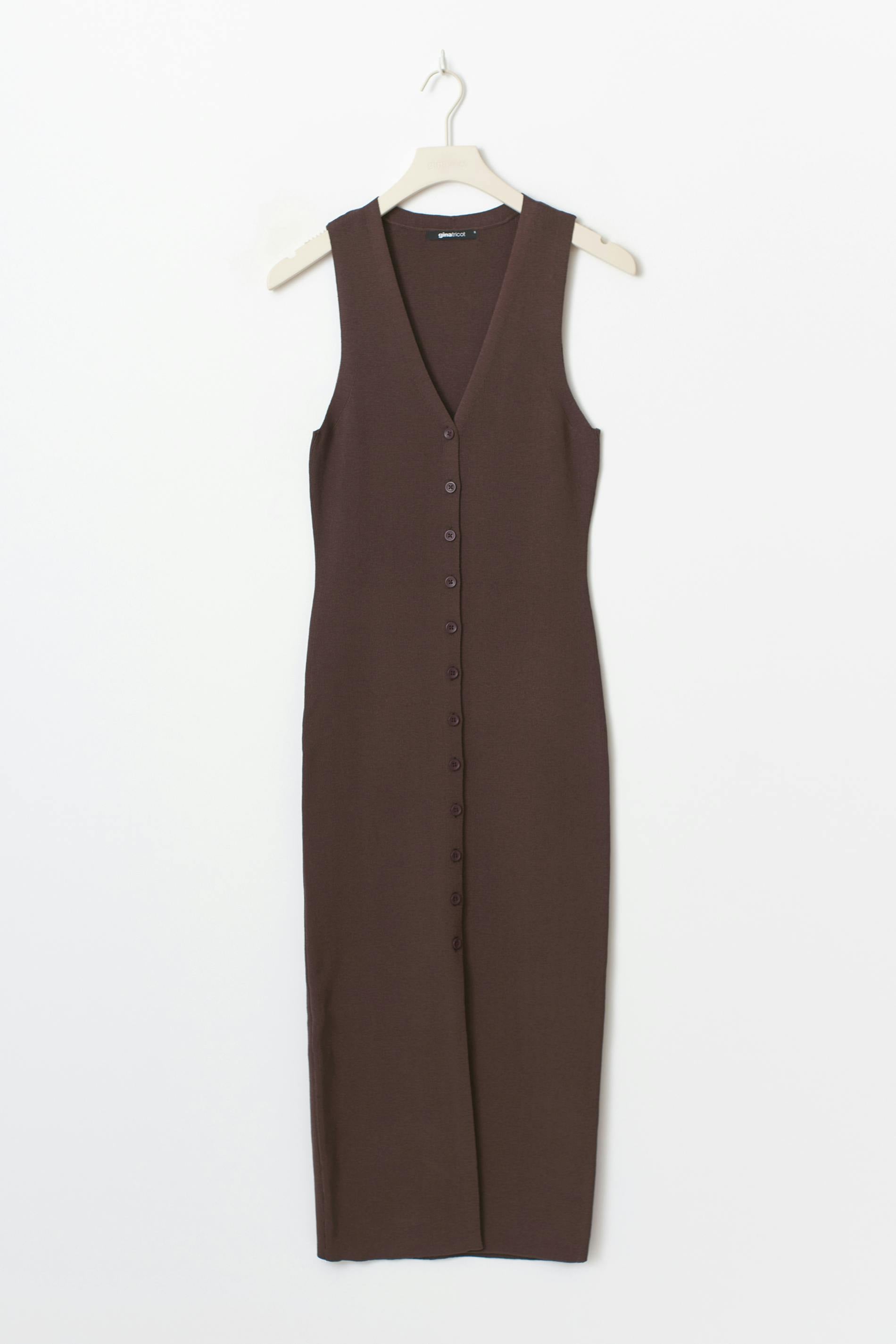 Stickad klänning med v-ringning. Klänningen är brun och ärmlös och har figurnära passform. Den har knappar framtill.