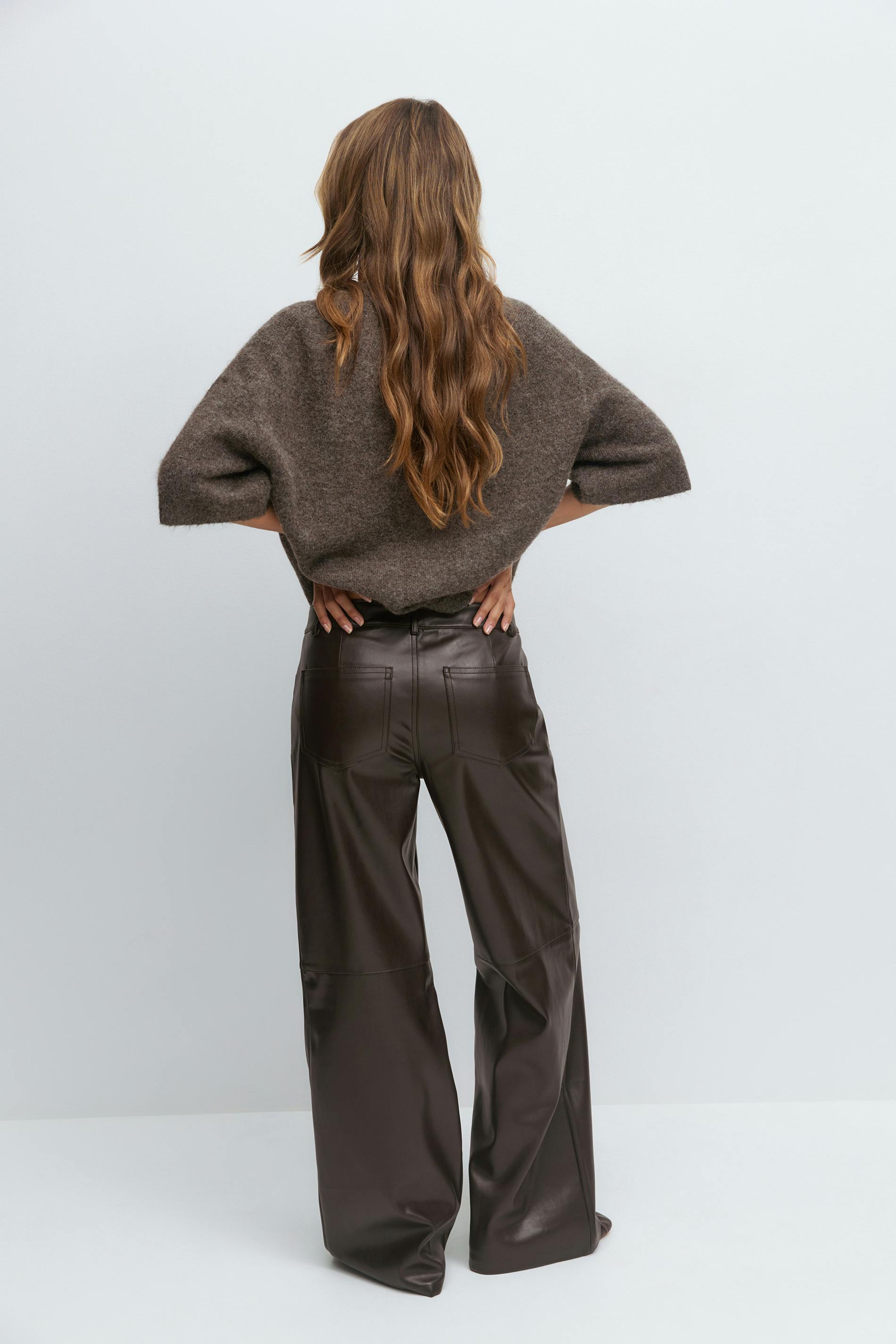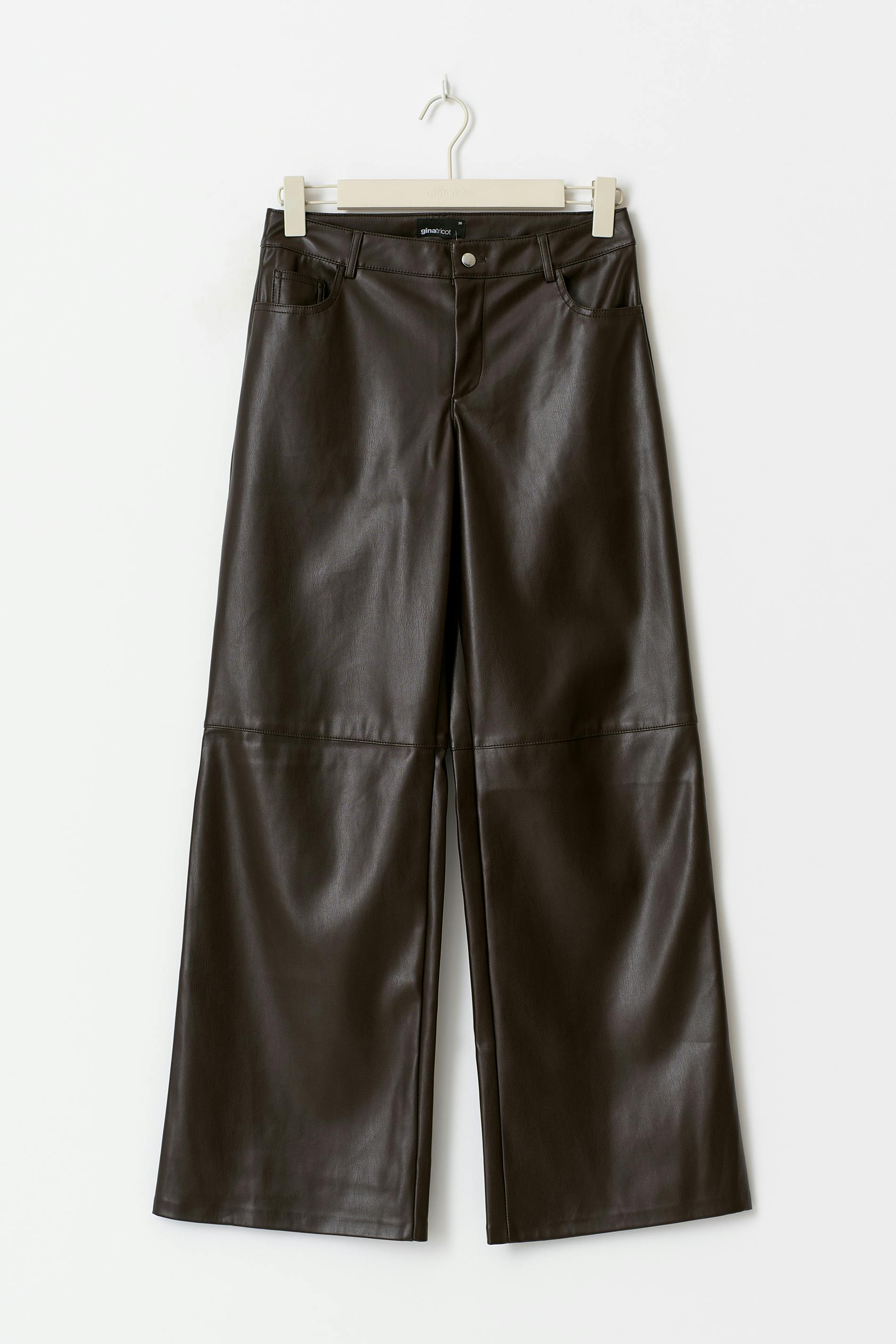 Skinnbyxor i läderimitation med rak passform. Byxorna är bruna och har dekorativ söm på knäna. De har medelhög midja, stretchigt, halvglansigt material, dragkedjegylf och fickor fram och bak.