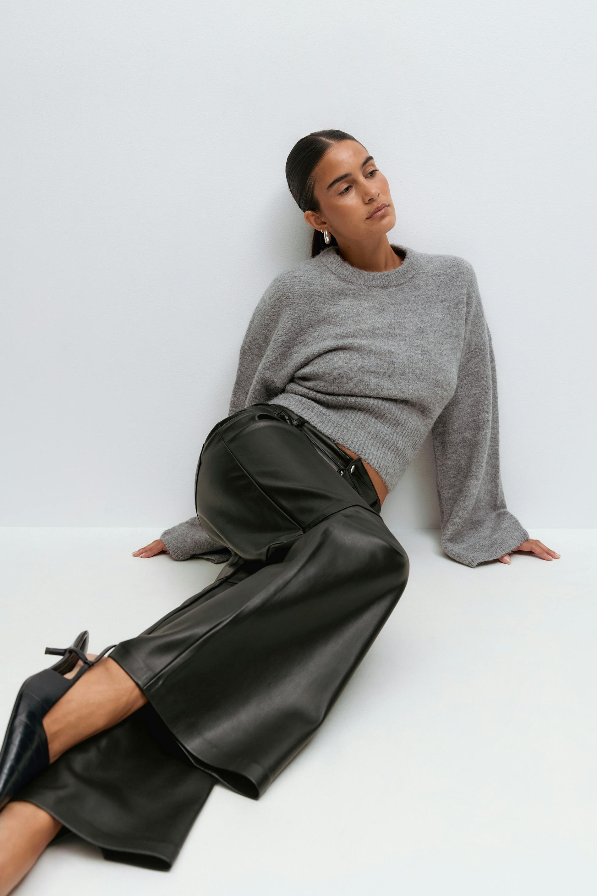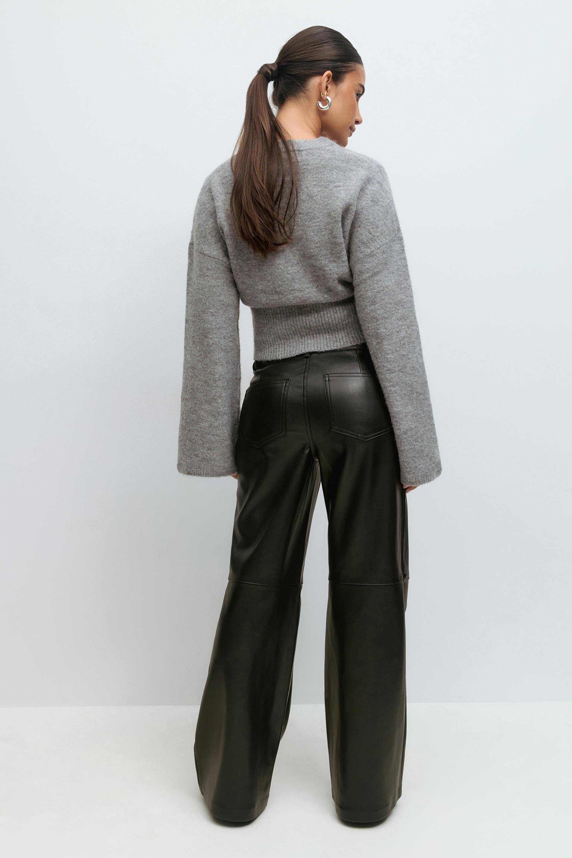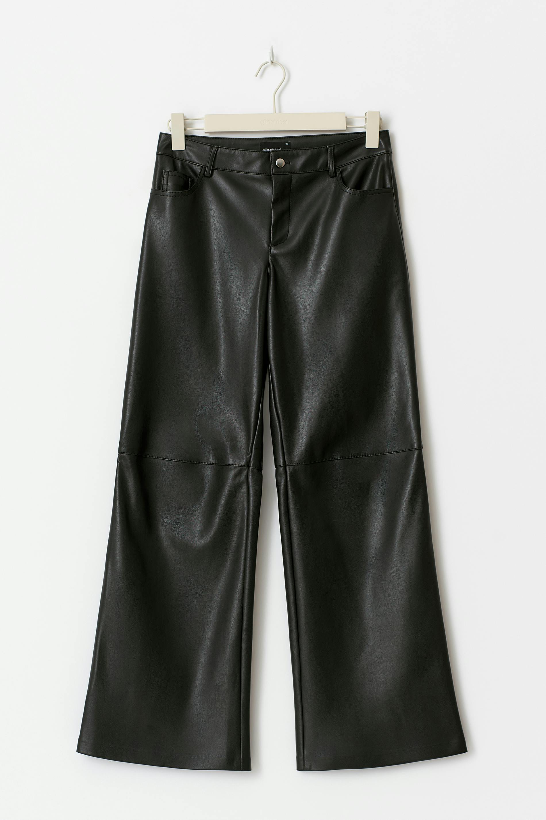 Skinnbyxor i läderimitation med rak passform. Byxorna är svarta och har dekorativ söm på knäna. De har medelhög midja, stretchigt, halvglansigt material, dragkedjegylf och fickor fram och bak.