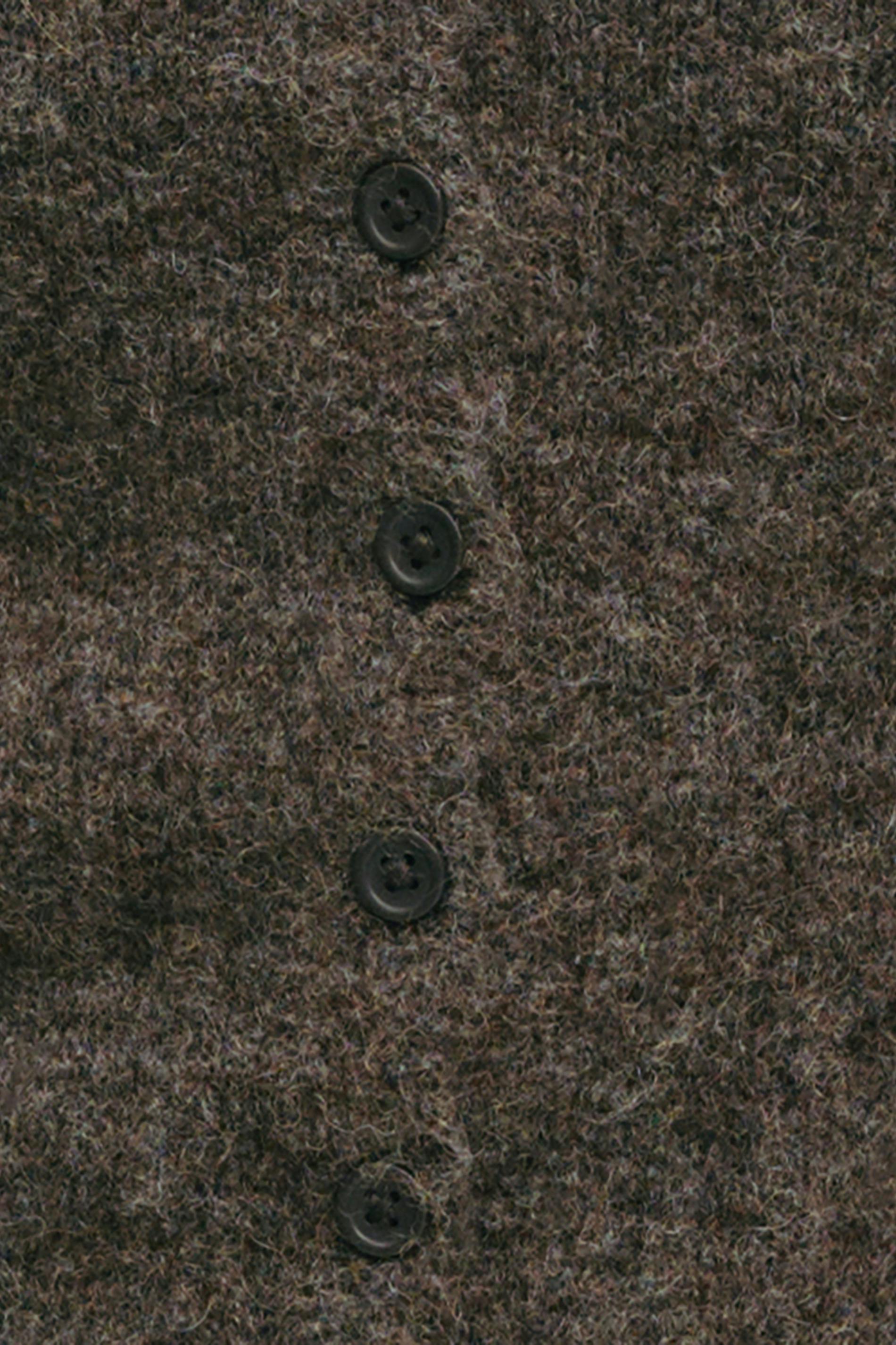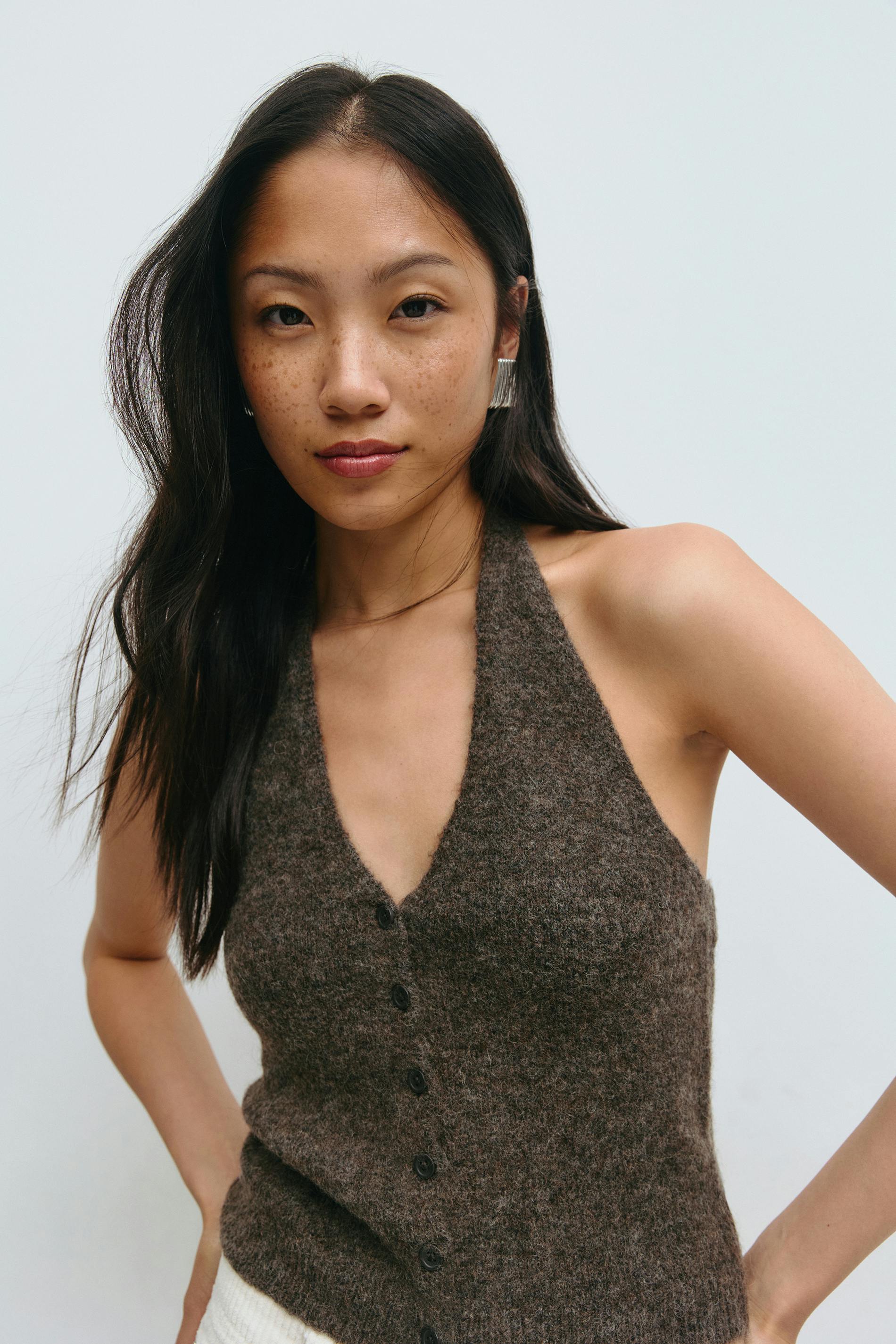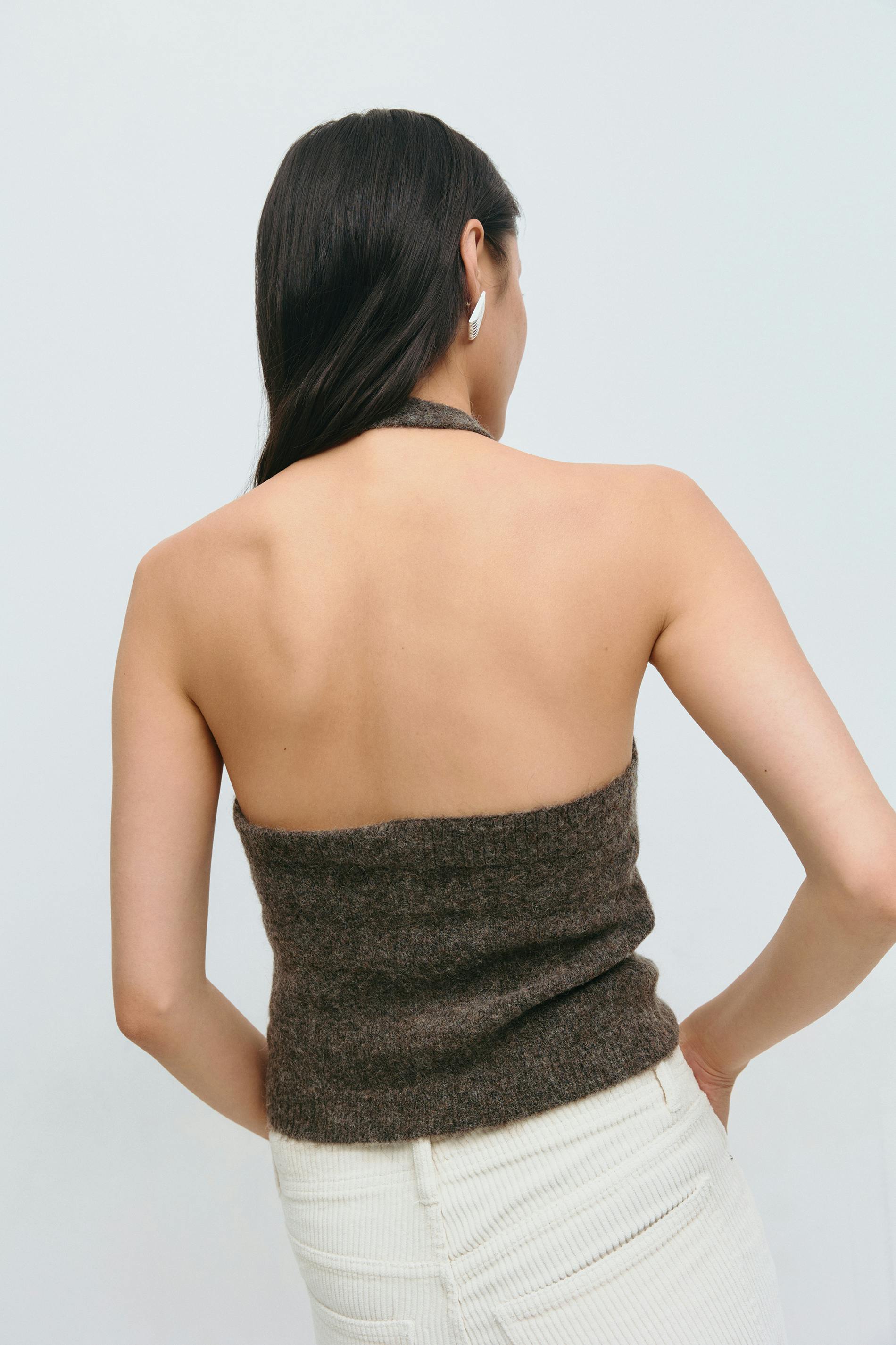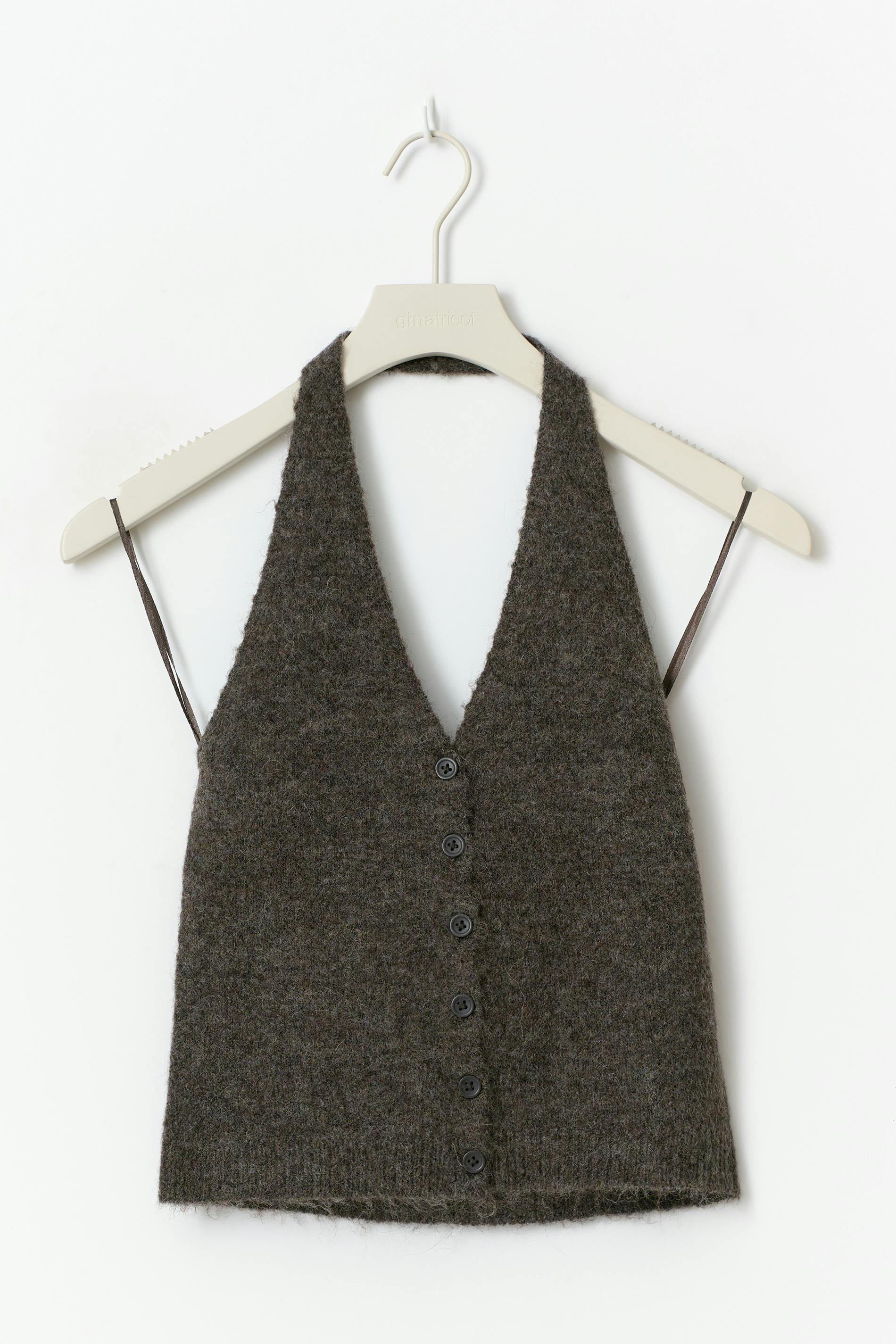 Stickad väst med en halterneck med en öppen rygg. Västen är brun och har knappar fram.