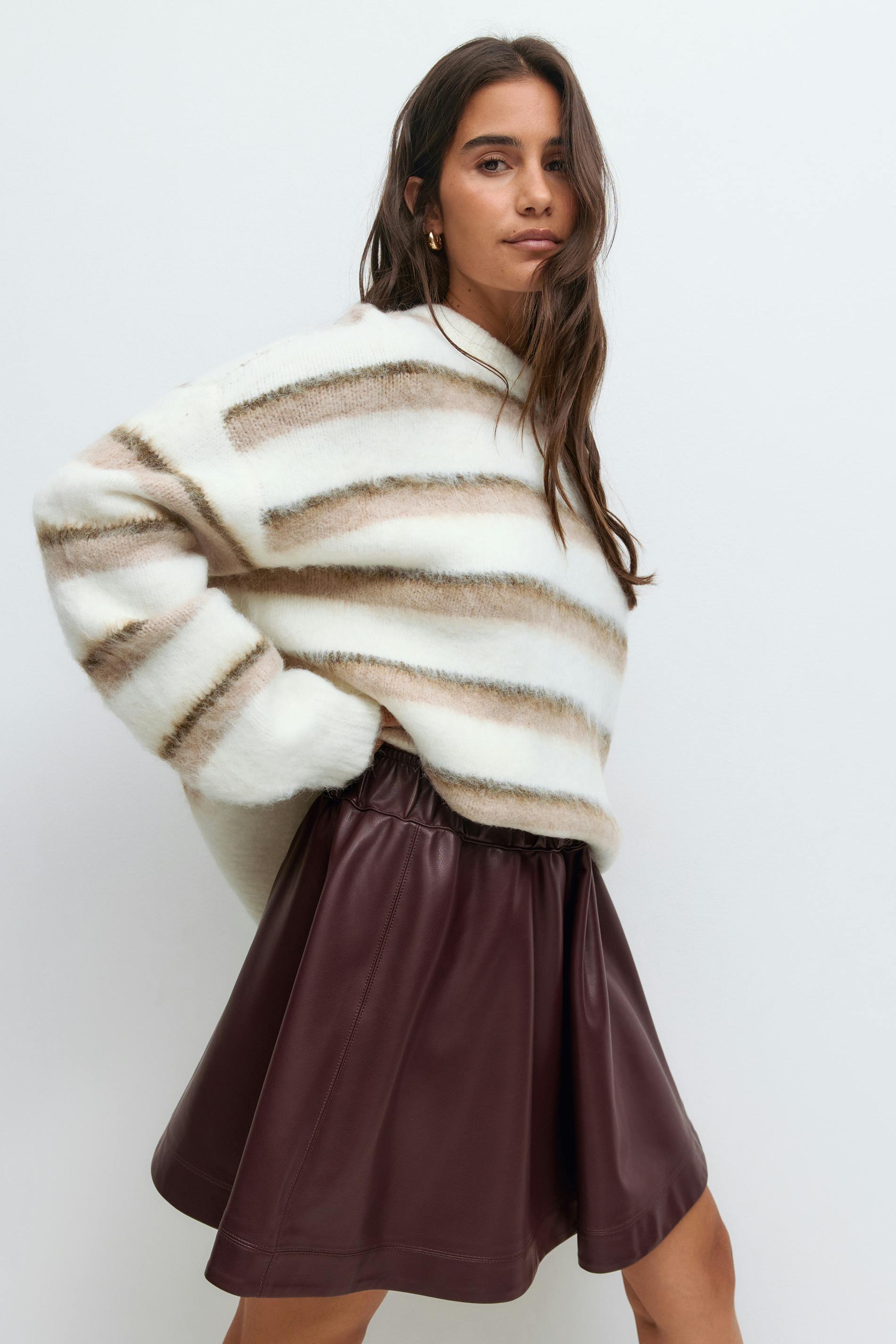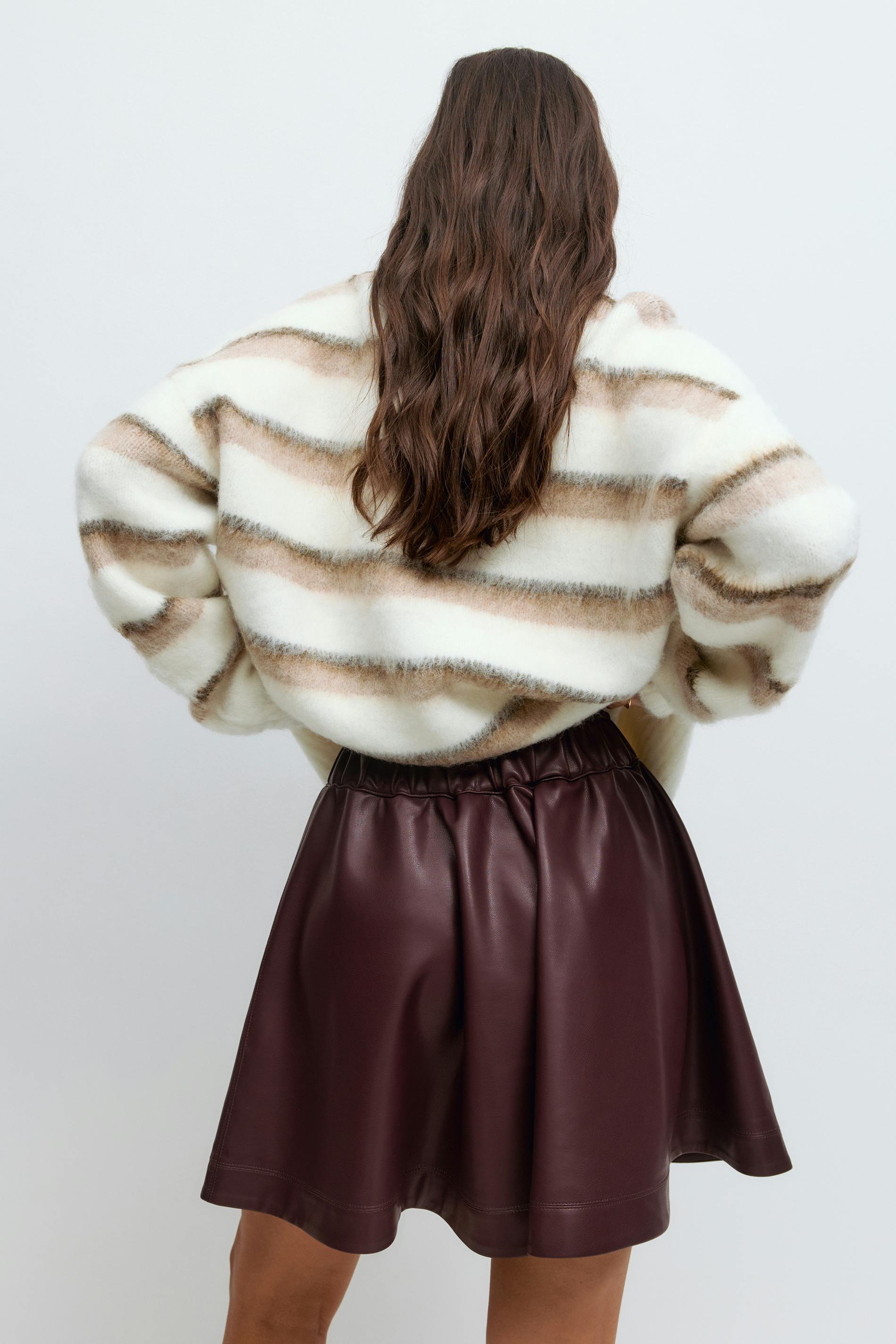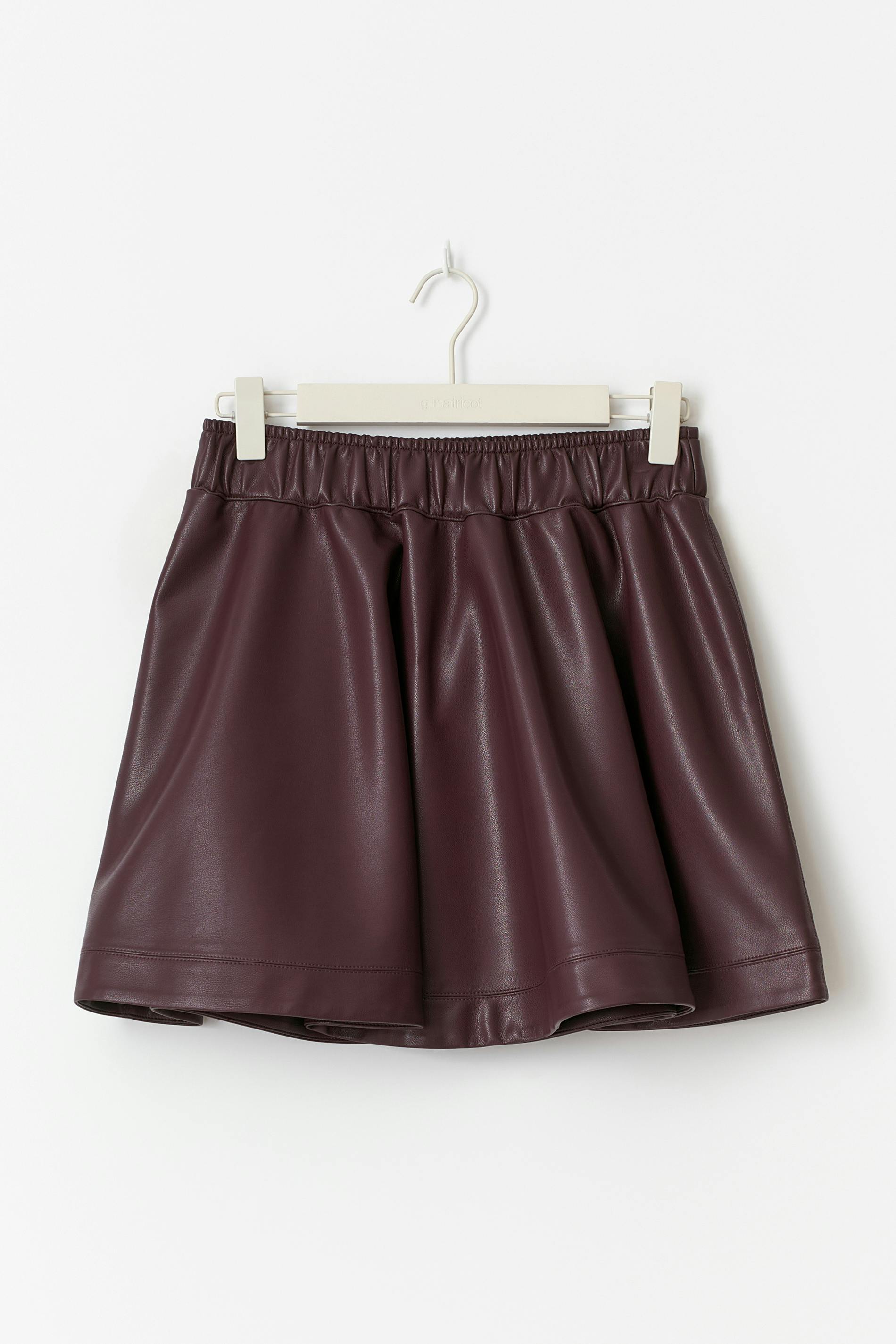 Minikjol i läderimitation med en hög midja med ett elastiskt band. Kjolen är mörklila och har en dekorativ söm nedtill.
